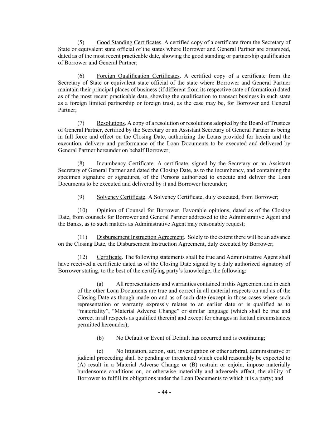 - 44 - (5) Good Standing Certificates. A certified copy of a certificate from the Secretary of State or equivalent state official of the states where Borrower and General Partner are organized, dated as of the most recent practicable date, showing the good standing or partnership qualification of Borrower and General Partner; (6) Foreign Qualification Certificates. A certified copy of a certificate from the Secretary of State or equivalent state official of the state where Borrower and General Partner maintain their principal places of business (if different from its respective state of formation) dated as of the most recent practicable date, showing the qualification to transact business in such state as a foreign limited partnership or foreign trust, as the case may be, for Borrower and General Partner; (7) Resolutions. A copy of a resolution or resolutions adopted by the Board of Trustees of General Partner, certified by the Secretary or an Assistant Secretary of General Partner as being in full force and effect on the Closing Date, authorizing the Loans provided for herein and the execution, delivery and performance of the Loan Documents to be executed and delivered by General Partner hereunder on behalf Borrower; (8) Incumbency Certificate. A certificate, signed by the Secretary or an Assistant Secretary of General Partner and dated the Closing Date, as to the incumbency, and containing the specimen signature or signatures, of the Persons authorized to execute and deliver the Loan Documents to be executed and delivered by it and Borrower hereunder; (9) Solvency Certificate. A Solvency Certificate, duly executed, from Borrower; (10) Opinion of Counsel for Borrower. Favorable opinions, dated as of the Closing Date, from counsels for Borrower and General Partner addressed to the Administrative Agent and the Banks, as to such matters as Administrative Agent may reasonably request; (11) Disbursement Instruction Agreement. Solely to the extent there will be an advance on the Closing Date, the Disbursement Instruction Agreement, duly executed by Borrower; (12) Certificate. The following statements shall be true and Administrative Agent shall have received a certificate dated as of the Closing Date signed by a duly authorized signatory of Borrower stating, to the best of the certifying party’s knowledge, the following: (a) All representations and warranties contained in this Agreement and in each of the other Loan Documents are true and correct in all material respects on and as of the Closing Date as though made on and as of such date (except in those cases where such representation or warranty expressly relates to an earlier date or is qualified as to “materiality”, “Material Adverse Change” or similar language (which shall be true and correct in all respects as qualified therein) and except for changes in factual circumstances permitted hereunder); (b) No Default or Event of Default has occurred and is continuing; (c) No litigation, action, suit, investigation or other arbitral, administrative or judicial proceeding shall be pending or threatened which could reasonably be expected to (A) result in a Material Adverse Change or (B) restrain or enjoin, impose materially burdensome conditions on, or otherwise materially and adversely affect, the ability of Borrower to fulfill its obligations under the Loan Documents to which it is a party; and