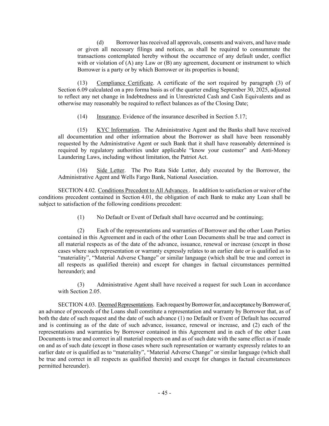- 45 - (d) Borrower has received all approvals, consents and waivers, and have made or given all necessary filings and notices, as shall be required to consummate the transactions contemplated hereby without the occurrence of any default under, conflict with or violation of (A) any Law or (B) any agreement, document or instrument to which Borrower is a party or by which Borrower or its properties is bound; (13) Compliance Certificate. A certificate of the sort required by paragraph (3) of Section 6.09 calculated on a pro forma basis as of the quarter ending September 30, 2025, adjusted to reflect any net change in Indebtedness and in Unrestricted Cash and Cash Equivalents and as otherwise may reasonably be required to reflect balances as of the Closing Date; (14) Insurance. Evidence of the insurance described in Section 5.17; (15) KYC Information. The Administrative Agent and the Banks shall have received all documentation and other information about the Borrower as shall have been reasonably requested by the Administrative Agent or such Bank that it shall have reasonably determined is required by regulatory authorities under applicable “know your customer” and Anti-Money Laundering Laws, including without limitation, the Patriot Act. (16) Side Letter. The Pro Rata Side Letter, duly executed by the Borrower, the Administrative Agent and Wells Fargo Bank, National Association. SECTION 4.02. Conditions Precedent to All Advances . In addition to satisfaction or waiver of the conditions precedent contained in Section 4.01, the obligation of each Bank to make any Loan shall be subject to satisfaction of the following conditions precedent: (1) No Default or Event of Default shall have occurred and be continuing; (2) Each of the representations and warranties of Borrower and the other Loan Parties contained in this Agreement and in each of the other Loan Documents shall be true and correct in all material respects as of the date of the advance, issuance, renewal or increase (except in those cases where such representation or warranty expressly relates to an earlier date or is qualified as to “materiality”, “Material Adverse Change” or similar language (which shall be true and correct in all respects as qualified therein) and except for changes in factual circumstances permitted hereunder); and (3) Administrative Agent shall have received a request for such Loan in accordance with Section 2.05. SECTION 4.03. Deemed Representations. Each request by Borrower for, and acceptance by Borrower of, an advance of proceeds of the Loans shall constitute a representation and warranty by Borrower that, as of both the date of such request and the date of such advance (1) no Default or Event of Default has occurred and is continuing as of the date of such advance, issuance, renewal or increase, and (2) each of the representations and warranties by Borrower contained in this Agreement and in each of the other Loan Documents is true and correct in all material respects on and as of such date with the same effect as if made on and as of such date (except in those cases where such representation or warranty expressly relates to an earlier date or is qualified as to “materiality”, “Material Adverse Change” or similar language (which shall be true and correct in all respects as qualified therein) and except for changes in factual circumstances permitted hereunder).