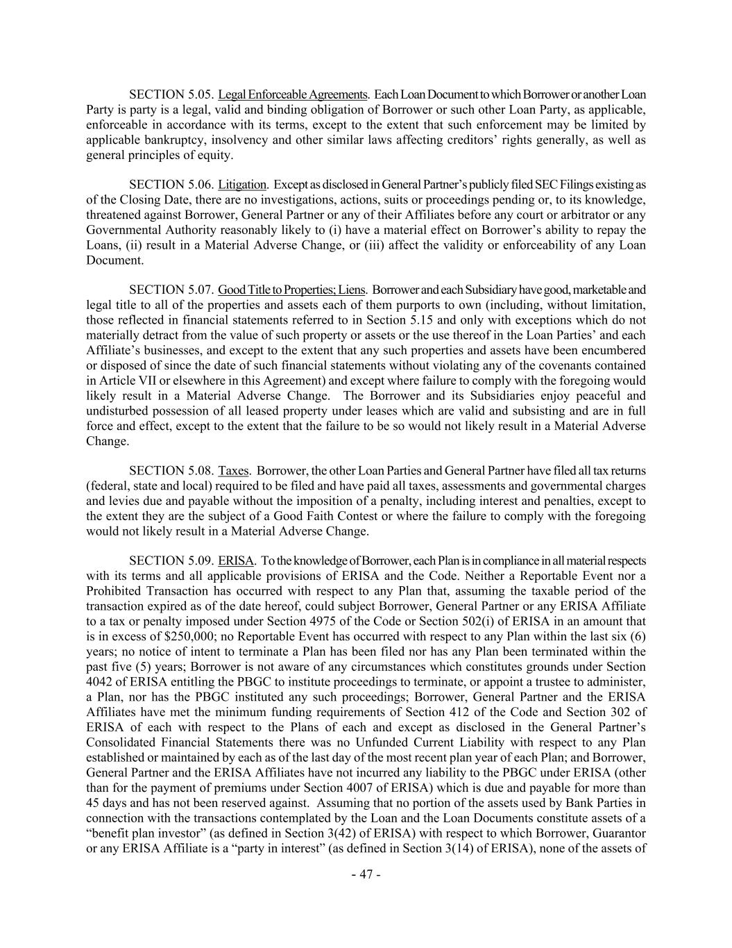 - 47 - SECTION 5.05. Legal Enforceable Agreements. Each Loan Document to which Borrower or another Loan Party is party is a legal, valid and binding obligation of Borrower or such other Loan Party, as applicable, enforceable in accordance with its terms, except to the extent that such enforcement may be limited by applicable bankruptcy, insolvency and other similar laws affecting creditors’ rights generally, as well as general principles of equity. SECTION 5.06. Litigation. Except as disclosed in General Partner’s publicly filed SEC Filings existing as of the Closing Date, there are no investigations, actions, suits or proceedings pending or, to its knowledge, threatened against Borrower, General Partner or any of their Affiliates before any court or arbitrator or any Governmental Authority reasonably likely to (i) have a material effect on Borrower’s ability to repay the Loans, (ii) result in a Material Adverse Change, or (iii) affect the validity or enforceability of any Loan Document. SECTION 5.07. Good Title to Properties; Liens. Borrower and each Subsidiary have good, marketable and legal title to all of the properties and assets each of them purports to own (including, without limitation, those reflected in financial statements referred to in Section 5.15 and only with exceptions which do not materially detract from the value of such property or assets or the use thereof in the Loan Parties’ and each Affiliate’s businesses, and except to the extent that any such properties and assets have been encumbered or disposed of since the date of such financial statements without violating any of the covenants contained in Article VII or elsewhere in this Agreement) and except where failure to comply with the foregoing would likely result in a Material Adverse Change. The Borrower and its Subsidiaries enjoy peaceful and undisturbed possession of all leased property under leases which are valid and subsisting and are in full force and effect, except to the extent that the failure to be so would not likely result in a Material Adverse Change. SECTION 5.08. Taxes. Borrower, the other Loan Parties and General Partner have filed all tax returns (federal, state and local) required to be filed and have paid all taxes, assessments and governmental charges and levies due and payable without the imposition of a penalty, including interest and penalties, except to the extent they are the subject of a Good Faith Contest or where the failure to comply with the foregoing would not likely result in a Material Adverse Change. SECTION 5.09. ERISA. To the knowledge of Borrower, each Plan is in compliance in all material respects with its terms and all applicable provisions of ERISA and the Code. Neither a Reportable Event nor a Prohibited Transaction has occurred with respect to any Plan that, assuming the taxable period of the transaction expired as of the date hereof, could subject Borrower, General Partner or any ERISA Affiliate to a tax or penalty imposed under Section 4975 of the Code or Section 502(i) of ERISA in an amount that is in excess of $250,000; no Reportable Event has occurred with respect to any Plan within the last six (6) years; no notice of intent to terminate a Plan has been filed nor has any Plan been terminated within the past five (5) years; Borrower is not aware of any circumstances which constitutes grounds under Section 4042 of ERISA entitling the PBGC to institute proceedings to terminate, or appoint a trustee to administer, a Plan, nor has the PBGC instituted any such proceedings; Borrower, General Partner and the ERISA Affiliates have met the minimum funding requirements of Section 412 of the Code and Section 302 of ERISA of each with respect to the Plans of each and except as disclosed in the General Partner’s Consolidated Financial Statements there was no Unfunded Current Liability with respect to any Plan established or maintained by each as of the last day of the most recent plan year of each Plan; and Borrower, General Partner and the ERISA Affiliates have not incurred any liability to the PBGC under ERISA (other than for the payment of premiums under Section 4007 of ERISA) which is due and payable for more than 45 days and has not been reserved against. Assuming that no portion of the assets used by Bank Parties in connection with the transactions contemplated by the Loan and the Loan Documents constitute assets of a “benefit plan investor” (as defined in Section 3(42) of ERISA) with respect to which Borrower, Guarantor or any ERISA Affiliate is a “party in interest” (as defined in Section 3(14) of ERISA), none of the assets of