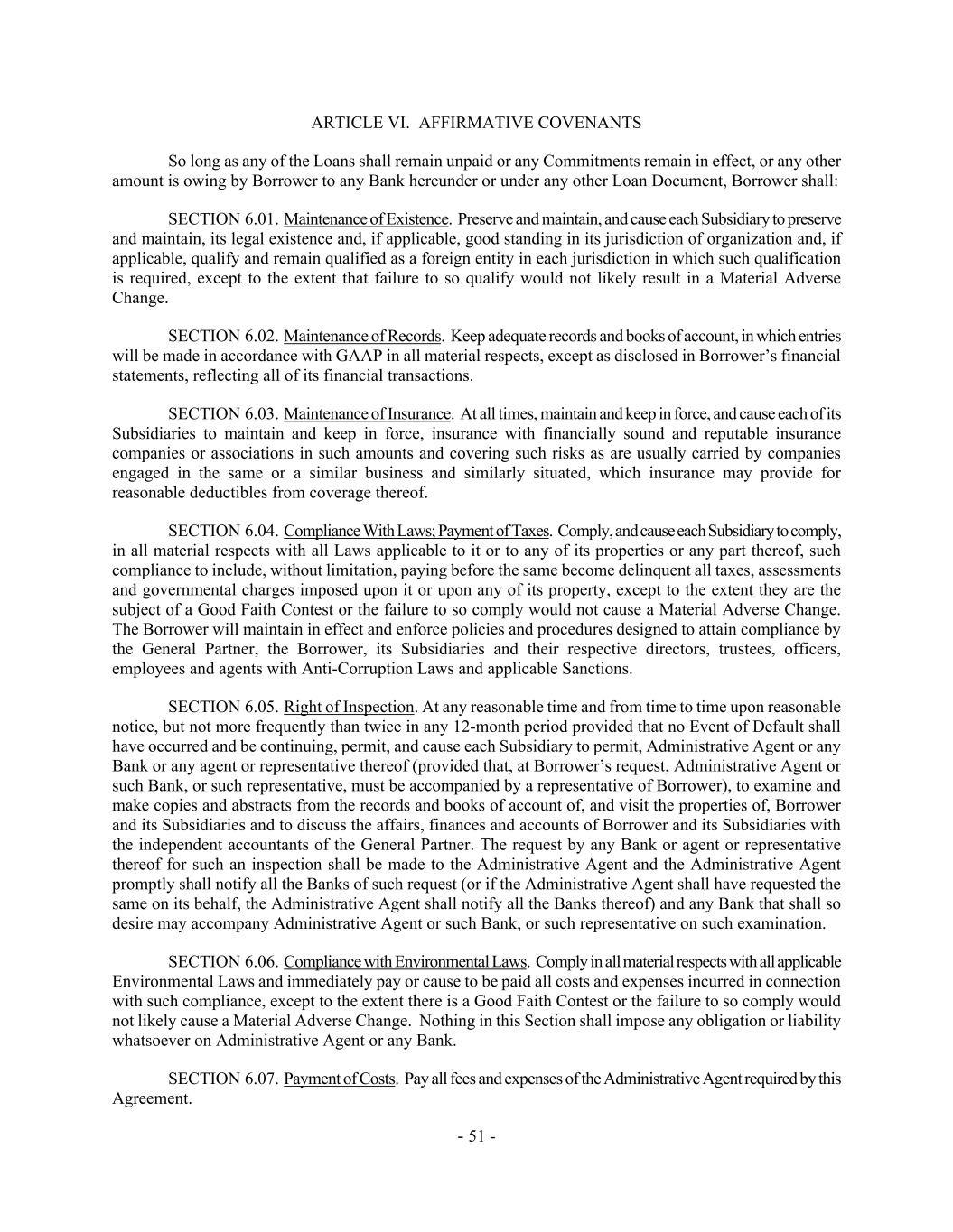 - 51 - ARTICLE VI. AFFIRMATIVE COVENANTS So long as any of the Loans shall remain unpaid or any Commitments remain in effect, or any other amount is owing by Borrower to any Bank hereunder or under any other Loan Document, Borrower shall: SECTION 6.01. Maintenance of Existence. Preserve and maintain, and cause each Subsidiary to preserve and maintain, its legal existence and, if applicable, good standing in its jurisdiction of organization and, if applicable, qualify and remain qualified as a foreign entity in each jurisdiction in which such qualification is required, except to the extent that failure to so qualify would not likely result in a Material Adverse Change. SECTION 6.02. Maintenance of Records. Keep adequate records and books of account, in which entries will be made in accordance with GAAP in all material respects, except as disclosed in Borrower’s financial statements, reflecting all of its financial transactions. SECTION 6.03. Maintenance of Insurance. At all times, maintain and keep in force, and cause each of its Subsidiaries to maintain and keep in force, insurance with financially sound and reputable insurance companies or associations in such amounts and covering such risks as are usually carried by companies engaged in the same or a similar business and similarly situated, which insurance may provide for reasonable deductibles from coverage thereof. SECTION 6.04. Compliance With Laws; Payment of Taxes. Comply, and cause each Subsidiary to comply, in all material respects with all Laws applicable to it or to any of its properties or any part thereof, such compliance to include, without limitation, paying before the same become delinquent all taxes, assessments and governmental charges imposed upon it or upon any of its property, except to the extent they are the subject of a Good Faith Contest or the failure to so comply would not cause a Material Adverse Change. The Borrower will maintain in effect and enforce policies and procedures designed to attain compliance by the General Partner, the Borrower, its Subsidiaries and their respective directors, trustees, officers, employees and agents with Anti-Corruption Laws and applicable Sanctions. SECTION 6.05. Right of Inspection. At any reasonable time and from time to time upon reasonable notice, but not more frequently than twice in any 12-month period provided that no Event of Default shall have occurred and be continuing, permit, and cause each Subsidiary to permit, Administrative Agent or any Bank or any agent or representative thereof (provided that, at Borrower’s request, Administrative Agent or such Bank, or such representative, must be accompanied by a representative of Borrower), to examine and make copies and abstracts from the records and books of account of, and visit the properties of, Borrower and its Subsidiaries and to discuss the affairs, finances and accounts of Borrower and its Subsidiaries with the independent accountants of the General Partner. The request by any Bank or agent or representative thereof for such an inspection shall be made to the Administrative Agent and the Administrative Agent promptly shall notify all the Banks of such request (or if the Administrative Agent shall have requested the same on its behalf, the Administrative Agent shall notify all the Banks thereof) and any Bank that shall so desire may accompany Administrative Agent or such Bank, or such representative on such examination. SECTION 6.06. Compliance with Environmental Laws. Comply in all material respects with all applicable Environmental Laws and immediately pay or cause to be paid all costs and expenses incurred in connection with such compliance, except to the extent there is a Good Faith Contest or the failure to so comply would not likely cause a Material Adverse Change. Nothing in this Section shall impose any obligation or liability whatsoever on Administrative Agent or any Bank. SECTION 6.07. Payment of Costs. Pay all fees and expenses of the Administrative Agent required by this Agreement.