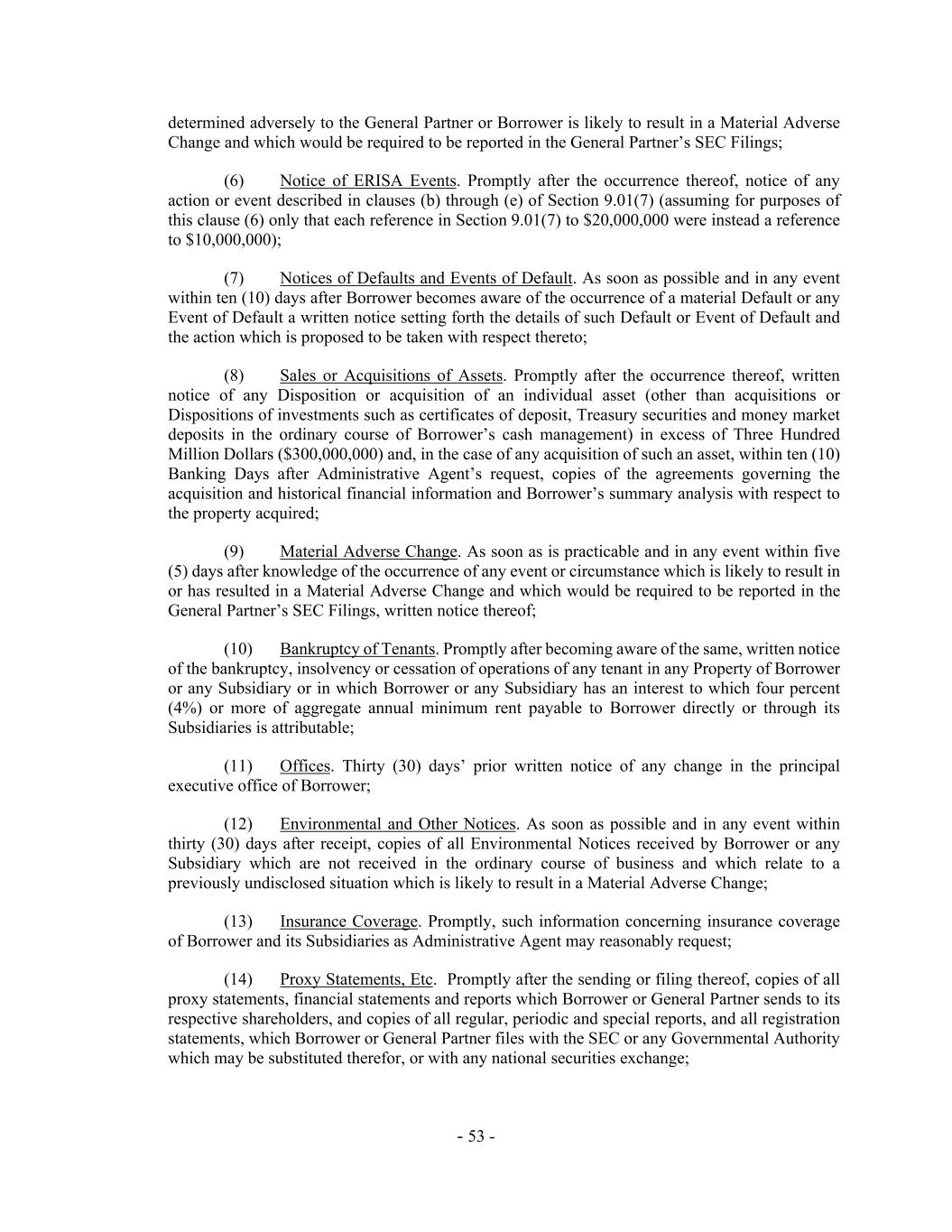 - 53 - determined adversely to the General Partner or Borrower is likely to result in a Material Adverse Change and which would be required to be reported in the General Partner’s SEC Filings; (6) Notice of ERISA Events. Promptly after the occurrence thereof, notice of any action or event described in clauses (b) through (e) of Section 9.01(7) (assuming for purposes of this clause (6) only that each reference in Section 9.01(7) to $20,000,000 were instead a reference to $10,000,000); (7) Notices of Defaults and Events of Default. As soon as possible and in any event within ten (10) days after Borrower becomes aware of the occurrence of a material Default or any Event of Default a written notice setting forth the details of such Default or Event of Default and the action which is proposed to be taken with respect thereto; (8) Sales or Acquisitions of Assets. Promptly after the occurrence thereof, written notice of any Disposition or acquisition of an individual asset (other than acquisitions or Dispositions of investments such as certificates of deposit, Treasury securities and money market deposits in the ordinary course of Borrower’s cash management) in excess of Three Hundred Million Dollars ($300,000,000) and, in the case of any acquisition of such an asset, within ten (10) Banking Days after Administrative Agent’s request, copies of the agreements governing the acquisition and historical financial information and Borrower’s summary analysis with respect to the property acquired; (9) Material Adverse Change. As soon as is practicable and in any event within five (5) days after knowledge of the occurrence of any event or circumstance which is likely to result in or has resulted in a Material Adverse Change and which would be required to be reported in the General Partner’s SEC Filings, written notice thereof; (10) Bankruptcy of Tenants. Promptly after becoming aware of the same, written notice of the bankruptcy, insolvency or cessation of operations of any tenant in any Property of Borrower or any Subsidiary or in which Borrower or any Subsidiary has an interest to which four percent (4%) or more of aggregate annual minimum rent payable to Borrower directly or through its Subsidiaries is attributable; (11) Offices. Thirty (30) days’ prior written notice of any change in the principal executive office of Borrower; (12) Environmental and Other Notices. As soon as possible and in any event within thirty (30) days after receipt, copies of all Environmental Notices received by Borrower or any Subsidiary which are not received in the ordinary course of business and which relate to a previously undisclosed situation which is likely to result in a Material Adverse Change; (13) Insurance Coverage. Promptly, such information concerning insurance coverage of Borrower and its Subsidiaries as Administrative Agent may reasonably request; (14) Proxy Statements, Etc. Promptly after the sending or filing thereof, copies of all proxy statements, financial statements and reports which Borrower or General Partner sends to its respective shareholders, and copies of all regular, periodic and special reports, and all registration statements, which Borrower or General Partner files with the SEC or any Governmental Authority which may be substituted therefor, or with any national securities exchange;