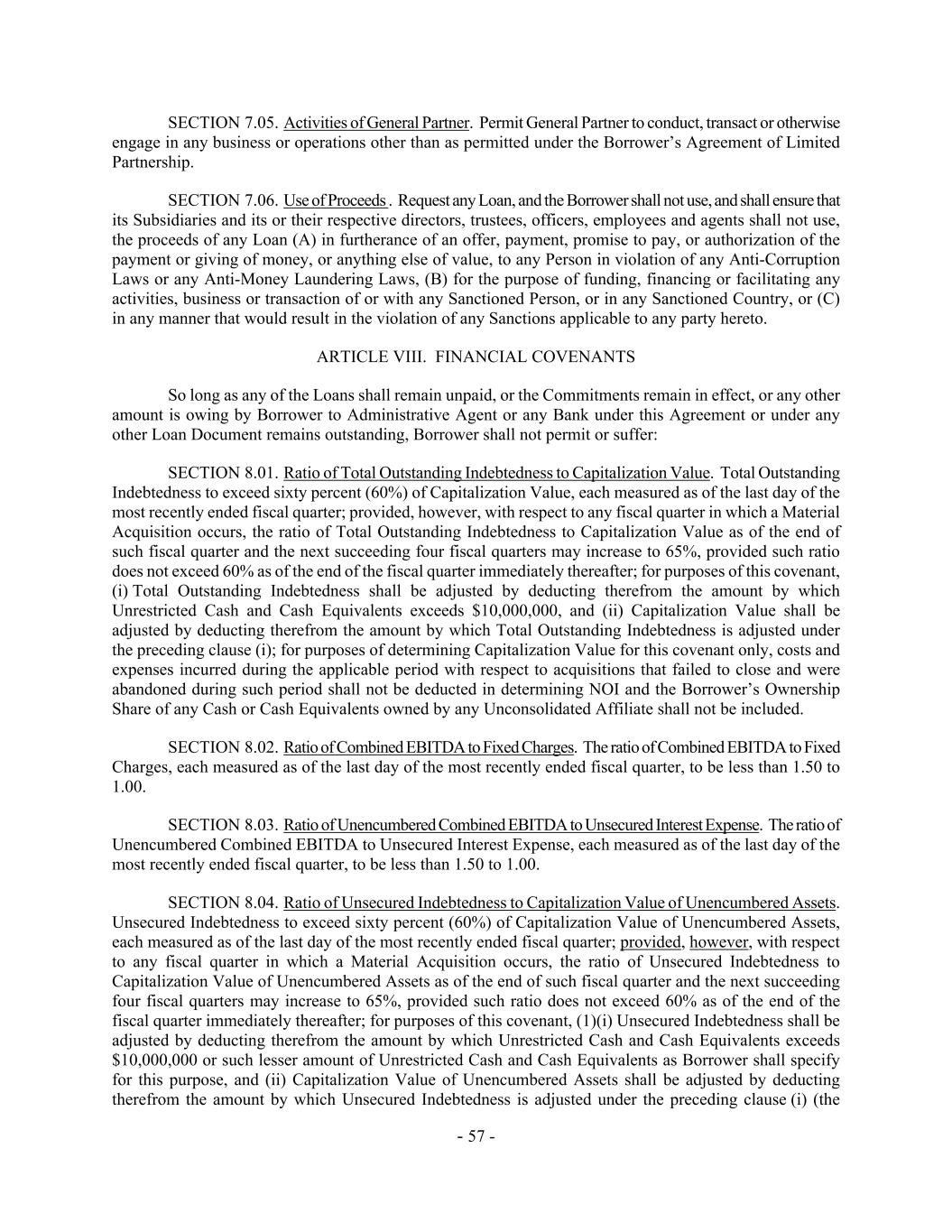 - 57 - SECTION 7.05. Activities of General Partner. Permit General Partner to conduct, transact or otherwise engage in any business or operations other than as permitted under the Borrower’s Agreement of Limited Partnership. SECTION 7.06. Use of Proceeds . Request any Loan, and the Borrower shall not use, and shall ensure that its Subsidiaries and its or their respective directors, trustees, officers, employees and agents shall not use, the proceeds of any Loan (A) in furtherance of an offer, payment, promise to pay, or authorization of the payment or giving of money, or anything else of value, to any Person in violation of any Anti-Corruption Laws or any Anti-Money Laundering Laws, (B) for the purpose of funding, financing or facilitating any activities, business or transaction of or with any Sanctioned Person, or in any Sanctioned Country, or (C) in any manner that would result in the violation of any Sanctions applicable to any party hereto. ARTICLE VIII. FINANCIAL COVENANTS So long as any of the Loans shall remain unpaid, or the Commitments remain in effect, or any other amount is owing by Borrower to Administrative Agent or any Bank under this Agreement or under any other Loan Document remains outstanding, Borrower shall not permit or suffer: SECTION 8.01. Ratio of Total Outstanding Indebtedness to Capitalization Value. Total Outstanding Indebtedness to exceed sixty percent (60%) of Capitalization Value, each measured as of the last day of the most recently ended fiscal quarter; provided, however, with respect to any fiscal quarter in which a Material Acquisition occurs, the ratio of Total Outstanding Indebtedness to Capitalization Value as of the end of such fiscal quarter and the next succeeding four fiscal quarters may increase to 65%, provided such ratio does not exceed 60% as of the end of the fiscal quarter immediately thereafter; for purposes of this covenant, (i) Total Outstanding Indebtedness shall be adjusted by deducting therefrom the amount by which Unrestricted Cash and Cash Equivalents exceeds $10,000,000, and (ii) Capitalization Value shall be adjusted by deducting therefrom the amount by which Total Outstanding Indebtedness is adjusted under the preceding clause (i); for purposes of determining Capitalization Value for this covenant only, costs and expenses incurred during the applicable period with respect to acquisitions that failed to close and were abandoned during such period shall not be deducted in determining NOI and the Borrower’s Ownership Share of any Cash or Cash Equivalents owned by any Unconsolidated Affiliate shall not be included. SECTION 8.02. Ratio of Combined EBITDA to Fixed Charges. The ratio of Combined EBITDA to Fixed Charges, each measured as of the last day of the most recently ended fiscal quarter, to be less than 1.50 to 1.00. SECTION 8.03. Ratio of Unencumbered Combined EBITDA to Unsecured Interest Expense. The ratio of Unencumbered Combined EBITDA to Unsecured Interest Expense, each measured as of the last day of the most recently ended fiscal quarter, to be less than 1.50 to 1.00. SECTION 8.04. Ratio of Unsecured Indebtedness to Capitalization Value of Unencumbered Assets. Unsecured Indebtedness to exceed sixty percent (60%) of Capitalization Value of Unencumbered Assets, each measured as of the last day of the most recently ended fiscal quarter; provided, however, with respect to any fiscal quarter in which a Material Acquisition occurs, the ratio of Unsecured Indebtedness to Capitalization Value of Unencumbered Assets as of the end of such fiscal quarter and the next succeeding four fiscal quarters may increase to 65%, provided such ratio does not exceed 60% as of the end of the fiscal quarter immediately thereafter; for purposes of this covenant, (1)(i) Unsecured Indebtedness shall be adjusted by deducting therefrom the amount by which Unrestricted Cash and Cash Equivalents exceeds $10,000,000 or such lesser amount of Unrestricted Cash and Cash Equivalents as Borrower shall specify for this purpose, and (ii) Capitalization Value of Unencumbered Assets shall be adjusted by deducting therefrom the amount by which Unsecured Indebtedness is adjusted under the preceding clause (i) (the