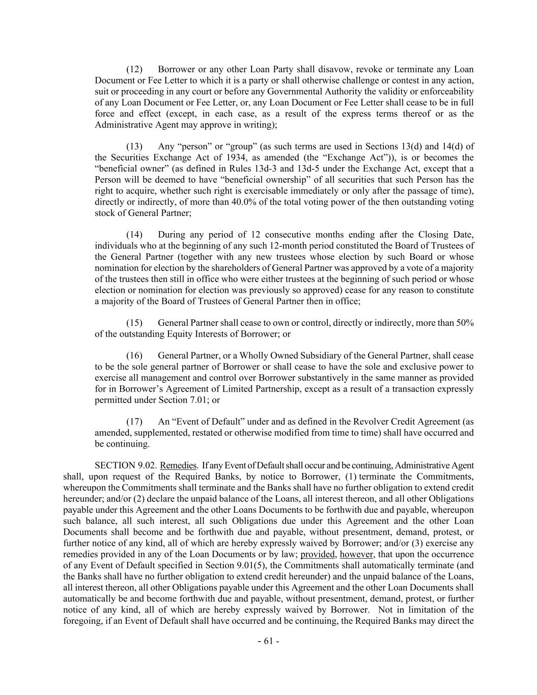 - 61 - (12) Borrower or any other Loan Party shall disavow, revoke or terminate any Loan Document or Fee Letter to which it is a party or shall otherwise challenge or contest in any action, suit or proceeding in any court or before any Governmental Authority the validity or enforceability of any Loan Document or Fee Letter, or, any Loan Document or Fee Letter shall cease to be in full force and effect (except, in each case, as a result of the express terms thereof or as the Administrative Agent may approve in writing); (13) Any “person” or “group” (as such terms are used in Sections 13(d) and 14(d) of the Securities Exchange Act of 1934, as amended (the “Exchange Act”)), is or becomes the “beneficial owner” (as defined in Rules 13d-3 and 13d-5 under the Exchange Act, except that a Person will be deemed to have “beneficial ownership” of all securities that such Person has the right to acquire, whether such right is exercisable immediately or only after the passage of time), directly or indirectly, of more than 40.0% of the total voting power of the then outstanding voting stock of General Partner; (14) During any period of 12 consecutive months ending after the Closing Date, individuals who at the beginning of any such 12-month period constituted the Board of Trustees of the General Partner (together with any new trustees whose election by such Board or whose nomination for election by the shareholders of General Partner was approved by a vote of a majority of the trustees then still in office who were either trustees at the beginning of such period or whose election or nomination for election was previously so approved) cease for any reason to constitute a majority of the Board of Trustees of General Partner then in office; (15) General Partner shall cease to own or control, directly or indirectly, more than 50% of the outstanding Equity Interests of Borrower; or (16) General Partner, or a Wholly Owned Subsidiary of the General Partner, shall cease to be the sole general partner of Borrower or shall cease to have the sole and exclusive power to exercise all management and control over Borrower substantively in the same manner as provided for in Borrower’s Agreement of Limited Partnership, except as a result of a transaction expressly permitted under Section 7.01; or (17) An “Event of Default” under and as defined in the Revolver Credit Agreement (as amended, supplemented, restated or otherwise modified from time to time) shall have occurred and be continuing. SECTION 9.02. Remedies. If any Event of Default shall occur and be continuing, Administrative Agent shall, upon request of the Required Banks, by notice to Borrower, (1) terminate the Commitments, whereupon the Commitments shall terminate and the Banks shall have no further obligation to extend credit hereunder; and/or (2) declare the unpaid balance of the Loans, all interest thereon, and all other Obligations payable under this Agreement and the other Loans Documents to be forthwith due and payable, whereupon such balance, all such interest, all such Obligations due under this Agreement and the other Loan Documents shall become and be forthwith due and payable, without presentment, demand, protest, or further notice of any kind, all of which are hereby expressly waived by Borrower; and/or (3) exercise any remedies provided in any of the Loan Documents or by law; provided, however, that upon the occurrence of any Event of Default specified in Section 9.01(5), the Commitments shall automatically terminate (and the Banks shall have no further obligation to extend credit hereunder) and the unpaid balance of the Loans, all interest thereon, all other Obligations payable under this Agreement and the other Loan Documents shall automatically be and become forthwith due and payable, without presentment, demand, protest, or further notice of any kind, all of which are hereby expressly waived by Borrower. Not in limitation of the foregoing, if an Event of Default shall have occurred and be continuing, the Required Banks may direct the