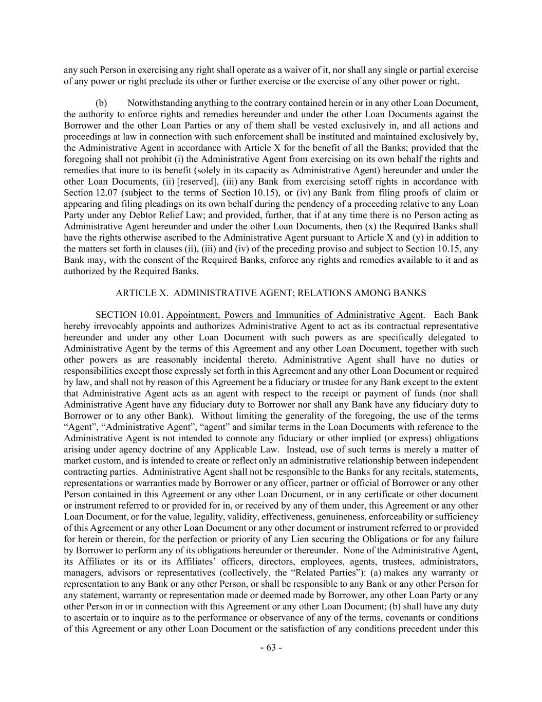 - 63 - any such Person in exercising any right shall operate as a waiver of it, nor shall any single or partial exercise of any power or right preclude its other or further exercise or the exercise of any other power or right. (b) Notwithstanding anything to the contrary contained herein or in any other Loan Document, the authority to enforce rights and remedies hereunder and under the other Loan Documents against the Borrower and the other Loan Parties or any of them shall be vested exclusively in, and all actions and proceedings at law in connection with such enforcement shall be instituted and maintained exclusively by, the Administrative Agent in accordance with Article X for the benefit of all the Banks; provided that the foregoing shall not prohibit (i) the Administrative Agent from exercising on its own behalf the rights and remedies that inure to its benefit (solely in its capacity as Administrative Agent) hereunder and under the other Loan Documents, (ii) [reserved], (iii) any Bank from exercising setoff rights in accordance with Section 12.07 (subject to the terms of Section 10.15), or (iv) any Bank from filing proofs of claim or appearing and filing pleadings on its own behalf during the pendency of a proceeding relative to any Loan Party under any Debtor Relief Law; and provided, further, that if at any time there is no Person acting as Administrative Agent hereunder and under the other Loan Documents, then (x) the Required Banks shall have the rights otherwise ascribed to the Administrative Agent pursuant to Article X and (y) in addition to the matters set forth in clauses (ii), (iii) and (iv) of the preceding proviso and subject to Section 10.15, any Bank may, with the consent of the Required Banks, enforce any rights and remedies available to it and as authorized by the Required Banks. ARTICLE X. ADMINISTRATIVE AGENT; RELATIONS AMONG BANKS SECTION 10.01. Appointment, Powers and Immunities of Administrative Agent. Each Bank hereby irrevocably appoints and authorizes Administrative Agent to act as its contractual representative hereunder and under any other Loan Document with such powers as are specifically delegated to Administrative Agent by the terms of this Agreement and any other Loan Document, together with such other powers as are reasonably incidental thereto. Administrative Agent shall have no duties or responsibilities except those expressly set forth in this Agreement and any other Loan Document or required by law, and shall not by reason of this Agreement be a fiduciary or trustee for any Bank except to the extent that Administrative Agent acts as an agent with respect to the receipt or payment of funds (nor shall Administrative Agent have any fiduciary duty to Borrower nor shall any Bank have any fiduciary duty to Borrower or to any other Bank). Without limiting the generality of the foregoing, the use of the terms “Agent”, “Administrative Agent”, “agent” and similar terms in the Loan Documents with reference to the Administrative Agent is not intended to connote any fiduciary or other implied (or express) obligations arising under agency doctrine of any Applicable Law. Instead, use of such terms is merely a matter of market custom, and is intended to create or reflect only an administrative relationship between independent contracting parties. Administrative Agent shall not be responsible to the Banks for any recitals, statements, representations or warranties made by Borrower or any officer, partner or official of Borrower or any other Person contained in this Agreement or any other Loan Document, or in any certificate or other document or instrument referred to or provided for in, or received by any of them under, this Agreement or any other Loan Document, or for the value, legality, validity, effectiveness, genuineness, enforceability or sufficiency of this Agreement or any other Loan Document or any other document or instrument referred to or provided for herein or therein, for the perfection or priority of any Lien securing the Obligations or for any failure by Borrower to perform any of its obligations hereunder or thereunder. None of the Administrative Agent, its Affiliates or its or its Affiliates’ officers, directors, employees, agents, trustees, administrators, managers, advisors or representatives (collectively, the “Related Parties”): (a) makes any warranty or representation to any Bank or any other Person, or shall be responsible to any Bank or any other Person for any statement, warranty or representation made or deemed made by Borrower, any other Loan Party or any other Person in or in connection with this Agreement or any other Loan Document; (b) shall have any duty to ascertain or to inquire as to the performance or observance of any of the terms, covenants or conditions of this Agreement or any other Loan Document or the satisfaction of any conditions precedent under this
