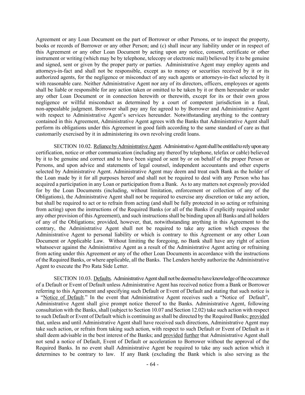 - 64 - Agreement or any Loan Document on the part of Borrower or other Persons, or to inspect the property, books or records of Borrower or any other Person; and (c) shall incur any liability under or in respect of this Agreement or any other Loan Document by acting upon any notice, consent, certificate or other instrument or writing (which may be by telephone, telecopy or electronic mail) believed by it to be genuine and signed, sent or given by the proper party or parties. Administrative Agent may employ agents and attorneys-in-fact and shall not be responsible, except as to money or securities received by it or its authorized agents, for the negligence or misconduct of any such agents or attorneys-in-fact selected by it with reasonable care. Neither Administrative Agent nor any of its directors, officers, employees or agents shall be liable or responsible for any action taken or omitted to be taken by it or them hereunder or under any other Loan Document or in connection herewith or therewith, except for its or their own gross negligence or willful misconduct as determined by a court of competent jurisdiction in a final, non-appealable judgment. Borrower shall pay any fee agreed to by Borrower and Administrative Agent with respect to Administrative Agent’s services hereunder. Notwithstanding anything to the contrary contained in this Agreement, Administrative Agent agrees with the Banks that Administrative Agent shall perform its obligations under this Agreement in good faith according to the same standard of care as that customarily exercised by it in administering its own revolving credit loans. SECTION 10.02. Reliance by Administrative Agent. Administrative Agent shall be entitled to rely upon any certification, notice or other communication (including any thereof by telephone, telefax or cable) believed by it to be genuine and correct and to have been signed or sent by or on behalf of the proper Person or Persons, and upon advice and statements of legal counsel, independent accountants and other experts selected by Administrative Agent. Administrative Agent may deem and treat each Bank as the holder of the Loan made by it for all purposes hereof and shall not be required to deal with any Person who has acquired a participation in any Loan or participation from a Bank. As to any matters not expressly provided for by the Loan Documents (including, without limitation, enforcement or collection of any of the Obligations), the Administrative Agent shall not be required to exercise any discretion or take any action, but shall be required to act or to refrain from acting (and shall be fully protected in so acting or refraining from acting) upon the instructions of the Required Banks (or all of the Banks if explicitly required under any other provision of this Agreement), and such instructions shall be binding upon all Banks and all holders of any of the Obligations; provided, however, that, notwithstanding anything in this Agreement to the contrary, the Administrative Agent shall not be required to take any action which exposes the Administrative Agent to personal liability or which is contrary to this Agreement or any other Loan Document or Applicable Law. Without limiting the foregoing, no Bank shall have any right of action whatsoever against the Administrative Agent as a result of the Administrative Agent acting or refraining from acting under this Agreement or any of the other Loan Documents in accordance with the instructions of the Required Banks, or where applicable, all the Banks. The Lenders hereby authorize the Administrative Agent to execute the Pro Rata Side Letter. SECTION 10.03. Defaults. Administrative Agent shall not be deemed to have knowledge of the occurrence of a Default or Event of Default unless Administrative Agent has received notice from a Bank or Borrower referring to this Agreement and specifying such Default or Event of Default and stating that such notice is a “Notice of Default.” In the event that Administrative Agent receives such a “Notice of Default”, Administrative Agent shall give prompt notice thereof to the Banks. Administrative Agent, following consultation with the Banks, shall (subject to Section 10.07 and Section 12.02) take such action with respect to such Default or Event of Default which is continuing as shall be directed by the Required Banks; provided that, unless and until Administrative Agent shall have received such directions, Administrative Agent may take such action, or refrain from taking such action, with respect to such Default or Event of Default as it shall deem advisable in the best interest of the Banks; and provided further that Administrative Agent shall not send a notice of Default, Event of Default or acceleration to Borrower without the approval of the Required Banks. In no event shall Administrative Agent be required to take any such action which it determines to be contrary to law. If any Bank (excluding the Bank which is also serving as the