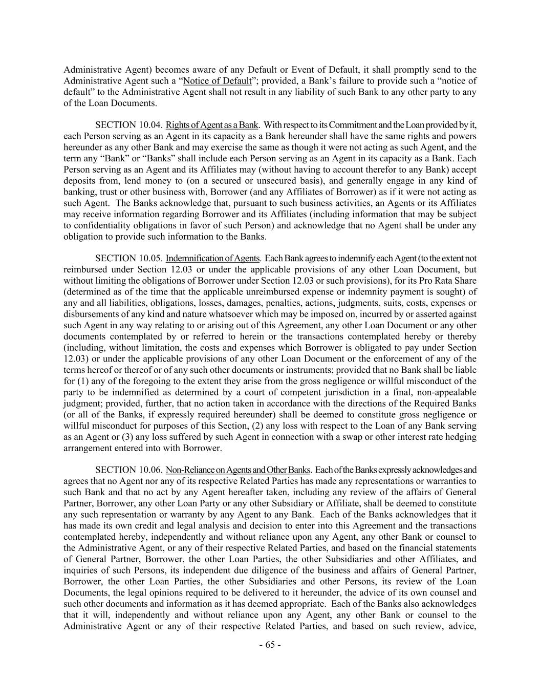 - 65 - Administrative Agent) becomes aware of any Default or Event of Default, it shall promptly send to the Administrative Agent such a “Notice of Default”; provided, a Bank’s failure to provide such a “notice of default” to the Administrative Agent shall not result in any liability of such Bank to any other party to any of the Loan Documents. SECTION 10.04. Rights of Agent as a Bank. With respect to its Commitment and the Loan provided by it, each Person serving as an Agent in its capacity as a Bank hereunder shall have the same rights and powers hereunder as any other Bank and may exercise the same as though it were not acting as such Agent, and the term any “Bank” or “Banks” shall include each Person serving as an Agent in its capacity as a Bank. Each Person serving as an Agent and its Affiliates may (without having to account therefor to any Bank) accept deposits from, lend money to (on a secured or unsecured basis), and generally engage in any kind of banking, trust or other business with, Borrower (and any Affiliates of Borrower) as if it were not acting as such Agent. The Banks acknowledge that, pursuant to such business activities, an Agents or its Affiliates may receive information regarding Borrower and its Affiliates (including information that may be subject to confidentiality obligations in favor of such Person) and acknowledge that no Agent shall be under any obligation to provide such information to the Banks. SECTION 10.05. Indemnification of Agents. Each Bank agrees to indemnify each Agent (to the extent not reimbursed under Section 12.03 or under the applicable provisions of any other Loan Document, but without limiting the obligations of Borrower under Section 12.03 or such provisions), for its Pro Rata Share (determined as of the time that the applicable unreimbursed expense or indemnity payment is sought) of any and all liabilities, obligations, losses, damages, penalties, actions, judgments, suits, costs, expenses or disbursements of any kind and nature whatsoever which may be imposed on, incurred by or asserted against such Agent in any way relating to or arising out of this Agreement, any other Loan Document or any other documents contemplated by or referred to herein or the transactions contemplated hereby or thereby (including, without limitation, the costs and expenses which Borrower is obligated to pay under Section 12.03) or under the applicable provisions of any other Loan Document or the enforcement of any of the terms hereof or thereof or of any such other documents or instruments; provided that no Bank shall be liable for (1) any of the foregoing to the extent they arise from the gross negligence or willful misconduct of the party to be indemnified as determined by a court of competent jurisdiction in a final, non-appealable judgment; provided, further, that no action taken in accordance with the directions of the Required Banks (or all of the Banks, if expressly required hereunder) shall be deemed to constitute gross negligence or willful misconduct for purposes of this Section, (2) any loss with respect to the Loan of any Bank serving as an Agent or (3) any loss suffered by such Agent in connection with a swap or other interest rate hedging arrangement entered into with Borrower. SECTION 10.06. Non-Reliance on Agents and Other Banks. Each of the Banks expressly acknowledges and agrees that no Agent nor any of its respective Related Parties has made any representations or warranties to such Bank and that no act by any Agent hereafter taken, including any review of the affairs of General Partner, Borrower, any other Loan Party or any other Subsidiary or Affiliate, shall be deemed to constitute any such representation or warranty by any Agent to any Bank. Each of the Banks acknowledges that it has made its own credit and legal analysis and decision to enter into this Agreement and the transactions contemplated hereby, independently and without reliance upon any Agent, any other Bank or counsel to the Administrative Agent, or any of their respective Related Parties, and based on the financial statements of General Partner, Borrower, the other Loan Parties, the other Subsidiaries and other Affiliates, and inquiries of such Persons, its independent due diligence of the business and affairs of General Partner, Borrower, the other Loan Parties, the other Subsidiaries and other Persons, its review of the Loan Documents, the legal opinions required to be delivered to it hereunder, the advice of its own counsel and such other documents and information as it has deemed appropriate. Each of the Banks also acknowledges that it will, independently and without reliance upon any Agent, any other Bank or counsel to the Administrative Agent or any of their respective Related Parties, and based on such review, advice,