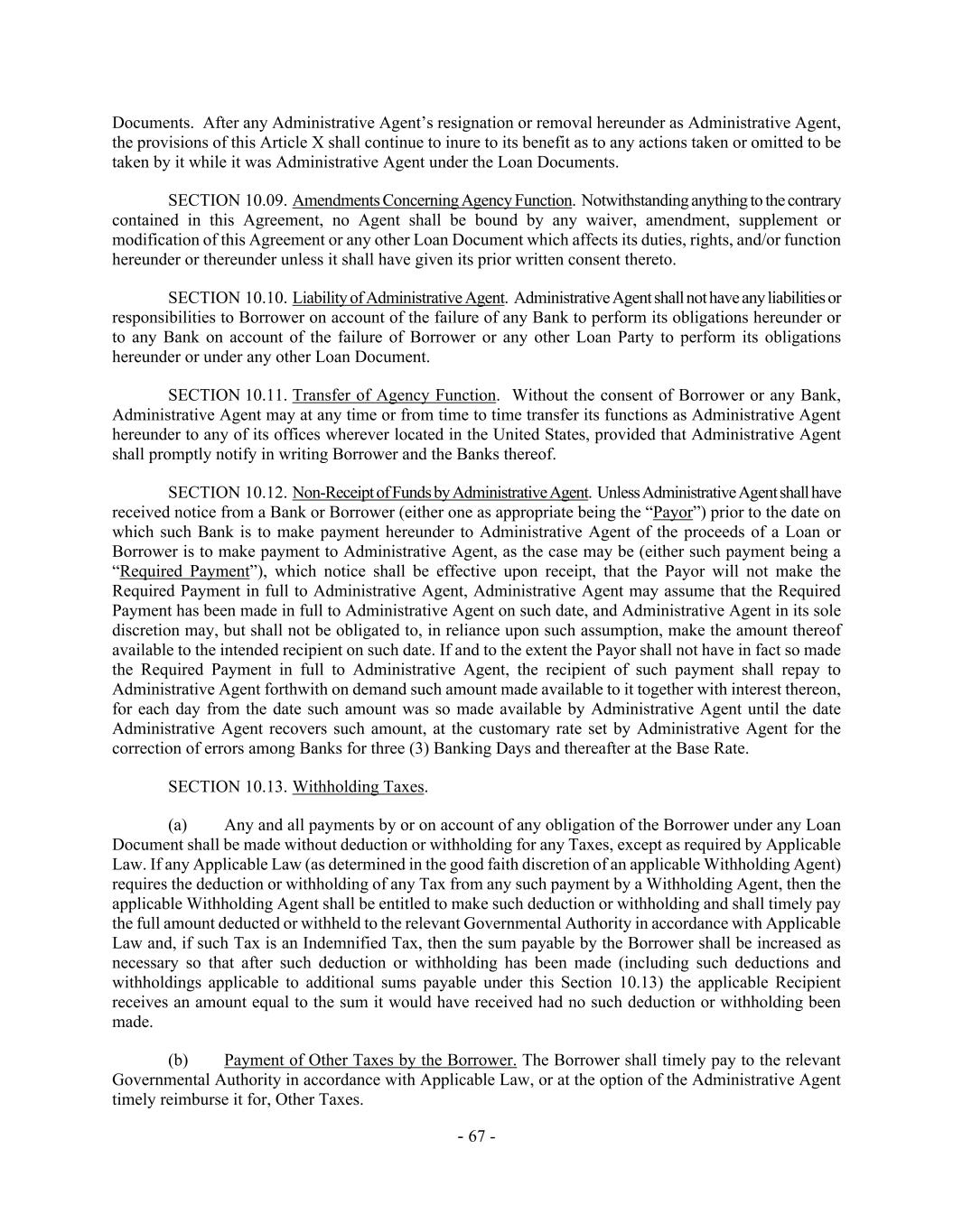 - 67 - Documents. After any Administrative Agent’s resignation or removal hereunder as Administrative Agent, the provisions of this Article X shall continue to inure to its benefit as to any actions taken or omitted to be taken by it while it was Administrative Agent under the Loan Documents. SECTION 10.09. Amendments Concerning Agency Function. Notwithstanding anything to the contrary contained in this Agreement, no Agent shall be bound by any waiver, amendment, supplement or modification of this Agreement or any other Loan Document which affects its duties, rights, and/or function hereunder or thereunder unless it shall have given its prior written consent thereto. SECTION 10.10. Liability of Administrative Agent. Administrative Agent shall not have any liabilities or responsibilities to Borrower on account of the failure of any Bank to perform its obligations hereunder or to any Bank on account of the failure of Borrower or any other Loan Party to perform its obligations hereunder or under any other Loan Document. SECTION 10.11. Transfer of Agency Function. Without the consent of Borrower or any Bank, Administrative Agent may at any time or from time to time transfer its functions as Administrative Agent hereunder to any of its offices wherever located in the United States, provided that Administrative Agent shall promptly notify in writing Borrower and the Banks thereof. SECTION 10.12. Non-Receipt of Funds by Administrative Agent. Unless Administrative Agent shall have received notice from a Bank or Borrower (either one as appropriate being the “Payor”) prior to the date on which such Bank is to make payment hereunder to Administrative Agent of the proceeds of a Loan or Borrower is to make payment to Administrative Agent, as the case may be (either such payment being a “Required Payment”), which notice shall be effective upon receipt, that the Payor will not make the Required Payment in full to Administrative Agent, Administrative Agent may assume that the Required Payment has been made in full to Administrative Agent on such date, and Administrative Agent in its sole discretion may, but shall not be obligated to, in reliance upon such assumption, make the amount thereof available to the intended recipient on such date. If and to the extent the Payor shall not have in fact so made the Required Payment in full to Administrative Agent, the recipient of such payment shall repay to Administrative Agent forthwith on demand such amount made available to it together with interest thereon, for each day from the date such amount was so made available by Administrative Agent until the date Administrative Agent recovers such amount, at the customary rate set by Administrative Agent for the correction of errors among Banks for three (3) Banking Days and thereafter at the Base Rate. SECTION 10.13. Withholding Taxes. (a) Any and all payments by or on account of any obligation of the Borrower under any Loan Document shall be made without deduction or withholding for any Taxes, except as required by Applicable Law. If any Applicable Law (as determined in the good faith discretion of an applicable Withholding Agent) requires the deduction or withholding of any Tax from any such payment by a Withholding Agent, then the applicable Withholding Agent shall be entitled to make such deduction or withholding and shall timely pay the full amount deducted or withheld to the relevant Governmental Authority in accordance with Applicable Law and, if such Tax is an Indemnified Tax, then the sum payable by the Borrower shall be increased as necessary so that after such deduction or withholding has been made (including such deductions and withholdings applicable to additional sums payable under this Section 10.13) the applicable Recipient receives an amount equal to the sum it would have received had no such deduction or withholding been made. (b) Payment of Other Taxes by the Borrower. The Borrower shall timely pay to the relevant Governmental Authority in accordance with Applicable Law, or at the option of the Administrative Agent timely reimburse it for, Other Taxes.