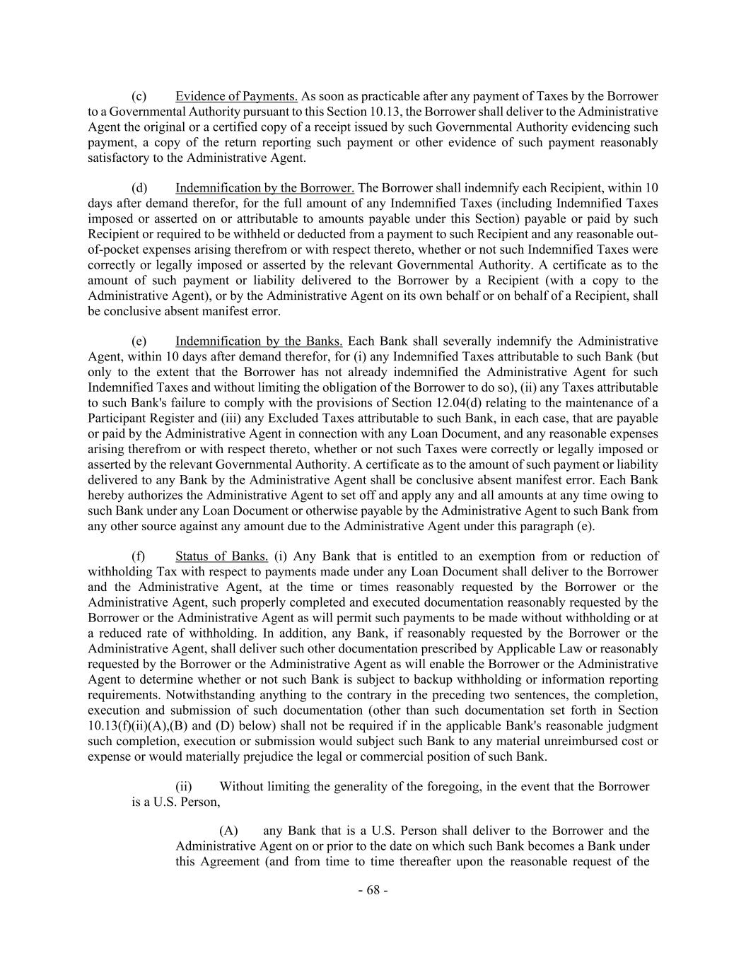 - 68 - (c) Evidence of Payments. As soon as practicable after any payment of Taxes by the Borrower to a Governmental Authority pursuant to this Section 10.13, the Borrower shall deliver to the Administrative Agent the original or a certified copy of a receipt issued by such Governmental Authority evidencing such payment, a copy of the return reporting such payment or other evidence of such payment reasonably satisfactory to the Administrative Agent. (d) Indemnification by the Borrower. The Borrower shall indemnify each Recipient, within 10 days after demand therefor, for the full amount of any Indemnified Taxes (including Indemnified Taxes imposed or asserted on or attributable to amounts payable under this Section) payable or paid by such Recipient or required to be withheld or deducted from a payment to such Recipient and any reasonable out- of-pocket expenses arising therefrom or with respect thereto, whether or not such Indemnified Taxes were correctly or legally imposed or asserted by the relevant Governmental Authority. A certificate as to the amount of such payment or liability delivered to the Borrower by a Recipient (with a copy to the Administrative Agent), or by the Administrative Agent on its own behalf or on behalf of a Recipient, shall be conclusive absent manifest error. (e) Indemnification by the Banks. Each Bank shall severally indemnify the Administrative Agent, within 10 days after demand therefor, for (i) any Indemnified Taxes attributable to such Bank (but only to the extent that the Borrower has not already indemnified the Administrative Agent for such Indemnified Taxes and without limiting the obligation of the Borrower to do so), (ii) any Taxes attributable to such Bank's failure to comply with the provisions of Section 12.04(d) relating to the maintenance of a Participant Register and (iii) any Excluded Taxes attributable to such Bank, in each case, that are payable or paid by the Administrative Agent in connection with any Loan Document, and any reasonable expenses arising therefrom or with respect thereto, whether or not such Taxes were correctly or legally imposed or asserted by the relevant Governmental Authority. A certificate as to the amount of such payment or liability delivered to any Bank by the Administrative Agent shall be conclusive absent manifest error. Each Bank hereby authorizes the Administrative Agent to set off and apply any and all amounts at any time owing to such Bank under any Loan Document or otherwise payable by the Administrative Agent to such Bank from any other source against any amount due to the Administrative Agent under this paragraph (e). (f) Status of Banks. (i) Any Bank that is entitled to an exemption from or reduction of withholding Tax with respect to payments made under any Loan Document shall deliver to the Borrower and the Administrative Agent, at the time or times reasonably requested by the Borrower or the Administrative Agent, such properly completed and executed documentation reasonably requested by the Borrower or the Administrative Agent as will permit such payments to be made without withholding or at a reduced rate of withholding. In addition, any Bank, if reasonably requested by the Borrower or the Administrative Agent, shall deliver such other documentation prescribed by Applicable Law or reasonably requested by the Borrower or the Administrative Agent as will enable the Borrower or the Administrative Agent to determine whether or not such Bank is subject to backup withholding or information reporting requirements. Notwithstanding anything to the contrary in the preceding two sentences, the completion, execution and submission of such documentation (other than such documentation set forth in Section 10.13(f)(ii)(A),(B) and (D) below) shall not be required if in the applicable Bank's reasonable judgment such completion, execution or submission would subject such Bank to any material unreimbursed cost or expense or would materially prejudice the legal or commercial position of such Bank. (ii) Without limiting the generality of the foregoing, in the event that the Borrower is a U.S. Person, (A) any Bank that is a U.S. Person shall deliver to the Borrower and the Administrative Agent on or prior to the date on which such Bank becomes a Bank under this Agreement (and from time to time thereafter upon the reasonable request of the