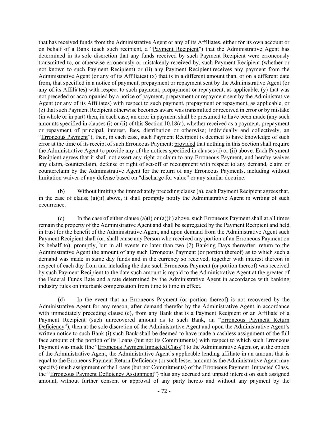 - 72 - that has received funds from the Administrative Agent or any of its Affiliates, either for its own account or on behalf of a Bank (each such recipient, a “Payment Recipient”) that the Administrative Agent has determined in its sole discretion that any funds received by such Payment Recipient were erroneously transmitted to, or otherwise erroneously or mistakenly received by, such Payment Recipient (whether or not known to such Payment Recipient) or (ii) any Payment Recipient receives any payment from the Administrative Agent (or any of its Affiliates) (x) that is in a different amount than, or on a different date from, that specified in a notice of payment, prepayment or repayment sent by the Administrative Agent (or any of its Affiliates) with respect to such payment, prepayment or repayment, as applicable, (y) that was not preceded or accompanied by a notice of payment, prepayment or repayment sent by the Administrative Agent (or any of its Affiliates) with respect to such payment, prepayment or repayment, as applicable, or (z) that such Payment Recipient otherwise becomes aware was transmitted or received in error or by mistake (in whole or in part) then, in each case, an error in payment shall be presumed to have been made (any such amounts specified in clauses (i) or (ii) of this Section 10.18(a), whether received as a payment, prepayment or repayment of principal, interest, fees, distribution or otherwise; individually and collectively, an “Erroneous Payment”), then, in each case, such Payment Recipient is deemed to have knowledge of such error at the time of its receipt of such Erroneous Payment; provided that nothing in this Section shall require the Administrative Agent to provide any of the notices specified in clauses (i) or (ii) above. Each Payment Recipient agrees that it shall not assert any right or claim to any Erroneous Payment, and hereby waives any claim, counterclaim, defense or right of set-off or recoupment with respect to any demand, claim or counterclaim by the Administrative Agent for the return of any Erroneous Payments, including without limitation waiver of any defense based on “discharge for value” or any similar doctrine. (b) Without limiting the immediately preceding clause (a), each Payment Recipient agrees that, in the case of clause (a)(ii) above, it shall promptly notify the Administrative Agent in writing of such occurrence. (c) In the case of either clause (a)(i) or (a)(ii) above, such Erroneous Payment shall at all times remain the property of the Administrative Agent and shall be segregated by the Payment Recipient and held in trust for the benefit of the Administrative Agent, and upon demand from the Administrative Agent such Payment Recipient shall (or, shall cause any Person who received any portion of an Erroneous Payment on its behalf to), promptly, but in all events no later than two (2) Banking Days thereafter, return to the Administrative Agent the amount of any such Erroneous Payment (or portion thereof) as to which such a demand was made in same day funds and in the currency so received, together with interest thereon in respect of each day from and including the date such Erroneous Payment (or portion thereof) was received by such Payment Recipient to the date such amount is repaid to the Administrative Agent at the greater of the Federal Funds Rate and a rate determined by the Administrative Agent in accordance with banking industry rules on interbank compensation from time to time in effect. (d) In the event that an Erroneous Payment (or portion thereof) is not recovered by the Administrative Agent for any reason, after demand therefor by the Administrative Agent in accordance with immediately preceding clause (c), from any Bank that is a Payment Recipient or an Affiliate of a Payment Recipient (such unrecovered amount as to such Bank, an “Erroneous Payment Return Deficiency”), then at the sole discretion of the Administrative Agent and upon the Administrative Agent’s written notice to such Bank (i) such Bank shall be deemed to have made a cashless assignment of the full face amount of the portion of its Loans (but not its Commitments) with respect to which such Erroneous Payment was made (the “Erroneous Payment Impacted Class”) to the Administrative Agent or, at the option of the Administrative Agent, the Administrative Agent’s applicable lending affiliate in an amount that is equal to the Erroneous Payment Return Deficiency (or such lesser amount as the Administrative Agent may specify) (such assignment of the Loans (but not Commitments) of the Erroneous Payment Impacted Class, the “Erroneous Payment Deficiency Assignment”) plus any accrued and unpaid interest on such assigned amount, without further consent or approval of any party hereto and without any payment by the