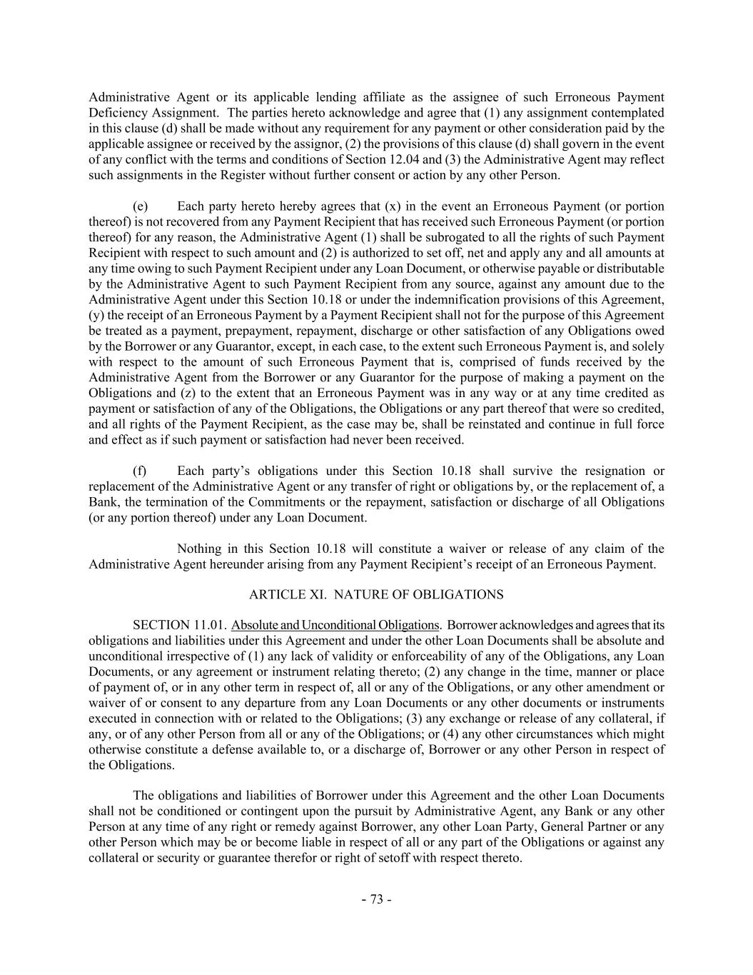 - 73 - Administrative Agent or its applicable lending affiliate as the assignee of such Erroneous Payment Deficiency Assignment. The parties hereto acknowledge and agree that (1) any assignment contemplated in this clause (d) shall be made without any requirement for any payment or other consideration paid by the applicable assignee or received by the assignor, (2) the provisions of this clause (d) shall govern in the event of any conflict with the terms and conditions of Section 12.04 and (3) the Administrative Agent may reflect such assignments in the Register without further consent or action by any other Person. (e) Each party hereto hereby agrees that (x) in the event an Erroneous Payment (or portion thereof) is not recovered from any Payment Recipient that has received such Erroneous Payment (or portion thereof) for any reason, the Administrative Agent (1) shall be subrogated to all the rights of such Payment Recipient with respect to such amount and (2) is authorized to set off, net and apply any and all amounts at any time owing to such Payment Recipient under any Loan Document, or otherwise payable or distributable by the Administrative Agent to such Payment Recipient from any source, against any amount due to the Administrative Agent under this Section 10.18 or under the indemnification provisions of this Agreement, (y) the receipt of an Erroneous Payment by a Payment Recipient shall not for the purpose of this Agreement be treated as a payment, prepayment, repayment, discharge or other satisfaction of any Obligations owed by the Borrower or any Guarantor, except, in each case, to the extent such Erroneous Payment is, and solely with respect to the amount of such Erroneous Payment that is, comprised of funds received by the Administrative Agent from the Borrower or any Guarantor for the purpose of making a payment on the Obligations and (z) to the extent that an Erroneous Payment was in any way or at any time credited as payment or satisfaction of any of the Obligations, the Obligations or any part thereof that were so credited, and all rights of the Payment Recipient, as the case may be, shall be reinstated and continue in full force and effect as if such payment or satisfaction had never been received. (f) Each party’s obligations under this Section 10.18 shall survive the resignation or replacement of the Administrative Agent or any transfer of right or obligations by, or the replacement of, a Bank, the termination of the Commitments or the repayment, satisfaction or discharge of all Obligations (or any portion thereof) under any Loan Document. Nothing in this Section 10.18 will constitute a waiver or release of any claim of the Administrative Agent hereunder arising from any Payment Recipient’s receipt of an Erroneous Payment. ARTICLE XI. NATURE OF OBLIGATIONS SECTION 11.01. Absolute and Unconditional Obligations. Borrower acknowledges and agrees that its obligations and liabilities under this Agreement and under the other Loan Documents shall be absolute and unconditional irrespective of (1) any lack of validity or enforceability of any of the Obligations, any Loan Documents, or any agreement or instrument relating thereto; (2) any change in the time, manner or place of payment of, or in any other term in respect of, all or any of the Obligations, or any other amendment or waiver of or consent to any departure from any Loan Documents or any other documents or instruments executed in connection with or related to the Obligations; (3) any exchange or release of any collateral, if any, or of any other Person from all or any of the Obligations; or (4) any other circumstances which might otherwise constitute a defense available to, or a discharge of, Borrower or any other Person in respect of the Obligations. The obligations and liabilities of Borrower under this Agreement and the other Loan Documents shall not be conditioned or contingent upon the pursuit by Administrative Agent, any Bank or any other Person at any time of any right or remedy against Borrower, any other Loan Party, General Partner or any other Person which may be or become liable in respect of all or any part of the Obligations or against any collateral or security or guarantee therefor or right of setoff with respect thereto.