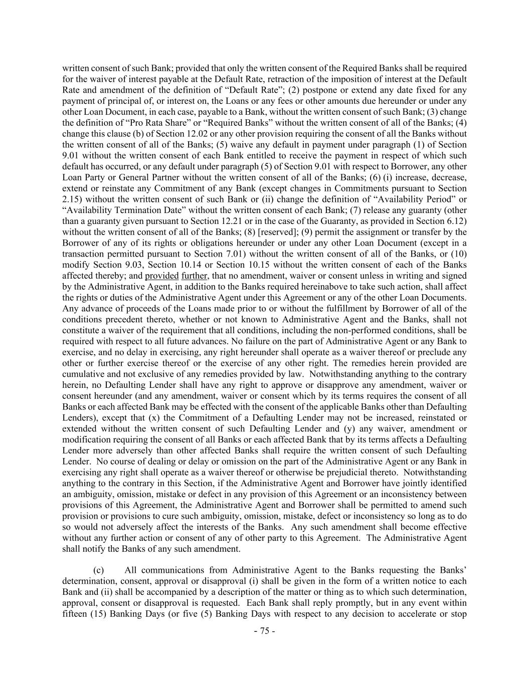 - 75 - written consent of such Bank; provided that only the written consent of the Required Banks shall be required for the waiver of interest payable at the Default Rate, retraction of the imposition of interest at the Default Rate and amendment of the definition of “Default Rate”; (2) postpone or extend any date fixed for any payment of principal of, or interest on, the Loans or any fees or other amounts due hereunder or under any other Loan Document, in each case, payable to a Bank, without the written consent of such Bank; (3) change the definition of “Pro Rata Share” or “Required Banks” without the written consent of all of the Banks; (4) change this clause (b) of Section 12.02 or any other provision requiring the consent of all the Banks without the written consent of all of the Banks; (5) waive any default in payment under paragraph (1) of Section 9.01 without the written consent of each Bank entitled to receive the payment in respect of which such default has occurred, or any default under paragraph (5) of Section 9.01 with respect to Borrower, any other Loan Party or General Partner without the written consent of all of the Banks; (6) (i) increase, decrease, extend or reinstate any Commitment of any Bank (except changes in Commitments pursuant to Section 2.15) without the written consent of such Bank or (ii) change the definition of “Availability Period” or “Availability Termination Date” without the written consent of each Bank; (7) release any guaranty (other than a guaranty given pursuant to Section 12.21 or in the case of the Guaranty, as provided in Section 6.12) without the written consent of all of the Banks; (8) [reserved]; (9) permit the assignment or transfer by the Borrower of any of its rights or obligations hereunder or under any other Loan Document (except in a transaction permitted pursuant to Section 7.01) without the written consent of all of the Banks, or (10) modify Section 9.03, Section 10.14 or Section 10.15 without the written consent of each of the Banks affected thereby; and provided further, that no amendment, waiver or consent unless in writing and signed by the Administrative Agent, in addition to the Banks required hereinabove to take such action, shall affect the rights or duties of the Administrative Agent under this Agreement or any of the other Loan Documents. Any advance of proceeds of the Loans made prior to or without the fulfillment by Borrower of all of the conditions precedent thereto, whether or not known to Administrative Agent and the Banks, shall not constitute a waiver of the requirement that all conditions, including the non-performed conditions, shall be required with respect to all future advances. No failure on the part of Administrative Agent or any Bank to exercise, and no delay in exercising, any right hereunder shall operate as a waiver thereof or preclude any other or further exercise thereof or the exercise of any other right. The remedies herein provided are cumulative and not exclusive of any remedies provided by law. Notwithstanding anything to the contrary herein, no Defaulting Lender shall have any right to approve or disapprove any amendment, waiver or consent hereunder (and any amendment, waiver or consent which by its terms requires the consent of all Banks or each affected Bank may be effected with the consent of the applicable Banks other than Defaulting Lenders), except that (x) the Commitment of a Defaulting Lender may not be increased, reinstated or extended without the written consent of such Defaulting Lender and (y) any waiver, amendment or modification requiring the consent of all Banks or each affected Bank that by its terms affects a Defaulting Lender more adversely than other affected Banks shall require the written consent of such Defaulting Lender. No course of dealing or delay or omission on the part of the Administrative Agent or any Bank in exercising any right shall operate as a waiver thereof or otherwise be prejudicial thereto. Notwithstanding anything to the contrary in this Section, if the Administrative Agent and Borrower have jointly identified an ambiguity, omission, mistake or defect in any provision of this Agreement or an inconsistency between provisions of this Agreement, the Administrative Agent and Borrower shall be permitted to amend such provision or provisions to cure such ambiguity, omission, mistake, defect or inconsistency so long as to do so would not adversely affect the interests of the Banks. Any such amendment shall become effective without any further action or consent of any of other party to this Agreement. The Administrative Agent shall notify the Banks of any such amendment. (c) All communications from Administrative Agent to the Banks requesting the Banks’ determination, consent, approval or disapproval (i) shall be given in the form of a written notice to each Bank and (ii) shall be accompanied by a description of the matter or thing as to which such determination, approval, consent or disapproval is requested. Each Bank shall reply promptly, but in any event within fifteen (15) Banking Days (or five (5) Banking Days with respect to any decision to accelerate or stop