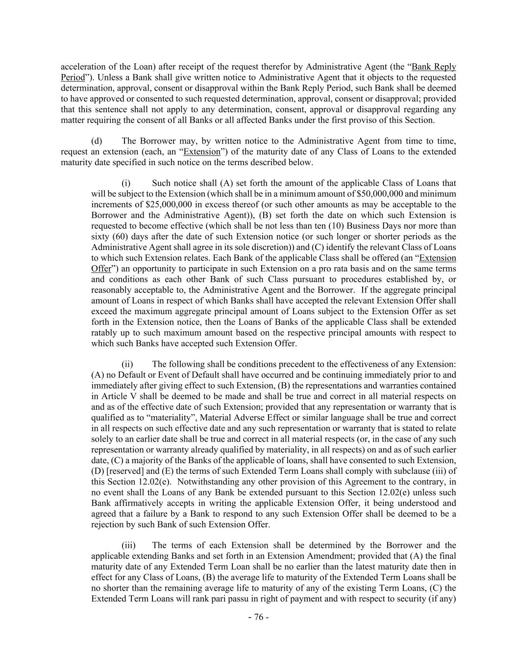 - 76 - acceleration of the Loan) after receipt of the request therefor by Administrative Agent (the “Bank Reply Period”). Unless a Bank shall give written notice to Administrative Agent that it objects to the requested determination, approval, consent or disapproval within the Bank Reply Period, such Bank shall be deemed to have approved or consented to such requested determination, approval, consent or disapproval; provided that this sentence shall not apply to any determination, consent, approval or disapproval regarding any matter requiring the consent of all Banks or all affected Banks under the first proviso of this Section. (d) The Borrower may, by written notice to the Administrative Agent from time to time, request an extension (each, an “Extension”) of the maturity date of any Class of Loans to the extended maturity date specified in such notice on the terms described below. (i) Such notice shall (A) set forth the amount of the applicable Class of Loans that will be subject to the Extension (which shall be in a minimum amount of $50,000,000 and minimum increments of $25,000,000 in excess thereof (or such other amounts as may be acceptable to the Borrower and the Administrative Agent)), (B) set forth the date on which such Extension is requested to become effective (which shall be not less than ten (10) Business Days nor more than sixty (60) days after the date of such Extension notice (or such longer or shorter periods as the Administrative Agent shall agree in its sole discretion)) and (C) identify the relevant Class of Loans to which such Extension relates. Each Bank of the applicable Class shall be offered (an “Extension Offer”) an opportunity to participate in such Extension on a pro rata basis and on the same terms and conditions as each other Bank of such Class pursuant to procedures established by, or reasonably acceptable to, the Administrative Agent and the Borrower. If the aggregate principal amount of Loans in respect of which Banks shall have accepted the relevant Extension Offer shall exceed the maximum aggregate principal amount of Loans subject to the Extension Offer as set forth in the Extension notice, then the Loans of Banks of the applicable Class shall be extended ratably up to such maximum amount based on the respective principal amounts with respect to which such Banks have accepted such Extension Offer. (ii) The following shall be conditions precedent to the effectiveness of any Extension: (A) no Default or Event of Default shall have occurred and be continuing immediately prior to and immediately after giving effect to such Extension, (B) the representations and warranties contained in Article V shall be deemed to be made and shall be true and correct in all material respects on and as of the effective date of such Extension; provided that any representation or warranty that is qualified as to “materiality”, Material Adverse Effect or similar language shall be true and correct in all respects on such effective date and any such representation or warranty that is stated to relate solely to an earlier date shall be true and correct in all material respects (or, in the case of any such representation or warranty already qualified by materiality, in all respects) on and as of such earlier date, (C) a majority of the Banks of the applicable of loans, shall have consented to such Extension, (D) [reserved] and (E) the terms of such Extended Term Loans shall comply with subclause (iii) of this Section 12.02(e). Notwithstanding any other provision of this Agreement to the contrary, in no event shall the Loans of any Bank be extended pursuant to this Section 12.02(e) unless such Bank affirmatively accepts in writing the applicable Extension Offer, it being understood and agreed that a failure by a Bank to respond to any such Extension Offer shall be deemed to be a rejection by such Bank of such Extension Offer. (iii) The terms of each Extension shall be determined by the Borrower and the applicable extending Banks and set forth in an Extension Amendment; provided that (A) the final maturity date of any Extended Term Loan shall be no earlier than the latest maturity date then in effect for any Class of Loans, (B) the average life to maturity of the Extended Term Loans shall be no shorter than the remaining average life to maturity of any of the existing Term Loans, (C) the Extended Term Loans will rank pari passu in right of payment and with respect to security (if any)