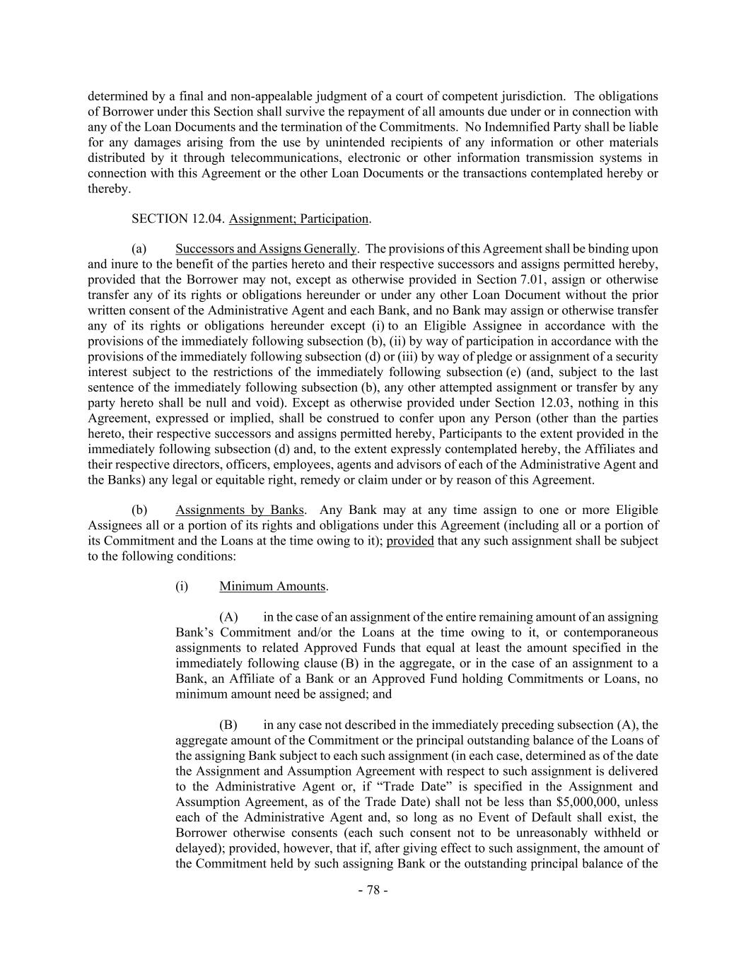 - 78 - determined by a final and non-appealable judgment of a court of competent jurisdiction. The obligations of Borrower under this Section shall survive the repayment of all amounts due under or in connection with any of the Loan Documents and the termination of the Commitments. No Indemnified Party shall be liable for any damages arising from the use by unintended recipients of any information or other materials distributed by it through telecommunications, electronic or other information transmission systems in connection with this Agreement or the other Loan Documents or the transactions contemplated hereby or thereby. SECTION 12.04. Assignment; Participation. (a) Successors and Assigns Generally. The provisions of this Agreement shall be binding upon and inure to the benefit of the parties hereto and their respective successors and assigns permitted hereby, provided that the Borrower may not, except as otherwise provided in Section 7.01, assign or otherwise transfer any of its rights or obligations hereunder or under any other Loan Document without the prior written consent of the Administrative Agent and each Bank, and no Bank may assign or otherwise transfer any of its rights or obligations hereunder except (i) to an Eligible Assignee in accordance with the provisions of the immediately following subsection (b), (ii) by way of participation in accordance with the provisions of the immediately following subsection (d) or (iii) by way of pledge or assignment of a security interest subject to the restrictions of the immediately following subsection (e) (and, subject to the last sentence of the immediately following subsection (b), any other attempted assignment or transfer by any party hereto shall be null and void). Except as otherwise provided under Section 12.03, nothing in this Agreement, expressed or implied, shall be construed to confer upon any Person (other than the parties hereto, their respective successors and assigns permitted hereby, Participants to the extent provided in the immediately following subsection (d) and, to the extent expressly contemplated hereby, the Affiliates and their respective directors, officers, employees, agents and advisors of each of the Administrative Agent and the Banks) any legal or equitable right, remedy or claim under or by reason of this Agreement. (b) Assignments by Banks. Any Bank may at any time assign to one or more Eligible Assignees all or a portion of its rights and obligations under this Agreement (including all or a portion of its Commitment and the Loans at the time owing to it); provided that any such assignment shall be subject to the following conditions: (i) Minimum Amounts. (A) in the case of an assignment of the entire remaining amount of an assigning Bank’s Commitment and/or the Loans at the time owing to it, or contemporaneous assignments to related Approved Funds that equal at least the amount specified in the immediately following clause (B) in the aggregate, or in the case of an assignment to a Bank, an Affiliate of a Bank or an Approved Fund holding Commitments or Loans, no minimum amount need be assigned; and (B) in any case not described in the immediately preceding subsection (A), the aggregate amount of the Commitment or the principal outstanding balance of the Loans of the assigning Bank subject to each such assignment (in each case, determined as of the date the Assignment and Assumption Agreement with respect to such assignment is delivered to the Administrative Agent or, if “Trade Date” is specified in the Assignment and Assumption Agreement, as of the Trade Date) shall not be less than $5,000,000, unless each of the Administrative Agent and, so long as no Event of Default shall exist, the Borrower otherwise consents (each such consent not to be unreasonably withheld or delayed); provided, however, that if, after giving effect to such assignment, the amount of the Commitment held by such assigning Bank or the outstanding principal balance of the