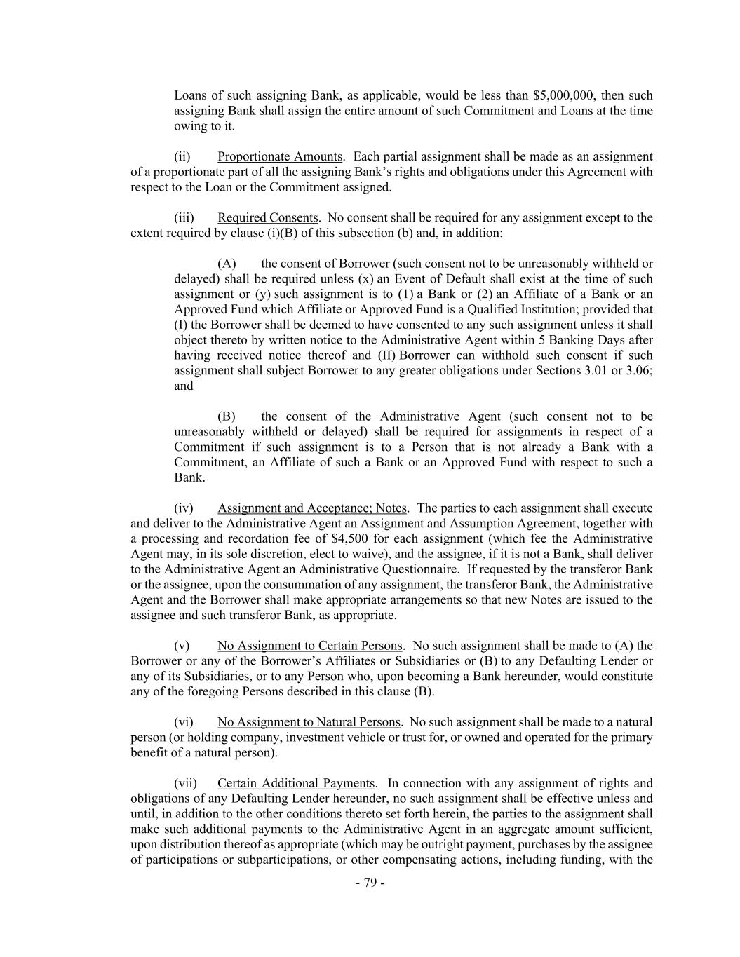 - 79 - Loans of such assigning Bank, as applicable, would be less than $5,000,000, then such assigning Bank shall assign the entire amount of such Commitment and Loans at the time owing to it. (ii) Proportionate Amounts. Each partial assignment shall be made as an assignment of a proportionate part of all the assigning Bank’s rights and obligations under this Agreement with respect to the Loan or the Commitment assigned. (iii) Required Consents. No consent shall be required for any assignment except to the extent required by clause (i)(B) of this subsection (b) and, in addition: (A) the consent of Borrower (such consent not to be unreasonably withheld or delayed) shall be required unless (x) an Event of Default shall exist at the time of such assignment or (y) such assignment is to (1) a Bank or (2) an Affiliate of a Bank or an Approved Fund which Affiliate or Approved Fund is a Qualified Institution; provided that (I) the Borrower shall be deemed to have consented to any such assignment unless it shall object thereto by written notice to the Administrative Agent within 5 Banking Days after having received notice thereof and (II) Borrower can withhold such consent if such assignment shall subject Borrower to any greater obligations under Sections 3.01 or 3.06; and (B) the consent of the Administrative Agent (such consent not to be unreasonably withheld or delayed) shall be required for assignments in respect of a Commitment if such assignment is to a Person that is not already a Bank with a Commitment, an Affiliate of such a Bank or an Approved Fund with respect to such a Bank. (iv) Assignment and Acceptance; Notes. The parties to each assignment shall execute and deliver to the Administrative Agent an Assignment and Assumption Agreement, together with a processing and recordation fee of $4,500 for each assignment (which fee the Administrative Agent may, in its sole discretion, elect to waive), and the assignee, if it is not a Bank, shall deliver to the Administrative Agent an Administrative Questionnaire. If requested by the transferor Bank or the assignee, upon the consummation of any assignment, the transferor Bank, the Administrative Agent and the Borrower shall make appropriate arrangements so that new Notes are issued to the assignee and such transferor Bank, as appropriate. (v) No Assignment to Certain Persons. No such assignment shall be made to (A) the Borrower or any of the Borrower’s Affiliates or Subsidiaries or (B) to any Defaulting Lender or any of its Subsidiaries, or to any Person who, upon becoming a Bank hereunder, would constitute any of the foregoing Persons described in this clause (B). (vi) No Assignment to Natural Persons. No such assignment shall be made to a natural person (or holding company, investment vehicle or trust for, or owned and operated for the primary benefit of a natural person). (vii) Certain Additional Payments. In connection with any assignment of rights and obligations of any Defaulting Lender hereunder, no such assignment shall be effective unless and until, in addition to the other conditions thereto set forth herein, the parties to the assignment shall make such additional payments to the Administrative Agent in an aggregate amount sufficient, upon distribution thereof as appropriate (which may be outright payment, purchases by the assignee of participations or subparticipations, or other compensating actions, including funding, with the