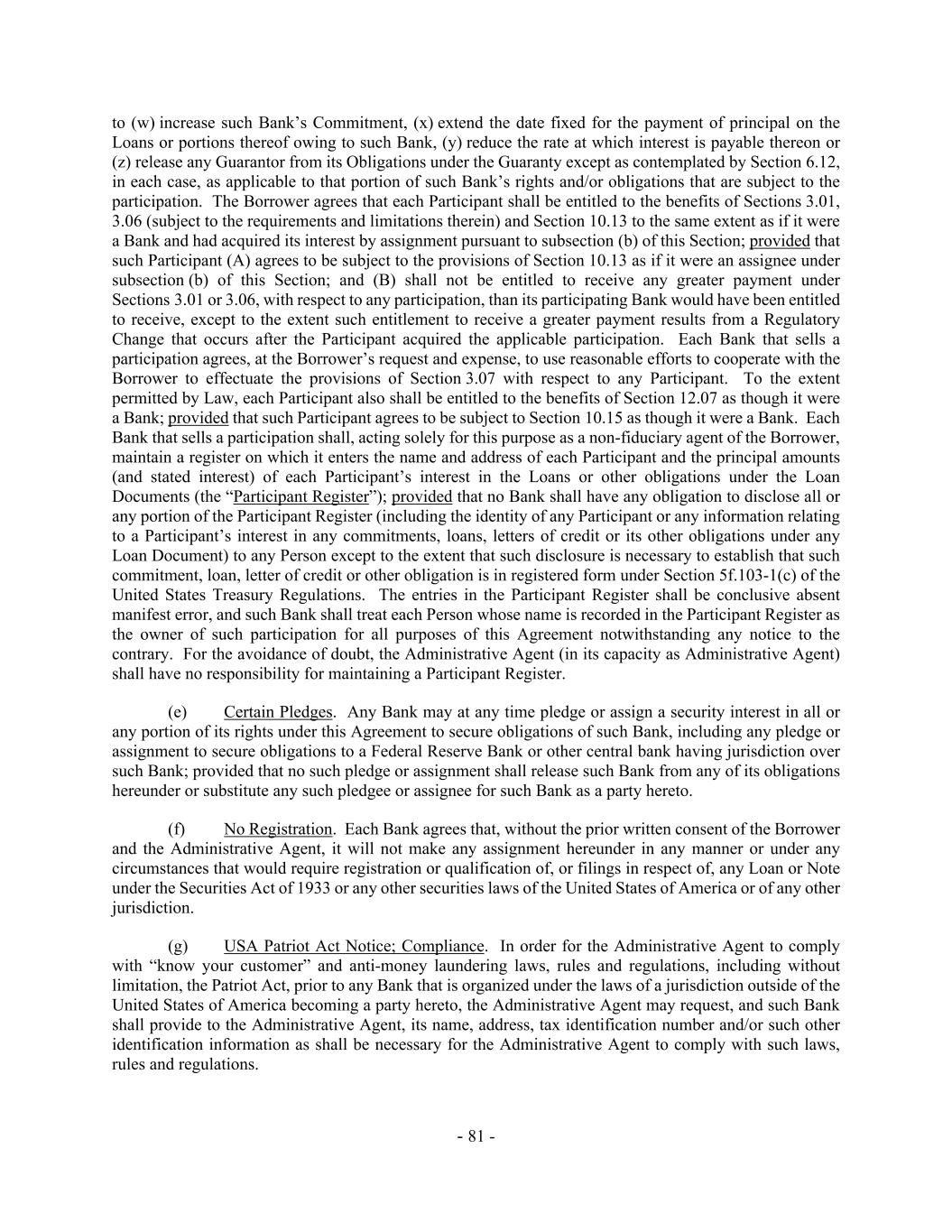 - 81 - to (w) increase such Bank’s Commitment, (x) extend the date fixed for the payment of principal on the Loans or portions thereof owing to such Bank, (y) reduce the rate at which interest is payable thereon or (z) release any Guarantor from its Obligations under the Guaranty except as contemplated by Section 6.12, in each case, as applicable to that portion of such Bank’s rights and/or obligations that are subject to the participation. The Borrower agrees that each Participant shall be entitled to the benefits of Sections 3.01, 3.06 (subject to the requirements and limitations therein) and Section 10.13 to the same extent as if it were a Bank and had acquired its interest by assignment pursuant to subsection (b) of this Section; provided that such Participant (A) agrees to be subject to the provisions of Section 10.13 as if it were an assignee under subsection (b) of this Section; and (B) shall not be entitled to receive any greater payment under Sections 3.01 or 3.06, with respect to any participation, than its participating Bank would have been entitled to receive, except to the extent such entitlement to receive a greater payment results from a Regulatory Change that occurs after the Participant acquired the applicable participation. Each Bank that sells a participation agrees, at the Borrower’s request and expense, to use reasonable efforts to cooperate with the Borrower to effectuate the provisions of Section 3.07 with respect to any Participant. To the extent permitted by Law, each Participant also shall be entitled to the benefits of Section 12.07 as though it were a Bank; provided that such Participant agrees to be subject to Section 10.15 as though it were a Bank. Each Bank that sells a participation shall, acting solely for this purpose as a non-fiduciary agent of the Borrower, maintain a register on which it enters the name and address of each Participant and the principal amounts (and stated interest) of each Participant’s interest in the Loans or other obligations under the Loan Documents (the “Participant Register”); provided that no Bank shall have any obligation to disclose all or any portion of the Participant Register (including the identity of any Participant or any information relating to a Participant’s interest in any commitments, loans, letters of credit or its other obligations under any Loan Document) to any Person except to the extent that such disclosure is necessary to establish that such commitment, loan, letter of credit or other obligation is in registered form under Section 5f.103-1(c) of the United States Treasury Regulations. The entries in the Participant Register shall be conclusive absent manifest error, and such Bank shall treat each Person whose name is recorded in the Participant Register as the owner of such participation for all purposes of this Agreement notwithstanding any notice to the contrary. For the avoidance of doubt, the Administrative Agent (in its capacity as Administrative Agent) shall have no responsibility for maintaining a Participant Register. (e) Certain Pledges. Any Bank may at any time pledge or assign a security interest in all or any portion of its rights under this Agreement to secure obligations of such Bank, including any pledge or assignment to secure obligations to a Federal Reserve Bank or other central bank having jurisdiction over such Bank; provided that no such pledge or assignment shall release such Bank from any of its obligations hereunder or substitute any such pledgee or assignee for such Bank as a party hereto. (f) No Registration. Each Bank agrees that, without the prior written consent of the Borrower and the Administrative Agent, it will not make any assignment hereunder in any manner or under any circumstances that would require registration or qualification of, or filings in respect of, any Loan or Note under the Securities Act of 1933 or any other securities laws of the United States of America or of any other jurisdiction. (g) USA Patriot Act Notice; Compliance. In order for the Administrative Agent to comply with “know your customer” and anti-money laundering laws, rules and regulations, including without limitation, the Patriot Act, prior to any Bank that is organized under the laws of a jurisdiction outside of the United States of America becoming a party hereto, the Administrative Agent may request, and such Bank shall provide to the Administrative Agent, its name, address, tax identification number and/or such other identification information as shall be necessary for the Administrative Agent to comply with such laws, rules and regulations.
