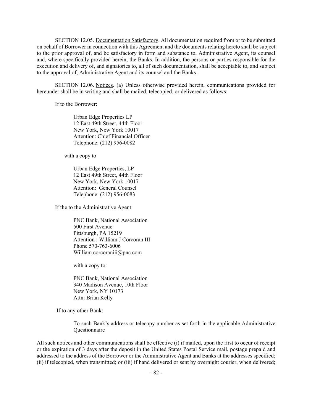 - 82 - SECTION 12.05. Documentation Satisfactory. All documentation required from or to be submitted on behalf of Borrower in connection with this Agreement and the documents relating hereto shall be subject to the prior approval of, and be satisfactory in form and substance to, Administrative Agent, its counsel and, where specifically provided herein, the Banks. In addition, the persons or parties responsible for the execution and delivery of, and signatories to, all of such documentation, shall be acceptable to, and subject to the approval of, Administrative Agent and its counsel and the Banks. SECTION 12.06. Notices. (a) Unless otherwise provided herein, communications provided for hereunder shall be in writing and shall be mailed, telecopied, or delivered as follows: If to the Borrower: Urban Edge Properties LP 12 East 49th Street, 44th Floor New York, New York 10017 Attention: Chief Financial Officer Telephone: (212) 956-0082 with a copy to Urban Edge Properties, LP 12 East 49th Street, 44th Floor New York, New York 10017 Attention: General Counsel Telephone: (212) 956-0083 If the to the Administrative Agent: PNC Bank, National Association 500 First Avenue Pittsburgh, PA 15219 Attention : William J Corcoran III Phone 570-763-6006 William.corcoraniii@pnc.com with a copy to: PNC Bank, National Association 340 Madison Avenue, 10th Floor New York, NY 10173 Attn: Brian Kelly If to any other Bank: To such Bank’s address or telecopy number as set forth in the applicable Administrative Questionnaire All such notices and other communications shall be effective (i) if mailed, upon the first to occur of receipt or the expiration of 3 days after the deposit in the United States Postal Service mail, postage prepaid and addressed to the address of the Borrower or the Administrative Agent and Banks at the addresses specified; (ii) if telecopied, when transmitted; or (iii) if hand delivered or sent by overnight courier, when delivered;
