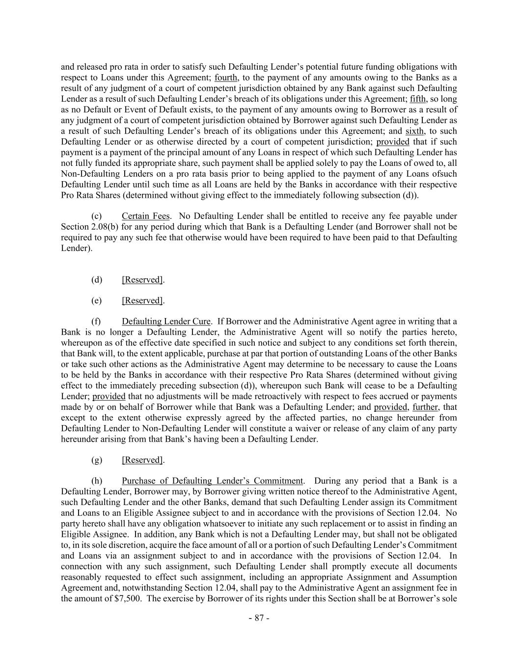 - 87 - and released pro rata in order to satisfy such Defaulting Lender’s potential future funding obligations with respect to Loans under this Agreement; fourth, to the payment of any amounts owing to the Banks as a result of any judgment of a court of competent jurisdiction obtained by any Bank against such Defaulting Lender as a result of such Defaulting Lender’s breach of its obligations under this Agreement; fifth, so long as no Default or Event of Default exists, to the payment of any amounts owing to Borrower as a result of any judgment of a court of competent jurisdiction obtained by Borrower against such Defaulting Lender as a result of such Defaulting Lender’s breach of its obligations under this Agreement; and sixth, to such Defaulting Lender or as otherwise directed by a court of competent jurisdiction; provided that if such payment is a payment of the principal amount of any Loans in respect of which such Defaulting Lender has not fully funded its appropriate share, such payment shall be applied solely to pay the Loans of owed to, all Non-Defaulting Lenders on a pro rata basis prior to being applied to the payment of any Loans ofsuch Defaulting Lender until such time as all Loans are held by the Banks in accordance with their respective Pro Rata Shares (determined without giving effect to the immediately following subsection (d)). (c) Certain Fees. No Defaulting Lender shall be entitled to receive any fee payable under Section 2.08(b) for any period during which that Bank is a Defaulting Lender (and Borrower shall not be required to pay any such fee that otherwise would have been required to have been paid to that Defaulting Lender). (d) [Reserved]. (e) [Reserved]. (f) Defaulting Lender Cure. If Borrower and the Administrative Agent agree in writing that a Bank is no longer a Defaulting Lender, the Administrative Agent will so notify the parties hereto, whereupon as of the effective date specified in such notice and subject to any conditions set forth therein, that Bank will, to the extent applicable, purchase at par that portion of outstanding Loans of the other Banks or take such other actions as the Administrative Agent may determine to be necessary to cause the Loans to be held by the Banks in accordance with their respective Pro Rata Shares (determined without giving effect to the immediately preceding subsection (d)), whereupon such Bank will cease to be a Defaulting Lender; provided that no adjustments will be made retroactively with respect to fees accrued or payments made by or on behalf of Borrower while that Bank was a Defaulting Lender; and provided, further, that except to the extent otherwise expressly agreed by the affected parties, no change hereunder from Defaulting Lender to Non-Defaulting Lender will constitute a waiver or release of any claim of any party hereunder arising from that Bank’s having been a Defaulting Lender. (g) [Reserved]. (h) Purchase of Defaulting Lender’s Commitment. During any period that a Bank is a Defaulting Lender, Borrower may, by Borrower giving written notice thereof to the Administrative Agent, such Defaulting Lender and the other Banks, demand that such Defaulting Lender assign its Commitment and Loans to an Eligible Assignee subject to and in accordance with the provisions of Section 12.04. No party hereto shall have any obligation whatsoever to initiate any such replacement or to assist in finding an Eligible Assignee. In addition, any Bank which is not a Defaulting Lender may, but shall not be obligated to, in its sole discretion, acquire the face amount of all or a portion of such Defaulting Lender’s Commitment and Loans via an assignment subject to and in accordance with the provisions of Section 12.04. In connection with any such assignment, such Defaulting Lender shall promptly execute all documents reasonably requested to effect such assignment, including an appropriate Assignment and Assumption Agreement and, notwithstanding Section 12.04, shall pay to the Administrative Agent an assignment fee in the amount of $7,500. The exercise by Borrower of its rights under this Section shall be at Borrower’s sole