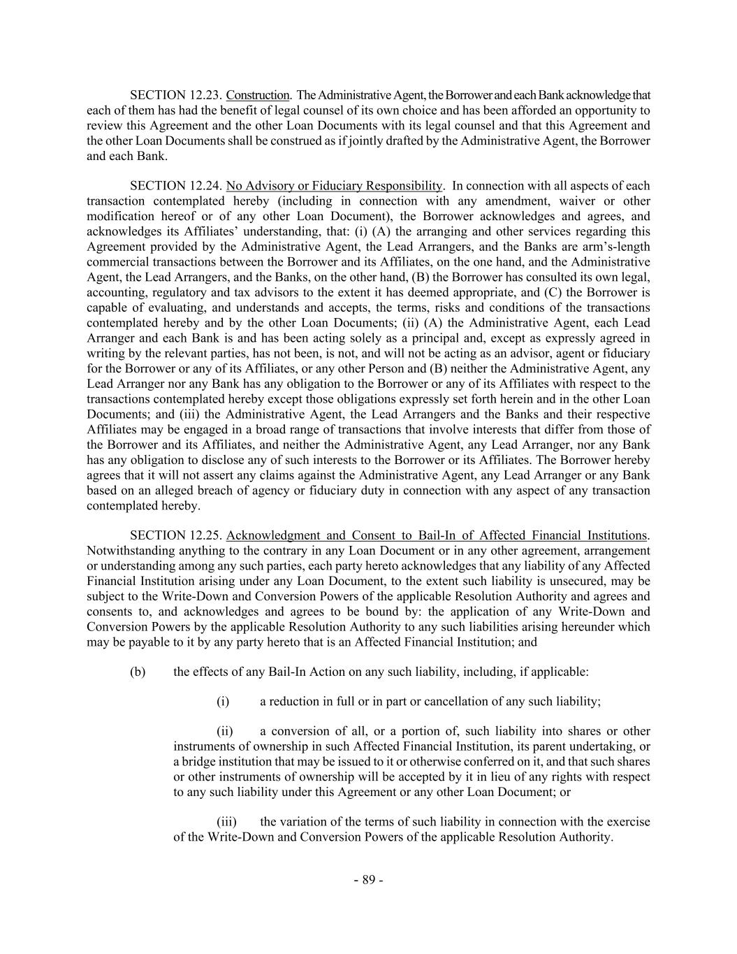 - 89 - SECTION 12.23. Construction. The Administrative Agent, the Borrower and each Bank acknowledge that each of them has had the benefit of legal counsel of its own choice and has been afforded an opportunity to review this Agreement and the other Loan Documents with its legal counsel and that this Agreement and the other Loan Documents shall be construed as if jointly drafted by the Administrative Agent, the Borrower and each Bank. SECTION 12.24. No Advisory or Fiduciary Responsibility. In connection with all aspects of each transaction contemplated hereby (including in connection with any amendment, waiver or other modification hereof or of any other Loan Document), the Borrower acknowledges and agrees, and acknowledges its Affiliates’ understanding, that: (i) (A) the arranging and other services regarding this Agreement provided by the Administrative Agent, the Lead Arrangers, and the Banks are arm’s-length commercial transactions between the Borrower and its Affiliates, on the one hand, and the Administrative Agent, the Lead Arrangers, and the Banks, on the other hand, (B) the Borrower has consulted its own legal, accounting, regulatory and tax advisors to the extent it has deemed appropriate, and (C) the Borrower is capable of evaluating, and understands and accepts, the terms, risks and conditions of the transactions contemplated hereby and by the other Loan Documents; (ii) (A) the Administrative Agent, each Lead Arranger and each Bank is and has been acting solely as a principal and, except as expressly agreed in writing by the relevant parties, has not been, is not, and will not be acting as an advisor, agent or fiduciary for the Borrower or any of its Affiliates, or any other Person and (B) neither the Administrative Agent, any Lead Arranger nor any Bank has any obligation to the Borrower or any of its Affiliates with respect to the transactions contemplated hereby except those obligations expressly set forth herein and in the other Loan Documents; and (iii) the Administrative Agent, the Lead Arrangers and the Banks and their respective Affiliates may be engaged in a broad range of transactions that involve interests that differ from those of the Borrower and its Affiliates, and neither the Administrative Agent, any Lead Arranger, nor any Bank has any obligation to disclose any of such interests to the Borrower or its Affiliates. The Borrower hereby agrees that it will not assert any claims against the Administrative Agent, any Lead Arranger or any Bank based on an alleged breach of agency or fiduciary duty in connection with any aspect of any transaction contemplated hereby. SECTION 12.25. Acknowledgment and Consent to Bail-In of Affected Financial Institutions. Notwithstanding anything to the contrary in any Loan Document or in any other agreement, arrangement or understanding among any such parties, each party hereto acknowledges that any liability of any Affected Financial Institution arising under any Loan Document, to the extent such liability is unsecured, may be subject to the Write-Down and Conversion Powers of the applicable Resolution Authority and agrees and consents to, and acknowledges and agrees to be bound by: the application of any Write-Down and Conversion Powers by the applicable Resolution Authority to any such liabilities arising hereunder which may be payable to it by any party hereto that is an Affected Financial Institution; and (b) the effects of any Bail-In Action on any such liability, including, if applicable: (i) a reduction in full or in part or cancellation of any such liability; (ii) a conversion of all, or a portion of, such liability into shares or other instruments of ownership in such Affected Financial Institution, its parent undertaking, or a bridge institution that may be issued to it or otherwise conferred on it, and that such shares or other instruments of ownership will be accepted by it in lieu of any rights with respect to any such liability under this Agreement or any other Loan Document; or (iii) the variation of the terms of such liability in connection with the exercise of the Write-Down and Conversion Powers of the applicable Resolution Authority.