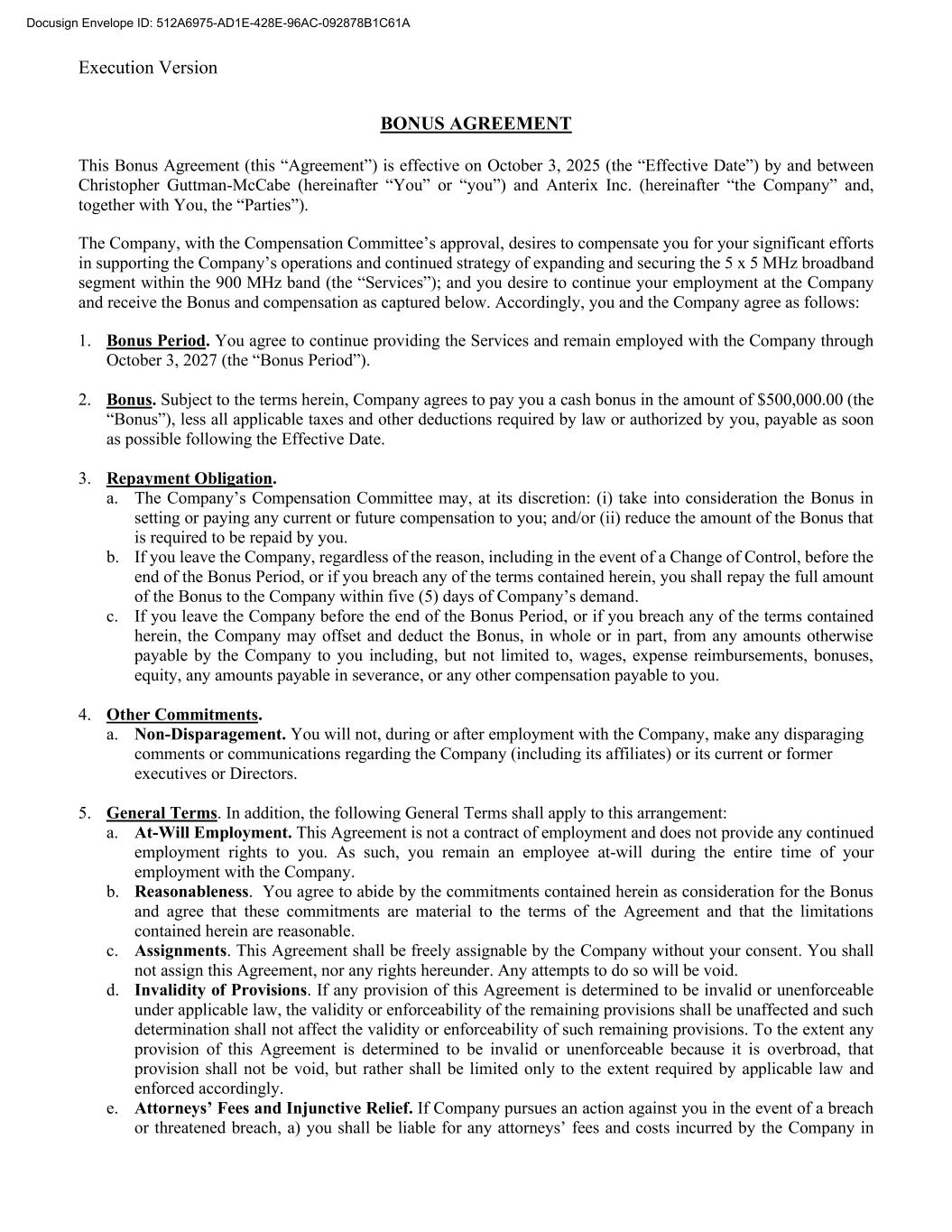 Execution Version BONUS AGREEMENT This Bonus Agreement (this “Agreement”) is effective on October 3, 2025 (the “Effective Date”) by and between Christopher Guttman-McCabe (hereinafter “You” or “you”) and Anterix Inc. (hereinafter “the Company” and, together with You, the “Parties”). The Company, with the Compensation Committee’s approval, desires to compensate you for your significant efforts in supporting the Company’s operations and continued strategy of expanding and securing the 5 x 5 MHz broadband segment within the 900 MHz band (the “Services”); and you desire to continue your employment at the Company and receive the Bonus and compensation as captured below. Accordingly, you and the Company agree as follows: 1. Bonus Period. You agree to continue providing the Services and remain employed with the Company through October 3, 2027 (the “Bonus Period”). 2. Bonus. Subject to the terms herein, Company agrees to pay you a cash bonus in the amount of $500,000.00 (the “Bonus”), less all applicable taxes and other deductions required by law or authorized by you, payable as soon as possible following the Effective Date. 3. Repayment Obligation. a. The Company’s Compensation Committee may, at its discretion: (i) take into consideration the Bonus in setting or paying any current or future compensation to you; and/or (ii) reduce the amount of the Bonus that is required to be repaid by you. b. If you leave the Company, regardless of the reason, including in the event of a Change of Control, before the end of the Bonus Period, or if you breach any of the terms contained herein, you shall repay the full amount of the Bonus to the Company within five (5) days of Company’s demand. c. If you leave the Company before the end of the Bonus Period, or if you breach any of the terms contained herein, the Company may offset and deduct the Bonus, in whole or in part, from any amounts otherwise payable by the Company to you including, but not limited to, wages, expense reimbursements, bonuses, equity, any amounts payable in severance, or any other compensation payable to you. 4. Other Commitments. a. Non-Disparagement. You will not, during or after employment with the Company, make any disparaging comments or communications regarding the Company (including its affiliates) or its current or former executives or Directors. 5. General Terms. In addition, the following General Terms shall apply to this arrangement: a. At-Will Employment. This Agreement is not a contract of employment and does not provide any continued employment rights to you. As such, you remain an employee at-will during the entire time of your employment with the Company. b. Reasonableness. You agree to abide by the commitments contained herein as consideration for the Bonus and agree that these commitments are material to the terms of the Agreement and that the limitations contained herein are reasonable. c. Assignments. This Agreement shall be freely assignable by the Company without your consent. You shall not assign this Agreement, nor any rights hereunder. Any attempts to do so will be void. d. Invalidity of Provisions. If any provision of this Agreement is determined to be invalid or unenforceable under applicable law, the validity or enforceability of the remaining provisions shall be unaffected and such determination shall not affect the validity or enforceability of such remaining provisions. To the extent any provision of this Agreement is determined to be invalid or unenforceable because it is overbroad, that provision shall not be void, but rather shall be limited only to the extent required by applicable law and enforced accordingly. e. Attorneys’ Fees and Injunctive Relief. If Company pursues an action against you in the event of a breach or threatened breach, a) you shall be liable for any attorneys’ fees and costs incurred by the Company in Docusign Envelope ID: 512A6975-AD1E-428E-96AC-092878B1C61A