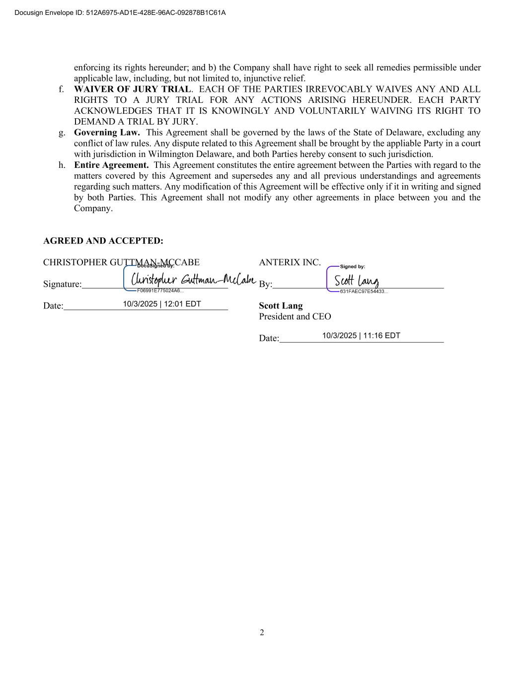 2 enforcing its rights hereunder; and b) the Company shall have right to seek all remedies permissible under applicable law, including, but not limited to, injunctive relief. f. WAIVER OF JURY TRIAL. EACH OF THE PARTIES IRREVOCABLY WAIVES ANY AND ALL RIGHTS TO A JURY TRIAL FOR ANY ACTIONS ARISING HEREUNDER. EACH PARTY ACKNOWLEDGES THAT IT IS KNOWINGLY AND VOLUNTARILY WAIVING ITS RIGHT TO DEMAND A TRIAL BY JURY. g. Governing Law. This Agreement shall be governed by the laws of the State of Delaware, excluding any conflict of law rules. Any dispute related to this Agreement shall be brought by the appliable Party in a court with jurisdiction in Wilmington Delaware, and both Parties hereby consent to such jurisdiction. h. Entire Agreement. This Agreement constitutes the entire agreement between the Parties with regard to the matters covered by this Agreement and supersedes any and all previous understandings and agreements regarding such matters. Any modification of this Agreement will be effective only if it in writing and signed by both Parties. This Agreement shall not modify any other agreements in place between you and the Company. AGREED AND ACCEPTED: CHRISTOPHER GUTTMAN-MCCABE ANTERIX INC. Signature: By: Date: Scott Lang President and CEO Date: Docusign Envelope ID: 512A6975-AD1E-428E-96AC-092878B1C61A 10/3/2025 | 12:01 EDT 10/3/2025 | 11:16 EDT