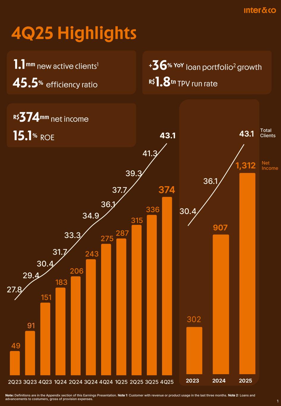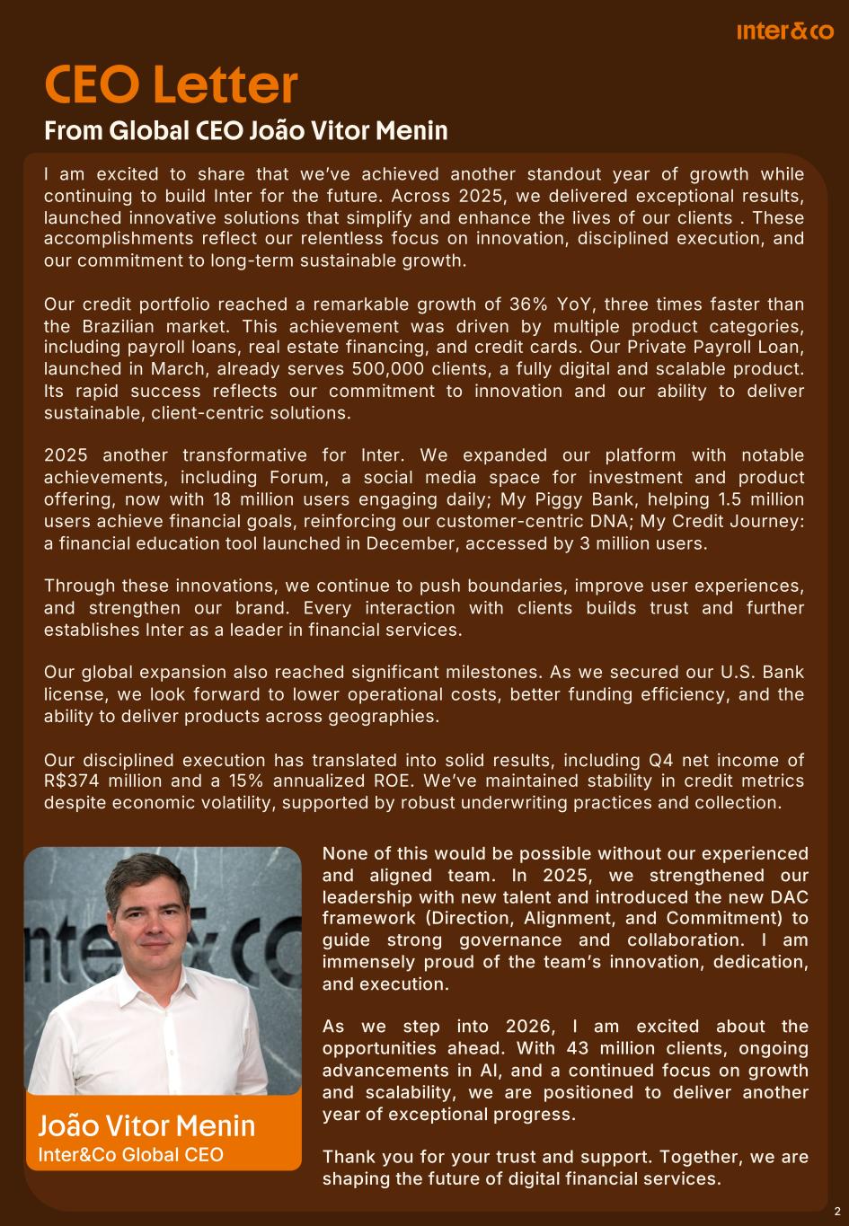 From Global CEO João Vitor Menin CEO Letter 2 I am excited to share that we’ve achieved another standout year of growth while continuing to build Inter for the future. Across 2025, we delivered exceptional results, launched innovative solutions that simplify and enhance the lives of our clients . These accomplishments reflect our relentless focus on innovation, disciplined execution, and our commitment to long-term sustainable growth. Our credit portfolio reached a remarkable growth of 36% YoY, three times faster than the Brazilian market. This achievement was driven by multiple product categories, including payroll loans, real estate financing, and credit cards. Our Private Payroll Loan, launched in March, already serves 500,000 clients, a fully digital and scalable product. Its rapid success reflects our commitment to innovation and our ability to deliver sustainable, client-centric solutions. 2025 another transformative for Inter. We expanded our platform with notable achievements, including Forum, a social media space for investment and product offering, now with 18 million users engaging daily; My Piggy Bank, helping 1.5 million users achieve financial goals, reinforcing our customer-centric DNA; My Credit Journey: a financial education tool launched in December, accessed by 3 million users. Through these innovations, we continue to push boundaries, improve user experiences, and strengthen our brand. Every interaction with clients builds trust and further establishes Inter as a leader in financial services. Our global expansion also reached significant milestones. As we secured our U.S. Bank license, we look forward to lower operational costs, better funding efficiency, and the ability to deliver products across geographies. Our disciplined execution has translated into solid results, including Q4 net income of R$374 million and a 15% annualized ROE. We’ve maintained stability in credit metrics despite economic volatility, supported by robust underwriting practices and collection. João Vitor Menin Inter&Co Global CEO None of this would be possible without our experienced and aligned team. In 2025, we strengthened our leadership with new talent and introduced the new DAC framework Direction, Alignment, and Commitment) to guide strong governance and collaboration. I am immensely proud of the team’s innovation, dedication, and execution. As we step into 2026, I am excited about the opportunities ahead. With 43 million clients, ongoing advancements in AI, and a continued focus on growth and scalability, we are positioned to deliver another year of exceptional progress. Thank you for your trust and support. Together, we are shaping the future of digital financial services.