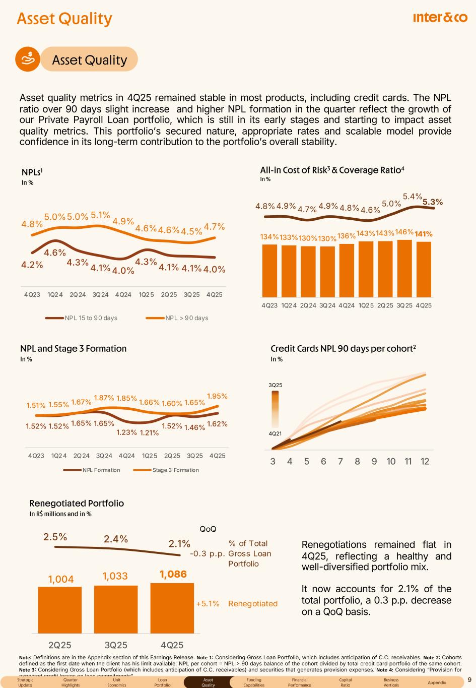 Asset Quality Asset Quality 1.52% 1.52% 1.65% 1.65% 1.23% 1.21% 1.52% 1.46% 1.62% 1.51% 1.55% 1.67% 1.87% 1.85% 1.66% 1.60% 1.65% 1.95% 0 .0 0% 1. 0 % 2 .0 0% 3 .0 0% 4 .0 0% 5 .0 0% 6 .0 0% 7 .0 0% 4Q23 1Q24 2Q24 3Q24 4Q24 1Q25 2Q25 3Q25 4Q25 NPL Formation Stage 3 Formation NPLs1 In % Note Definitions are in the Appendix section of this Earnings Release. Note 1 Considering Gross Loan Portfolio, which includes anticipation of C.C. receivables. Note 2 Cohorts defined as the first date when the client has his limit available. NPL per cohort NPL 90 days balance of the cohort divided by total credit card portfolio of the same cohort. Note 3 Considering Gross Loan Portfolio (which includes anticipation of C.C. receivables) and securities that generates provision expenses. Note 4: Considering “Provision for expected credit losses on loan commitments” Credit Cards NPL 90 days per cohort2 In % NPL and Stage 3 Formation In % Quarter Highlights Appendix Unit Economics Loan Portfolio Asset Quality Funding Capabilities Financial Performance Capital Ratio Business Verticals Strategic Update 9 Asset quality metrics in 4Q25 remained stable in most products, including credit cards. The NPL ratio over 90 days slight increase and higher NPL formation in the quarter reflect the growth of our Private Payroll Loan portfolio, which is still in its early stages and starting to impact asset quality metrics. This portfolio’s secured nature, appropriate rates and scalable model provide confidence in its long-term contribution to the portfolio’s overall stability. 3 4 5 6 7 8 9 10 11 12 134%133%130%130%136%143%143%146%141% 0 .0 % 2 0. 0% 4 0. 0% 6 0. 0% 8 0. 0% 10 0 .0 % 12 0 .0 % 14 0 .0 % 16 0 .0 % 18 0 .0 % 2 0 .0 % 4Q23 1Q24 2Q24 3Q24 4Q24 1Q25 2Q25 3Q25 4Q25 4.8%4.9% 4.7% 4.9%4.8%4.6% 5.0% 5.4%5.3% 2 .0 % 2 .5 % 3 .0 % 3 .5 % 4 .0 % 4 .5 % 5 .0 % 5 .5 % 6 .0 % 6 .5 % 7 .0 % All-in Cost of Risk3 & Coverage Ratio4 In % 4.2% 4.6% 4.3%4.1%4.0% 4.3%4.1% 4.1%4.0% 4.8% 5.0%5.0% 5.1% 4.9% 4.6%4.6%4.5%4.7% 3 .0 % 3 .5 % 4 .0 % 4 .5 % 5 .0 % 5 .5 % 6 .0 % 4Q23 1Q24 2Q24 3Q24 4Q24 1Q25 2Q25 3Q25 4Q25 NPL 15 to 90 days NPL > 90 days Renegotiations remained flat in 4Q25, reflecting a healthy and well-diversified portfolio mix. It now accounts for 2.1% of the total portfolio, a 0.3 p.p. decrease on a QoQ basis. Renegotiated Portfolio In R$ millions and in % QoQ -0.3 p.p. % of Total Gross Loan Portfolio +5.1% Renegotiated 2.5% 2.4% 2.1% 1,004 1,033 1,086 - 2 0 4 0 6 0 8 0 1 ,0 0 1 ,20 0 1 ,40 0 2Q25 3Q25 4Q25 3Q25 4Q21