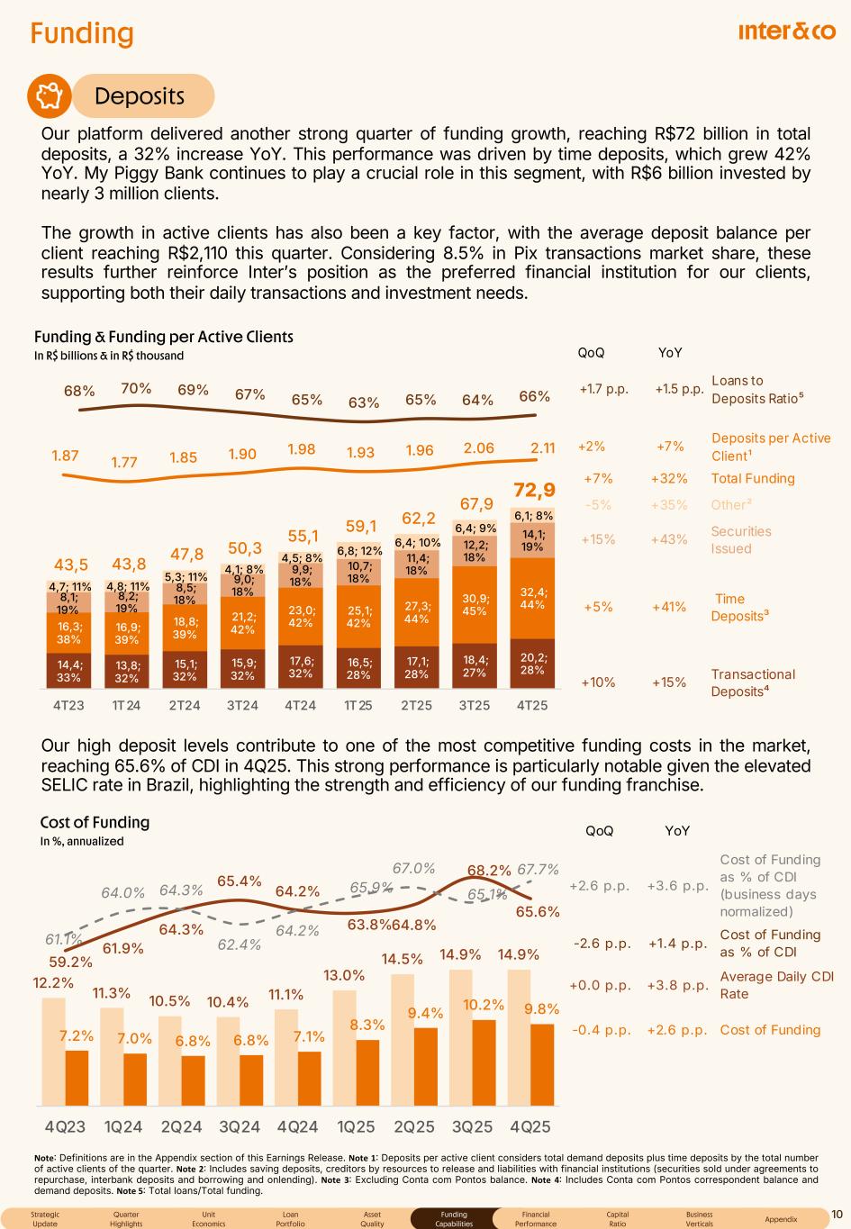 Funding Note Definitions are in the Appendix section of this Earnings Release. Note 1 Deposits per active client considers total demand deposits plus time deposits by the total number of active clients of the quarter. Note 2 Includes saving deposits, creditors by resources to release and liabilities with financial institutions (securities sold under agreements to repurchase, interbank deposits and borrowing and onlending). Note 3 Excluding Conta com Pontos balance. Note 4 Includes Conta com Pontos correspondent balance and demand deposits. Note 5 Total loans/Total funding. Cost of Funding In %, annualized Quarter Highlights Appendix Unit Economics Loan Portfolio Asset Quality Funding Capabilities Financial Performance Capital Ratio Business Verticals Strategic Update 10 Our high deposit levels contribute to one of the most competitive funding costs in the market, reaching 65.6% of CDI in 4Q25. This strong performance is particularly notable given the elevated SELIC rate in Brazil, highlighting the strength and efficiency of our funding franchise. 12.2% 11.3% 10.5% 10.4% 11.1% 13.0% 14.5% 14.9% 14.9% 7.2% 7.0% 6.8% 6.8% 7.1% 8.3% 9.4% 10.2% 9.8% 59.2% 61.9% 64.3% 65.4% 64.2% 63.8%64.8% 68.2% 65.6% 61.1% 64.0% 64.3% 62.4% 64.2% 65.9% 67.0% 65.1% 67.7% 2.0% 7.0% 12.0% 17.0% 22.0 % 4Q23 1Q24 2Q24 3Q24 4Q24 1Q25 2Q25 3Q25 4Q25 QoQ YoY +2.6 p.p. +3.6 p.p. Cost of Funding as % of CDI (business days normalized) -2.6 p.p. +1.4 p.p. Cost of Funding as % of CDI +0.0 p.p. +3.8 p.p. Average Daily CDI Rate -0.4 p.p. +2.6 p.p. Cost of Funding 14,4; 33% 13,8; 32% 15,1; 32% 15,9; 32% 17,6; 32% 16,5; 28% 17,1; 28% 18,4; 27% 20,2; 28% 16,3; 38% 16,9; 39% 18,8; 39% 21,2; 42% 23,0; 42% 25,1; 42% 27,3; 44% 30,9; 45% 32,4; 44% 8,1; 19% 8,2; 19% 8,5; 18% 9,0; 18% 9,9; 18% 10,7; 18% 11,4; 18% 12,2; 18% 14,1; 19% 4,7; 11% 4,8; 11% 5,3; 11% 4,1; 8% 4,5; 8% 6,8; 12% 6,4; 10% 6,4; 9% 6,1; 8% 43,5 43,8 47,8 50,3 55,1 59,1 62,2 67,9 72,9 4T23 1T24 2T24 3T24 4T24 1T25 2T25 3T25 4T25 Deposits Funding & Funding per Active Clients In R$ billions & in R$ thousand Our platform delivered another strong quarter of funding growth, reaching R$72 billion in total deposits, a 32% increase YoY. This performance was driven by time deposits, which grew 42% YoY. My Piggy Bank continues to play a crucial role in this segment, with R$6 billion invested by nearly 3 million clients. The growth in active clients has also been a key factor, with the average deposit balance per client reaching R$2,110 this quarter. Considering 8.5% in Pix transactions market share, these results further reinforce Inter’s position as the preferred financial institution for our clients, supporting both their daily transactions and investment needs. 1.87 1.77 1.85 1.90 1.98 1.93 1.96 2.06 2.11 1 .70 1 .80 1 .90 2 .0 2 .10 2 .20 68% 70% 69% 67% 65% 63% 65% 64% 66% 6 0% 6 5% 7 0% 7 5% 8 0% QoQ YoY +1.7 p.p. +1.5 p.p. Loans to Deposits Ratio⁵ +2% +7% Deposits per Active Client¹ +7% +32% Total Funding -5% +35% Other² +15% +43% Securities Issued +5% +41% Time Deposits³ +10% +15% Transactional Deposits⁴