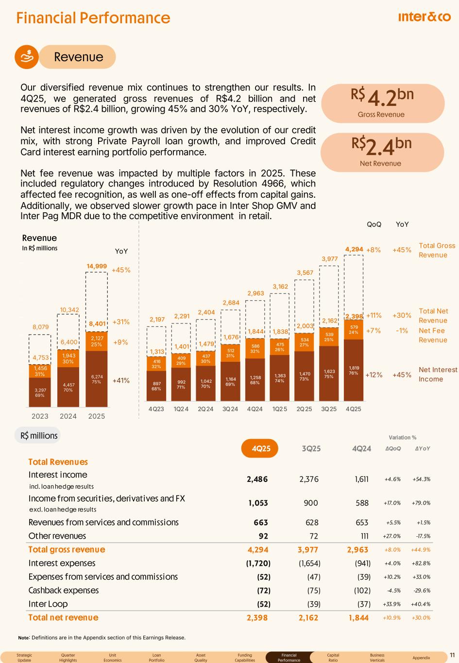 Financial Performance Revenue R$ millions Note Definitions are in the Appendix section of this Earnings Release. 4Q25 3Q25 4Q24 ∆QoQ ∆YoY Total Revenues Interest income incl. loan hedge results Income from securities, derivatives and FX excl. loan hedge results Revenues from services and commissions 663 628 653 +5.5% +1.5% Other revenues 92 72 111 +27.0% -17.5% Total gross revenue 4,294 3,977 2,963 +8.0% +44.9% Interest expenses (1,720) (1,654) (941) +4.0% +82.8% Expenses from services and commissions (52) (47) (39) +10.2% +33.0% Cashback expenses (72) (75) (102) -4.5% -29.6% Inter Loop (52) (39) (37) +33.9% +40.4% Total net revenue 2,398 2,162 1,844 +10.9% +30.0% Variation % 2,486 2,376 1,611 +4.6% +54.3% 1,053 900 588 +17.0% +79.0% QoQ YoY +8% +45% Total Gross Revenue +11% +30% Total Net Revenue +7% -1% Net Fee Revenue +12% +45% Net Interest Income 897 68% 992 71% 1,042 70% 1,164 69% 1,258 68% 1,363 74% 1,470 73% 1,623 75% 1,819 76% 416 32% 409 29% 437 30% 512 31% 586 32% 475 26% 534 27% 539 25% 579 24% 1,313 1,401 1,479 1,676 1,844 1,838 2,003 2,162 2,398 2,197 2,291 2,404 2,684 2,963 3,162 3,567 3,977 4,294 4Q23 1Q24 2Q24 3Q24 4Q24 1Q25 2Q25 3Q25 4Q25 Quarter Highlights Appendix Unit Economics Loan Portfolio Asset Quality Funding Capabilities Financial Performance Capital Ratio Business Verticals Strategic Update R$ 4.2bn Gross Revenue R$2.4bn Net Revenue 11 Our diversified revenue mix continues to strengthen our results. In 4Q25, we generated gross revenues of R$4.2 billion and net revenues of R$2.4 billion, growing 45% and 30% YoY, respectively. Net interest income growth was driven by the evolution of our credit mix, with strong Private Payroll loan growth, and improved Credit Card interest earning portfolio performance. Net fee revenue was impacted by multiple factors in 2025. These included regulatory changes introduced by Resolution 4966, which affected fee recognition, as well as one-off effects from capital gains. Additionally, we observed slower growth pace in Inter Shop GMV and Inter Pag MDR due to the competitive environment in retail. Revenue In R$ millions 3,297 69% 4,457 70% 6,274 75% 1,456 31% 1,943 30% 2,127 25% 4,753 6,400 8,401 8,079 10,342 14,999 - 2 ,0 00 4 ,0 00 6 ,0 00 8 ,0 00 10 ,0 00 12 ,0 00 14 ,0 00 16 ,0 00 2023 2024 2025 YoY +45% +31% +9% +41%