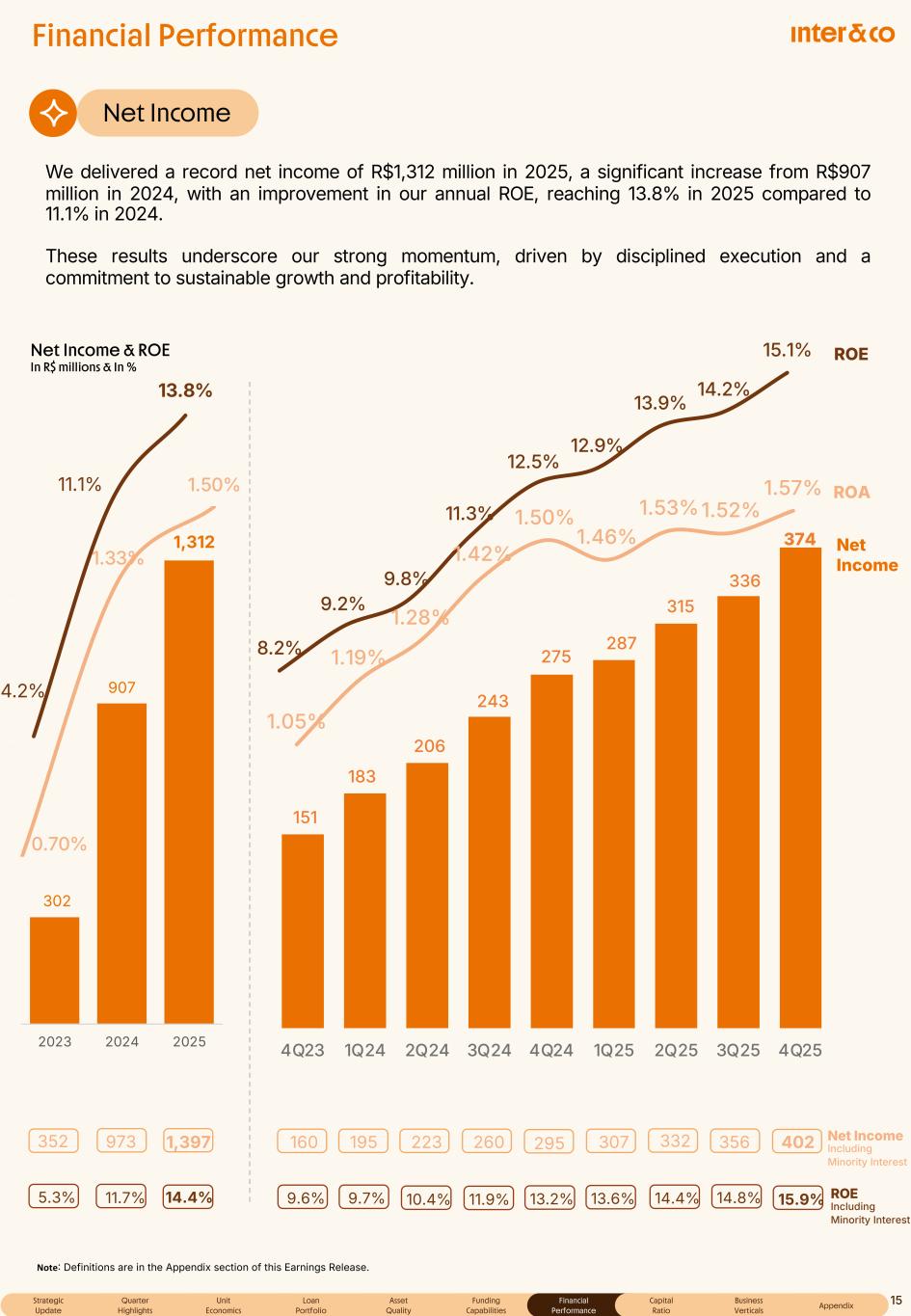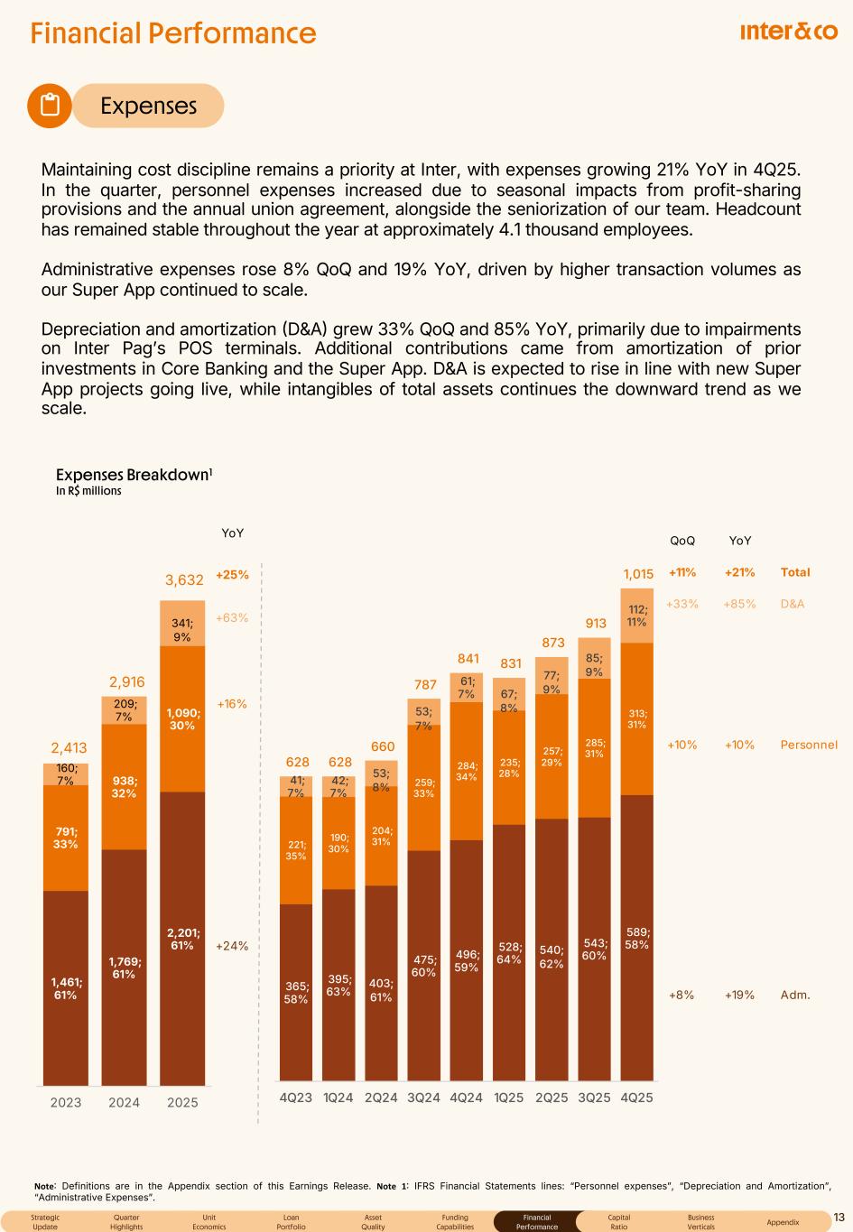 Financial Performance Expenses Note Definitions are in the Appendix section of this Earnings Release. Note 1 IFRS Financial Statements lines: “Personnel expenses”, “Depreciation and Amortization”, “Administrative Expenses”. Quarter Highlights Appendix Unit Economics Loan Portfolio Asset Quality Funding Capabilities Financial Performance Capital Ratio Business Verticals Strategic Update 13 Maintaining cost discipline remains a priority at Inter, with expenses growing 21% YoY in 4Q25. In the quarter, personnel expenses increased due to seasonal impacts from profit-sharing provisions and the annual union agreement, alongside the seniorization of our team. Headcount has remained stable throughout the year at approximately 4.1 thousand employees. Administrative expenses rose 8% QoQ and 19% YoY, driven by higher transaction volumes as our Super App continued to scale. Depreciation and amortization D&A grew 33% QoQ and 85% YoY, primarily due to impairments on Inter Pag’s POS terminals. Additional contributions came from amortization of prior investments in Core Banking and the Super App. D&A is expected to rise in line with new Super App projects going live, while intangibles of total assets continues the downward trend as we scale. QoQ YoY +11% +21% Total +33% +85% D&A +10% +10% Personnel +8% +19% Adm. Expenses Breakdown1 In R$ millions 365; 58% 395; 63% 403; 61% 475; 60% 496; 59% 528; 64% 540; 62% 543; 60% 589; 58% 221; 35% 190; 30% 204; 31% 259; 33% 284; 34% 235; 28% 257; 29% 285; 31% 313; 31% 41; 7% 42; 7% 53; 8% 53; 7% 61; 7% 67; 8% 77; 9% 85; 9% 112; 11% 628 628 660 787 841 831 873 913 1,015 - 2 0 0 4 0 0 6 0 0 8 0 0 1 ,0 0 1 ,2 0 4Q23 1Q24 2Q24 3Q24 4Q24 1Q25 2Q25 3Q25 4Q25 1,461; 61% 1,769; 61% 2,201; 61% 791; 33% 938; 32% 1,090; 30% 160; 7% 209; 7% 341; 9% 2,413 2,916 3,632 2023 2024 2025 YoY +25% +63% +16% +24%