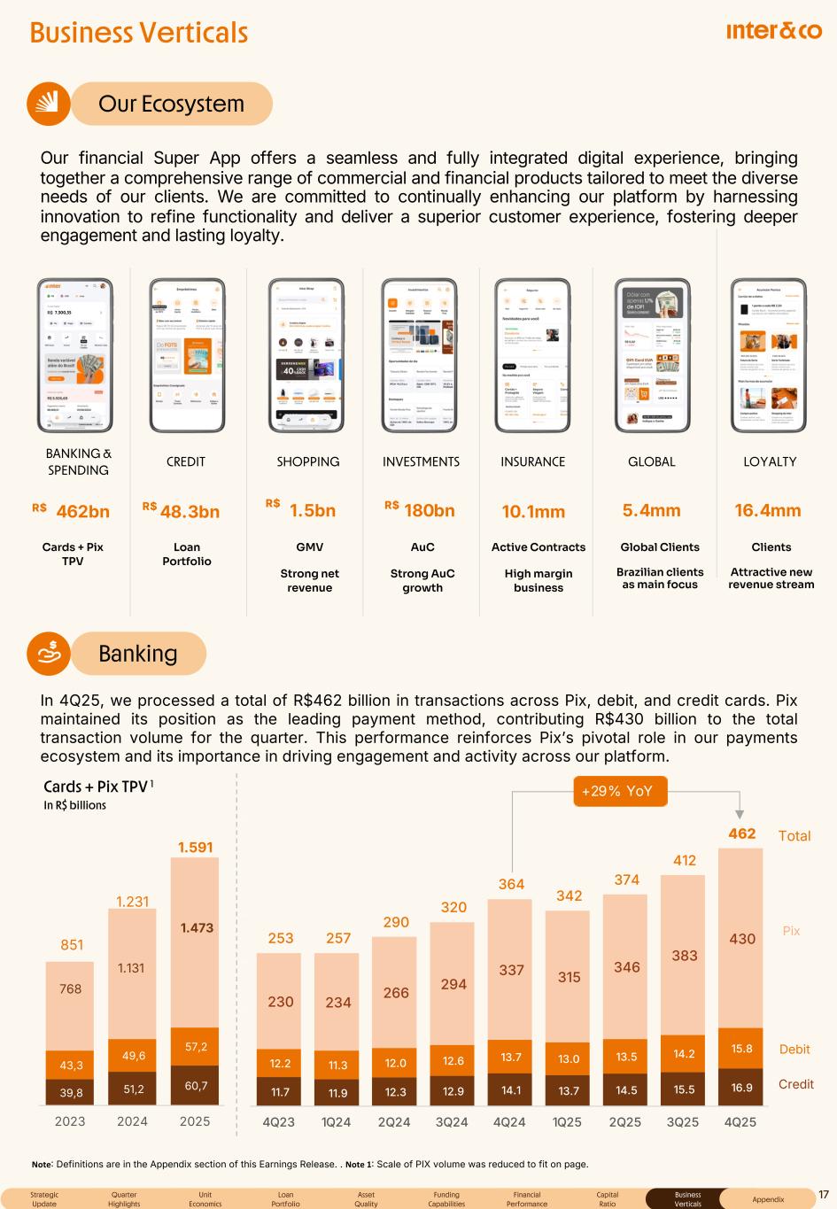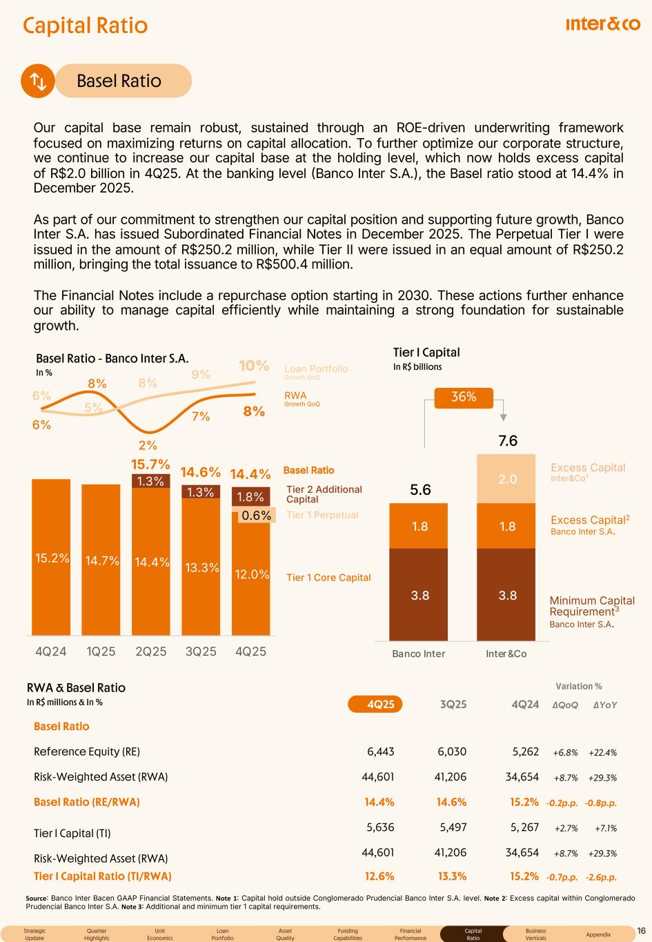 15.2% 14.7% 14.4% 13.3% 12.0% 0.6% 1.3% 1.3% 1.8% 15.7% 14.6% 14.4% 0 .0 % 2 .0 % 4 .0 % 6 .0 % 8 .0 % 10 .0 % 12 .0 % 14 .0 % 16 .0 % 18 .0 % 4Q24 1Q25 2Q25 3Q25 4Q25 Capital Ratio Basel Ratio Our capital base remain robust, sustained through an ROE-driven underwriting framework focused on maximizing returns on capital allocation. To further optimize our corporate structure, we continue to increase our capital base at the holding level, which now holds excess capital of R$2.0 billion in 4Q25. At the banking level Banco Inter S.A.), the Basel ratio stood at 14.4% in December 2025. As part of our commitment to strengthen our capital position and supporting future growth, Banco Inter S.A. has issued Subordinated Financial Notes in December 2025. The Perpetual Tier I were issued in the amount of R$250.2 million, while Tier II were issued in an equal amount of R$250.2 million, bringing the total issuance to R$500.4 million. The Financial Notes include a repurchase option starting in 2030. These actions further enhance our ability to manage capital efficiently while maintaining a strong foundation for sustainable growth. Loan Portfolio Growth QoQ RWA Growth QoQ RWA & Basel Ratio In R$ millions & In % Minimum Capital Requirement3 Banco Inter S.A. Excess Capital2 Banco Inter S.A. Source Banco Inter Bacen GAAP Financial Statements. Note 1 Capital hold outside Conglomerado Prudencial Banco Inter S.A. level. Note 2 Excess capital within Conglomerado Prudencial Banco Inter S.A. Note 3 Additional and minimum tier 1 capital requirements. 6% 8% 2% 7% 8% 6% 5% 8% 9% 10% 0% 2% 4% 6% 8% 10% 12% 3.8 3.8 1.8 1.8 2.0 5.6 7.6 - 1 .0 2 .0 3 .0 4 .0 5 .0 6 .0 7 .0 8 .0 9 .0 Banco Inter Inter&Co Excess Capital Inter&Co1 Quarter Highlights Appendix Unit Economics Loan Portfolio Asset Quality Funding Capabilities Financial Performance Capital Ratio Business Verticals Strategic Update 16 Tier 1 Core Capital Tier 2 Additional Capital Basel Ratio Tier I Capital In R$ billions 36% Variation % 4Q25 3Q25 4Q24 ∆QoQ ∆YoY Basel Ratio Reference Equity (RE) 6,443 6,030 5,262 +6.8% +22.4% Risk-Weighted Asset (RWA) 44,601 41,206 34,654 +8.7% +29.3% Basel Ratio (RE/RWA) 14.4% 14.6% 15.2% -0.2p.p. -0.8p.p. Tier I Capital (TI) 5,636 5,497 5, 267 +2.7% +7.1% Risk-Weighted Asset (RWA) 44,601 41,206 34,654 +8.7% +29.3% Tier I Capital Ratio (TI/RWA) 12.6% 13.3% 15.2% -0.7p.p. -2.6p.p. Tier 1 Perpetual Basel Ratio - Banco Inter S.A. In %