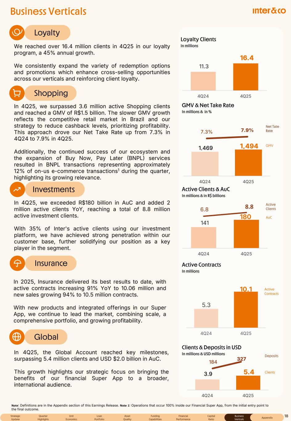 Business Verticals Loyalty Shopping Investments Insurance Global GMV & Net Take Rate In millions & in % Active Clients & AuC In millions & in R$ billions Loyalty Clients In millions Note Definitions are in the Appendix section of this Earnings Release. Note 1 Operations that occur 100% inside our Financial Super App, from the initial entry point to the final outcome. Active Clients AuC 141 180 6.8 8.8 3 0 .0 5 0 .0 7 0. 0 9 0 .0 1 10 .0 1 30 .0 1 50 .0 1 70 .0 1 90 .0 2 10 .0 2 3 0. 4Q24 4Q25 11.3 16.4 0 .0 2 .0 4 .0 6 .0 8 .0 10 .0 12 .0 14 .0 16 .0 18 .0 2 0. 0 4Q24 4Q25 Quarter Highlights Appendix Unit Economics Loan Portfolio Asset Quality Funding Capabilities Financial Performance Capital Ratio Business Verticals Strategic Update Deposits Clients 18 Clients & Deposits in USD In millions & USD millions In 2025, Insurance delivered its best results to date, with active contracts increasing 91% YoY to 10.06 million and new sales growing 94% to 10.5 million contracts. With new products and integrated offerings in our Super App, we continue to lead the market, combining scale, a comprehensive portfolio, and growing profitability. In 4Q25, the Global Account reached key milestones, surpassing 5.4 million clients and USD $2.0 billion in AuC. This growth highlights our strategic focus on bringing the benefits of our financial Super App to a broader, international audience. In 4Q25, we surpassed 3.6 million active Shopping clients and reached a GMV of R$1.5 billion. The slower GMV growth reflects the competitive retail market in Brazil and our strategy to reduce cashback levels, prioritizing profitability. This approach drove our Net Take Rate up from 7.3% in 4Q24 to 7.9% in 4Q25. Additionally, the continued success of our ecosystem and the expansion of Buy Now, Pay Later BNPL services resulted in BNPL transactions representing approximately 12% of on-us e-commerce transactions1 during the quarter, highlighting its growing relevance. In 4Q25, we exceeded R$180 billion in AuC and added 2 million active clients YoY, reaching a total of 8.8 million active investment clients. With 35% of Inter's active clients using our investment platform, we have achieved strong penetration within our customer base, further solidifying our position as a key player in the segment. We reached over 16.4 million clients in 4Q25 in our loyalty program, a 45% annual growth. We consistently expand the variety of redemption options and promotions which enhance cross-selling opportunities across our verticals and reinforcing client loyalty. Active Contracts Net Tate Rate GMV 5.3 10.1 4Q24 4Q25 1,469 1,494 4Q24 4Q25 7.3% 7.9% Active Contracts In millions 184 327 - 5 0. 1 0 .0 1 50 .0 2 0 .0 2 50 .0 3 0 .0 3 50 .0 3.9 5.4 0 .8 1 .3 1 .8 2 .3 2 .8 3 .3 3 .8 4 .3 4 .8 4Q24 4Q25