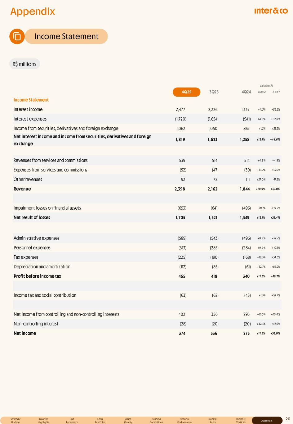 Appendix Balance Sheet R$ millions 12/31/2025 09/30/2025 12/31/2024 ∆QoQ ∆YoY Balance Sheet Assets Cash and equivalents 3,802 5,695 1,108 -33.3% +243.0% Amounts due from financial institutions 4,600 3,276 6,195 +40.4% -25.7% Compulsory deposits 7,868 7,073 5,285 +11.2% +48.9% Securities 29,010 27,078 23,900 +7.1% +21.4% Derivative financial instruments 59 2 1 +2263.2% +10368.2% Net loans and advances to customers 45,251 41,114 33,327 +10.1% +35.8% Non-current assets held-for-sale 366 314 235 +16.8% +56.2% Equity accounted investees 10 10 10 +0.0% -0.0% Property and equipment 381 367 370 +3.8% +3.1% Intangible assets 2,024 2,007 1,836 +0.9% +10.2% Deferred tax assets 1,789 1,703 1,705 +5.1% +4.9% Variation % Other assets 3,450 3,169 2,486 +8.9% +38.8% Total assets 98,612 91,809 76,458 +7.4% +29.0% Liabilities Deposits from customers 54,883 51,496 42,803 +6.6% +28.2% Deposits from banks 14,586 14,253 11,320 +2.3% +28.9% Securities issued 14,127 12,242 9,890 +15.4% +42.8% Derivative financial liabilities 54 23 70 +130.6% -22.7% Other liabilities 2,629 2,342 2,386 +12.2% +10.2% Total Liabilities 88,219 82,000 67,386 +7.6% +30.9% Equity Equity attributable to owners of the Company 10,170 9,680 8,895 +5.1% +14.3% Non-controlling interest 223 128 177 +74.1% +26.1% Total shareholder's equity 10,393 9,808 9,072 +6.0% +14.6% Total liabilities and equity 98,612 91,809 76,458 +7.4% +29.0% 19Quarter Highlights Appendix Unit Economics Loan Portfolio Asset Quality Funding Capabilities Financial Performance Capital Ratio Business Verticals Strategic Update