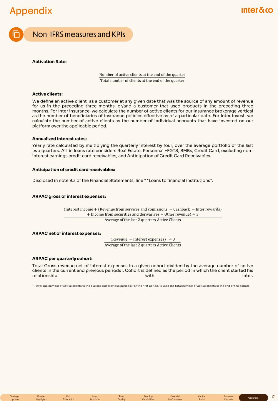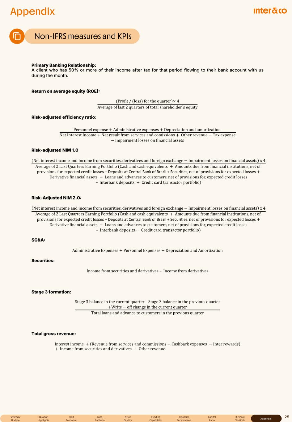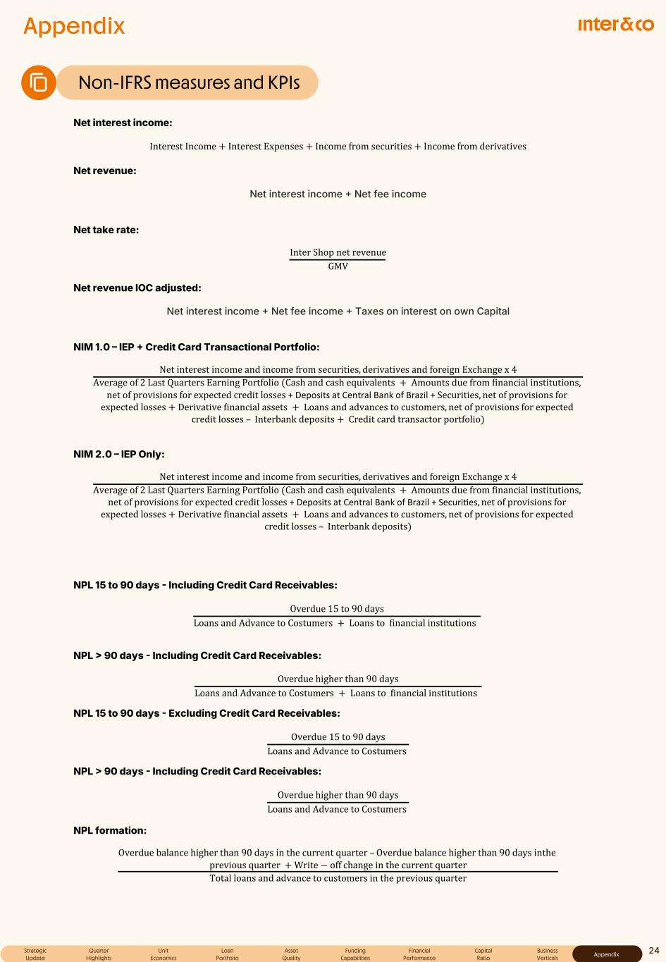 Appendix Non-IFRS measures and KPIs Earning portfolio IEP Earnings Portfolio includes “Amounts due from financial institutions” + “Loans and advances to customers” + “Securities” + “Derivatives” from the IFRS Balance Sheet Efficiency ratio: Personnel expense + Administrative expenses + Depreciation and amortization Net Interest Income + Net result from services and comissions + Other revenue − Tax expenses + Taxes on interest on own capital Fee income ratio: Net result from services and commissions + Other revenue Net Interest Income + Net result from services and comissions + Other revenue − Tax expense Funding: Demand Deposits + Time Deposits + Securities Issued + Savings Deposits + Creditors by Resources to Release + Securities sold under agreements to repurchase Interbank deposits Borrowing and onlending Global Clients: Includes Brazilian Global Account clients, US clients and international investors. Gross loan portfolio: Loans and Advance to Customers + Loans to financial institutions Gross merchandise volume GMV Gross merchandise value, or GMV, for a given period as the total value of all sales made or initiated through our Inter Shop & Commerce Plus platform managed by Inter Shop & Commerce Plus. Gross take rate: Inter Shop gross revenue GMV Loan portfolio: "Loans and Advance to Customers", gross of provision for expected losses Margin per active client gross of interest expenses: ARPAC gross of interest expenses – Cost to Serve Margin per active client net of interest expenses: ARPAC net of interest expenses – Cost to Serve Net fee income: Net result from services and commissions Other Revenue Revenue foreign exchange 23Quarter Highlights Appendix Unit Economics Loan Portfolio Asset Quality Funding Capabilities Financial Performance Capital Ratio Business Verticals Strategic Update