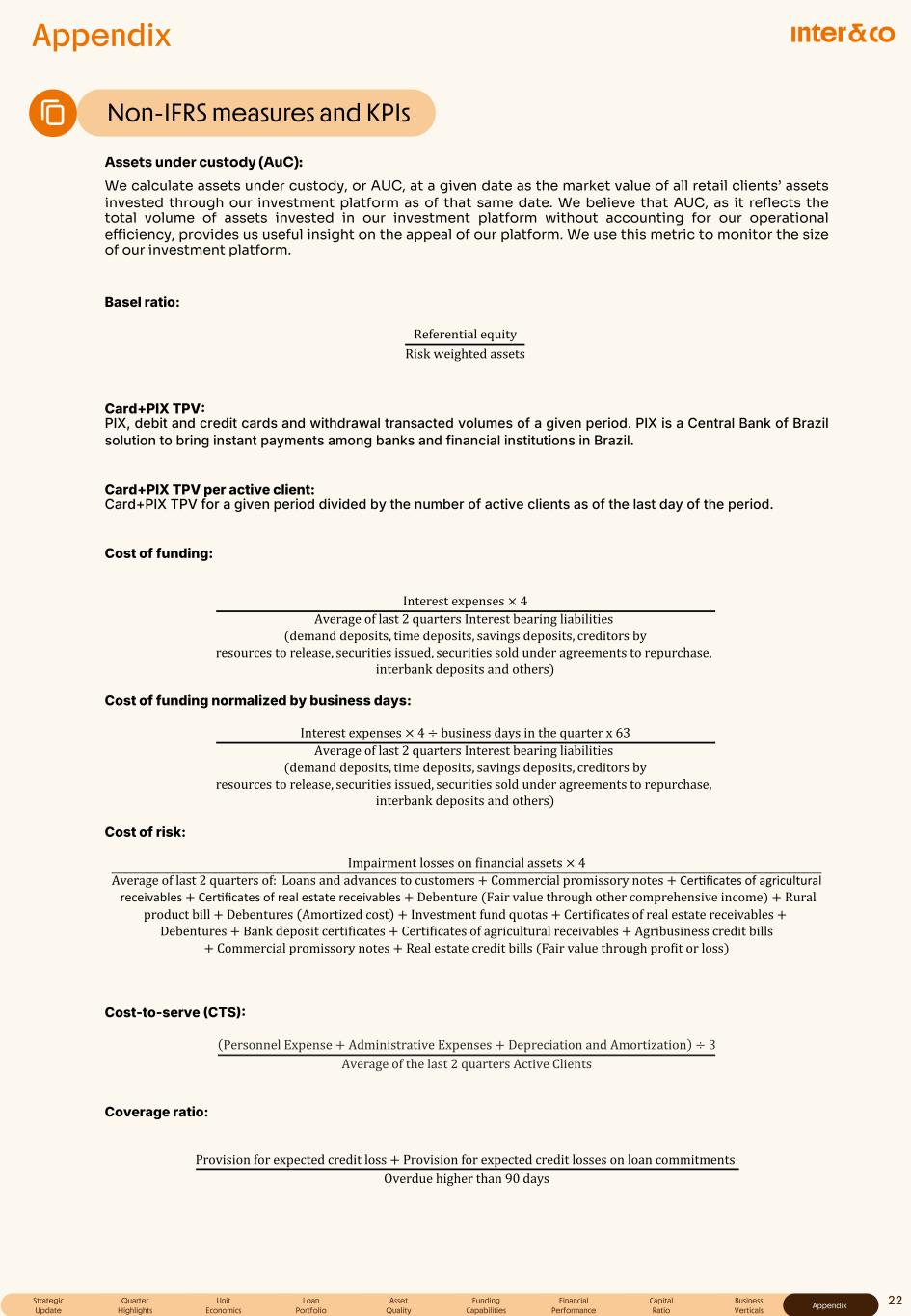 Appendix Non-IFRS measures and KPIs Activation Rate: Number of active clients at the end of the quarter Total number of clients at the end of the quarter Active clients: We define an active client as a customer at any given date that was the source of any amount of revenue for us in the preceding three months, or/and a customer that used products in the preceding three months. For Inter insurance, we calculate the number of active clients for our insurance brokerage vertical as the number of beneficiaries of insurance policies effective as of a particular date. For Inter Invest, we calculate the number of active clients as the number of individual accounts that have invested on our platform over the applicable period. Annualized interest rates: Yearly rate calculated by multiplying the quarterly interest by four, over the average portfolio of the last two quarters. All-in loans rate considers Real Estate, Personnal +FGTS, SMBs, Credit Card, excluding non- interest earnings credit card receivables, and Anticipation of Credit Card Receivables. Anticipation of credit card receivables: Disclosed in note 9.a of the Financial Statements, line " "Loans to financial institutions”. ARPAC gross of interest expenses: (Interest income + (Revenue from services and comissions − Cashback − Inter rewards) + Income from securities and derivarives + Other revenue) ÷ 3 Average of the last 2 quarters Active Clients ARPAC net of interest expenses: (Revenue − Interest expenses) ÷ 3 Average of the last 2 quarters Active Clients ARPAC per quarterly cohort: Total Gross revenue net of interest expenses in a given cohort divided by the average number of active clients in the current and previous periods1. Cohort is defined as the period in which the client started his relationship with Inter. 1 - Average number of active clients in the current and previous periods: For the first period, is used the total number of active clients in the end of the period. 21Quarter Highlights Appendix Unit Economics Loan Portfolio Asset Quality Funding Capabilities Financial Performance Capital Ratio Business Verticals Strategic Update