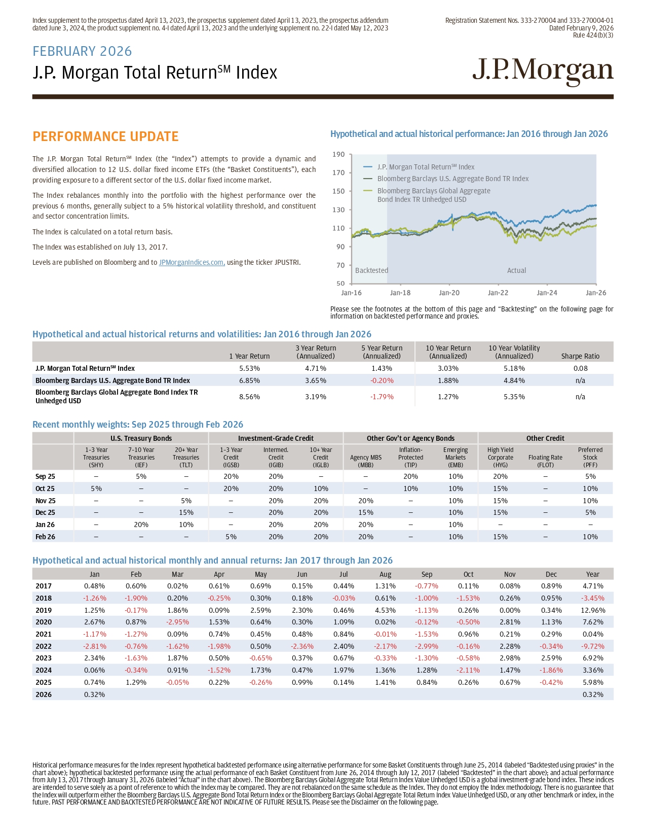 Index supplement to the prospectus dated April 13, 2023, the prospectus supplement dated April 13, 2023, the prospectus adden dum dated June 3, 2024, the product supplement no. 4 - I dated April 13, 2023 and the underlying supplement no. 22 - I dated May 12, 202 3 Registration Statement Nos. 333 - 270004 and 333 - 270004 - 01 Dated February 9, 2026 Rule 424(b)(3) PERFORMANCE UPDATE The J.P. Morgan Total Return SM Index (the “Index”) attempts to provide a dynamic and diversified allocation to 12 U.S. dollar fixed income ETFs (the “Basket Constituents”), each providing exposure to a different sector of the U.S. dollar fixed income market. The Index rebalances monthly into the portfolio with the highest performance over the previous 6 months, generally subject to a 5% historical volatility threshold, and constituent and sector concentration limits. The Index is calculated on a total return basis. The Index was established on July 13, 2017. Levels are published on Bloomberg and to JPMorganIndices.com, using the ticker JPUSTRI. Hypothetical and actual historical performance: Jan 2016 through Jan 2026 Please see the footnotes at the bottom of this page and “Backtesting” on the following page for information on backtested performance and proxies. J.P.Morgan Total Return SM Index Bloomberg Barclays U.S.Aggregate Bond TR Index Bloomberg Barclays Global Aggregate Bond Index TR Unhedged USD Backtested Actual Hypothetical and actual historical returns and volatilities: Jan 2016 through Jan 2026 1 Year Return 3 Year Return (Annualized) 5 Year Return (Annualized) 10 Year Return (Annualized) 10 Year Volatility (Annualized) Sharpe Ratio J.P. Morgan Total Return SM Index 5.53% 4.71% 1.43% 3.03% 5.18% 0.08 Bloomberg Barclays U.S. Aggregate Bond TR Index 6.85% 3.65% - 0.20% 1.88% 4.84% n/a Bloomberg Barclays Global Aggregate Bond Index TR Unhedged USD 8.56% 3.19% - 1.79% 1.27% 5.35% n/a Recent monthly weights: Sep 2025 through Feb 2026 U.S. Treasury Bonds Investment - Grade Credit Other Gov’t or Agency Bonds Other Credit 1 – 3 Year Treasuries (SHY) 7 – 10 Year Treasuries (IEF) 20+ Year Treasuries (TLT) 1 – 3 Year Credit (IGSB) Intermed. Credit (IGIB) 10+ Year Credit (IGLB) Agency MBS (MBB) Inflation - Protected (TIP) Emerging Markets (EMB) High Yield Corporate (HYG) Floating Rate (FLOT) Preferred Stock (PFF) Sep 25 — 5% — 20% 20% — — 20% 10% 20% — 5% Oct 25 5% — — 20% 20% 10% — 10% 10% 15% — 10% Nov 25 — — 5% — 20% 20% 20% — 10% 15% — 10% Dec 25 — — 15% — 20% 20% 15% — 10% 15% — 5% Jan 26 — 20% 10% — 20% 20% 20% — 10% — — — Feb 26 — — — 5% 20% 20% 20% — 10% 15% — 10% Hypothetical and actual historical monthly and annual returns: Jan 2017 through Jan 2026 Jan Feb Mar Apr May Jun Jul Aug Sep Oct Nov Dec Year 2017 0.48% 0.60% 0.02% 0.61% 0.69% 0.15% 0.44% 1.31% - 0.77% 0.11% 0.08% 0.89% 4.71% 2018 - 1.26% - 1.90% 0.20% - 0.25% 0.30% 0.18% - 0.03% 0.61% - 1.00% - 1.53% 0.26% 0.95% - 3.45% 2019 1.25% - 0.17% 1.86% 0.09% 2.59% 2.30% 0.46% 4.53% - 1.13% 0.26% 0.00% 0.34% 12.96% 2020 2.67% 0.87% - 2.95% 1.53% 0.64% 0.30% 1.09% 0.02% - 0.12% - 0.50% 2.81% 1.13% 7.62% 2021 - 1.17% - 1.27% 0.09% 0.74% 0.45% 0.48% 0.84% - 0.01% - 1.53% 0.96% 0.21% 0.29% 0.04% 2022 - 2.81% - 0.76% - 1.62% - 1.98% 0.50% - 2.36% 2.40% - 2.17% - 2.99% - 0.16% 2.28% - 0.34% - 9.72% 2023 2.34% - 1.63% 1.87% 0.50% - 0.65% 0.37% 0.67% - 0.33% - 1.30% - 0.58% 2.98% 2.59% 6.92% 2024 0.06% - 0.34% 0.91% - 1.52% 1.73% 0.47% 1.97% 1.36% 1.28% - 2.11% 1.47% - 1.86% 3.36% 2025 0.74% 1.29% - 0.05% 0.22% - 0.26% 0.99% 0.14% 1.41% 0.84% 0.26% 0.67% - 0.42% 5.98% 2026 0.32% 0.32% Historical performance measures for the Index represent hypothetical backtested performance using alternative performance for so me Basket Constituents through June 25, 2014 (labeled “Backtested using proxies” in the chart above); hypothetical backtested performance using the actual performance of each Basket Constituent from June 26, 2014 thr ough July 12, 2017 (labeled “Backtested” in the chart above); and actual performance from July 13, 2017 through January 31, 2026 (labeled “Actual” in the chart above). The Bloomberg Barclays Global Aggregate To tal Return Index Value Unhedged USD is a global investment - grade bond index. These indices are intended to serve solely as a point of reference to which the Index may be compared. They are not rebalanced on the same sch edule as the Index. They do not employ the Index methodology. There is no guarantee that the Index will outperform either the Bloomberg Barclays U.S. Aggregate Bond Total Return Index or the Bloomberg Barclays Glob al Aggregate Total Return Index Value Unhedged USD, or any other benchmark or index, in the future. PAST PERFORMANCE AND BACKTESTED PERFORMANCE ARE NOT INDICATIVE OF FUTURE RESULTS. Please see the Disclaimer on the fo llo wing page. FEBRUARY 2026 J.P. Morgan Total Return SM Index