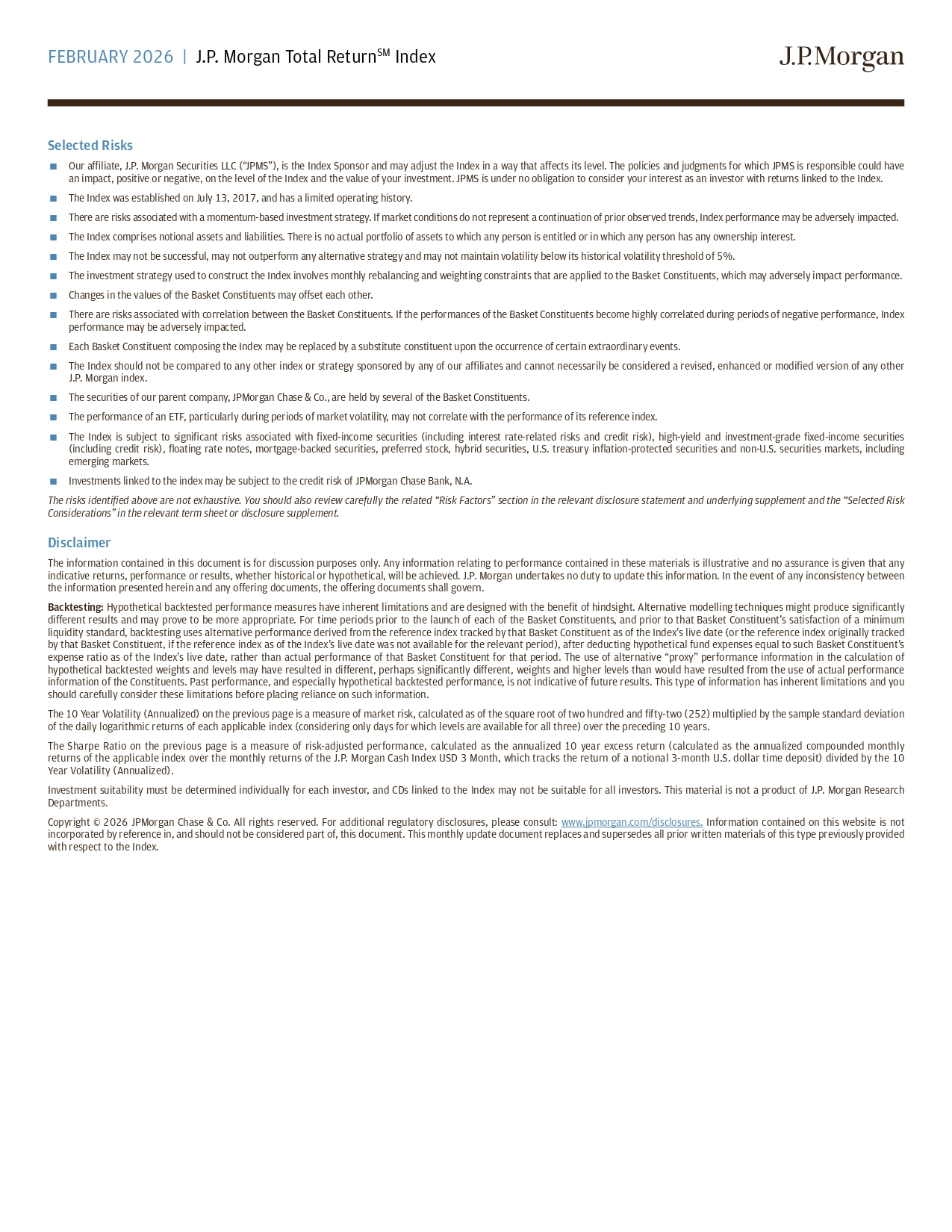 FEBRUARY 2026 | J.P. Morgan Total Return SM Index Selected Risks þÿ Our affiliate, J.P. Morgan Securities LLC (“JPMS”), is the Index Sponsor and may adjust the Index in a way that affects its l eve l. The policies and judgments for which JPMS is responsible could have an impact, positive or negative, on the level of the Index and the value of your investment. JPMS is under no obligation to c ons ider your interest as an investor with returns linked to the Index. þÿ The Index was established on July 13, 2017, and has a limited operating history. þÿ There are risks associated with a momentum - based investment strategy. If market conditions do not represent a continuation of pr ior observed trends, Index performance may be adversely impacted. þÿ The Index comprises notional assets and liabilities. There is no actual portfolio of assets to which any person is entitled o r i n which any person has any ownership interest. þÿ The Index may not be successful, may not outperform any alternative strategy and may not maintain volatility below its histor ica l volatility threshold of 5%. þÿ The investment strategy used to construct the Index involves monthly rebalancing and weighting constraints that are applied t o t he Basket Constituents, which may adversely impact performance. þÿ Changes in the values of the Basket Constituents may offset each other. þÿ There are risks associated with correlation between the Basket Constituents. If the performances of the Basket Constituents b eco me highly correlated during periods of negative performance, Index performance may be adversely impacted. þÿ Each Basket Constituent composing the Index may be replaced by a substitute constituent upon the occurrence of certain extrao rdi nary events. þÿ The Index should not be compared to any other index or strategy sponsored by any of our affiliates and cannot necessarily be con sidered a revised, enhanced or modified version of any other J.P. Morgan index. þÿ The securities of our parent company, JPMorgan Chase & Co., are held by several of the Basket Constituents. þÿ The performance of an ETF, particularly during periods of market volatility, may not correlate with the performance of its re fer ence index. þÿ The Index is subject to significant risks associated with fixed - income securities (including interest rate - related risks and cre dit risk), high - yield and investment - grade fixed - income securities (including credit risk), floating rate notes, mortgage - backed securities, preferred stock, hybrid securities, U.S. treasury infl ation - protected securities and non - U.S. securities markets, including emerging markets. þÿ Investments linked to the index may be subject to the credit risk of JPMorgan Chase Bank, N.A. The risks identified above are not exhaustive. You should also review carefully the related “Risk Factors” section in the rel eva nt disclosure statement and underlying supplement and the “Selected Risk Considerations” in the relevant term sheet or disclosure supplement. Disclaimer The information contained in this document is for discussion purposes only. Any information relating to performance contained in these materials is illustrative and no assurance is given that any indicative returns, performance or results, whether historical or hypothetical, will be achieved. J.P. Morgan undertakes no d uty to update this information. In the event of any inconsistency between the information presented herein and any offering documents, the offering documents shall govern. Backtesting: Hypothetical backtested performance measures have inherent limitations and are designed with the benefit of hindsight. Altern at ive modelling techniques might produce significantly different results and may prove to be more appropriate. For time periods prior to the launch of each of the Basket Constituen ts, and prior to that Basket Constituent’s satisfaction of a minimum liquidity standard, backtesting uses alternative performance derived from the reference index tracked by that Basket Constitu ent as of the Index’s live date (or the reference index originally tracked by that Basket Constituent, if the reference index as of the Index’s live date was not available for the relevant period), af ter deducting hypothetical fund expenses equal to such Basket Constituent’s expense ratio as of the Index’s live date, rather than actual performance of that Basket Constituent for that period. The use of alternative “proxy” performance information in the calculation of hypothetical backtested weights and levels may have resulted in different, perhaps significantly different, weights and highe r l evels than would have resulted from the use of actual performance information of the Constituents. Past performance, and especially hypothetical backtested performance, is not indicative of f utu re results. This type of information has inherent limitations and you should carefully consider these limitations before placing reliance on such information. The 10 Year Volatility (Annualized) on the previous page is a measure of market risk, calculated as of the square root of two hu ndred and fifty - two (252) multiplied by the sample standard deviation of the daily logarithmic returns of each applicable index (considering only days for which levels are available for all three ) o ver the preceding 10 years. The Sharpe Ratio on the previous page is a measure of risk - adjusted performance, calculated as the annualized 10 year excess ret urn (calculated as the annualized compounded monthly returns of the applicable index over the monthly returns of the J.P. Morgan Cash Index USD 3 Month, which tracks the return o f a notional 3 - month U.S. dollar time deposit) divided by the 10 Year Volatility (Annualized). Investment suitability must be determined individually for each investor, and CDs linked to the Index may not be suitable for al l investors. This material is not a product of J.P. 