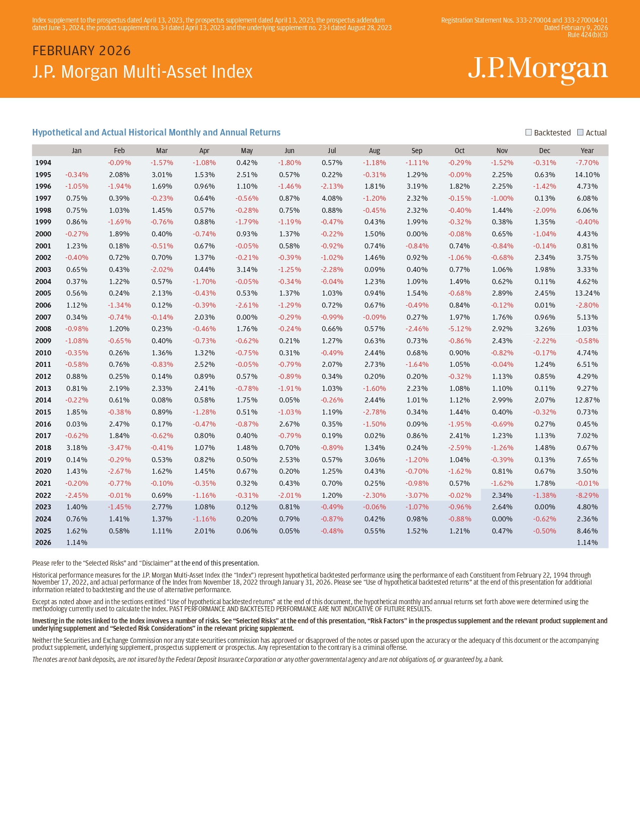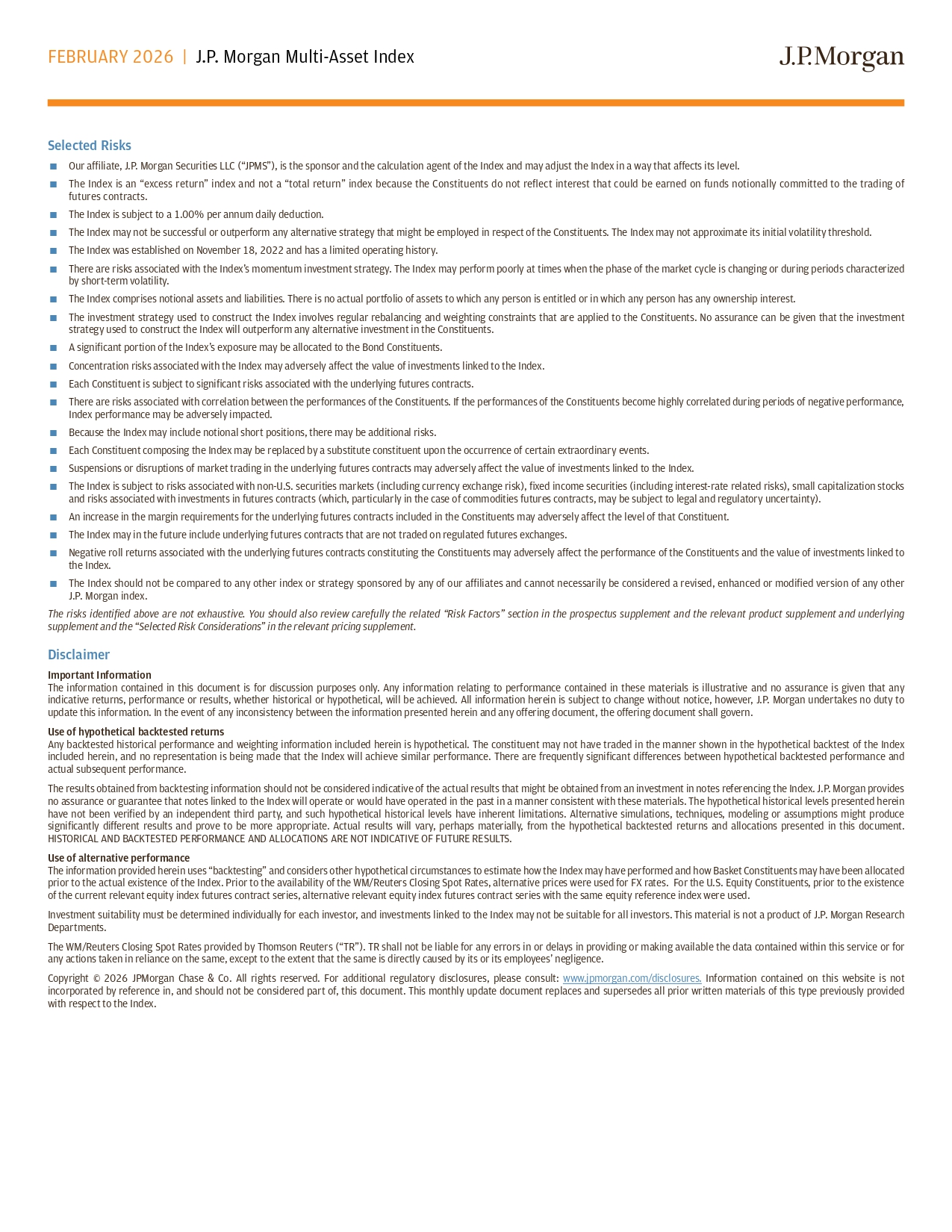 FEBRUARY 2026 | J.P. Morgan Multi - Asset Index Selected Risks þÿ Our affiliate, J.P. Morgan Securities LLC (“JPMS”), is the sponsor and the calculation agent of the Index and may adjust the Ind ex in a way that affects its level. þÿ The Index is an “excess return” index and not a “total return” index because the Constituents do not reflect interest that co uld be earned on funds notionally committed to the trading of futures contracts. þÿ The Index is subject to a 1.00% per annum daily deduction. þÿ The Index may not be successful or outperform any alternative strategy that might be employed in respect of the Constituents. Th e Index may not approximate its initial volatility threshold. þÿ The Index was established on November 18, 2022 and has a limited operating history. þÿ There are risks associated with the Index’s momentum investment strategy. The Index may perform poorly at times when the phas e o f the market cycle is changing or during periods characterized by short - term volatility. þÿ The Index comprises notional assets and liabilities. There is no actual portfolio of assets to which any person is entitled o r i n which any person has any ownership interest. þÿ The investment strategy used to construct the Index involves regular rebalancing and weighting constraints that are applied t o t he Constituents. No assurance can be given that the investment strategy used to construct the Index will outperform any alternative investment in the Constituents. þÿ A significant portion of the Index’s exposure may be allocated to the Bond Constituents. þÿ Concentration risks associated with the Index may adversely affect the value of investments linked to the Index. þÿ Each Constituent is subject to significant risks associated with the underlying futures contracts. þÿ There are risks associated with correlation between the performances of the Constituents. If the performances of the Constitu ent s become highly correlated during periods of negative performance, Index performance may be adversely impacted. þÿ Because the Index may include notional short positions, there may be additional risks. þÿ Each Constituent composing the Index may be replaced by a substitute constituent upon the occurrence of certain extraordinary ev ents. þÿ Suspensions or disruptions of market trading in the underlying futures contracts may adversely affect the value of investment s l inked to the Index. þÿ The Index is subject to risks associated with non - U.S. securities markets (including currency exchange risk), fixed income secur ities (including interest - rate related risks), small capitalization stocks and risks associated with investments in futures contracts (which, particularly in the case of commodities futures contracts, ma y be subject to legal and regulatory uncertainty). þÿ An increase in the margin requirements for the underlying futures contracts included in the Constituents may adversely affect th e level of that Constituent. þÿ The Index may in the future include underlying futures contracts that are not traded on regulated futures exchanges. þÿ Negative roll returns associated with the underlying futures contracts constituting the Constituents may adversely affect the pe rformance of the Constituents and the value of investments linked to the Index. þÿ The Index should not be compared to any other index or strategy sponsored by any of our affiliates and cannot necessarily be con sidered a revised, enhanced or modified version of any other J.P. Morgan index. The risks identified above are not exhaustive. You should also review carefully the related “Risk Factors” section in the pro spe ctus supplement and the relevant product supplement and underlying supplement and the “Selected Risk Considerations” in the relevant pricing supplement. Disclaimer Important Information The information contained in this document is for discussion purposes only. Any information relating to performance contained in these materials is illustrative and no assurance is given that any indicative returns, performance or results, whether historical or hypothetical, will be achieved. All information herein is s ubj ect to change without notice, however, J.P. Morgan undertakes no duty to update this information. In the event of any inconsistency between the information presented herein and any offering document , t he offering document shall govern. Use of hypothetical backtested returns Any backtested historical performance and weighting information included herein is hypothetical. The constituent may not have tr aded in the manner shown in the hypothetical backtest of the Index included herein, and no representation is being made that the Index will achieve similar performance. There are frequently si gni ficant differences between hypothetical backtested performance and actual subsequent performance. The results obtained from backtesting information should not be considered indicative of the actual results that might be obt ain ed from an investment in notes referencing the Index. J.P. Morgan provides no assurance or guarantee that notes linked to the Index will operate or would have operated in the past in a manner consiste nt with these materials. The hypothetical historical levels presented herein have not been verified by an independent third party, and such hypothetical historical levels have inherent limitations. Alte rna tive simulations, techniques, modeling or assumptions might produce significantly different results and prove to be more appropriate. Actual results will vary, perhaps materially, from the hypo the tical backtested returns and allocations presented in this document. HISTORICAL AND BACKTESTED PERFORMANCE AND ALLOCATIONS ARE NOT INDICATIVE OF FUTURE RESULTS. Use of alternative performance The information provided herein uses “backtesting” and considers other hypothetical circumstances to estimate how the Index m ay have performed 