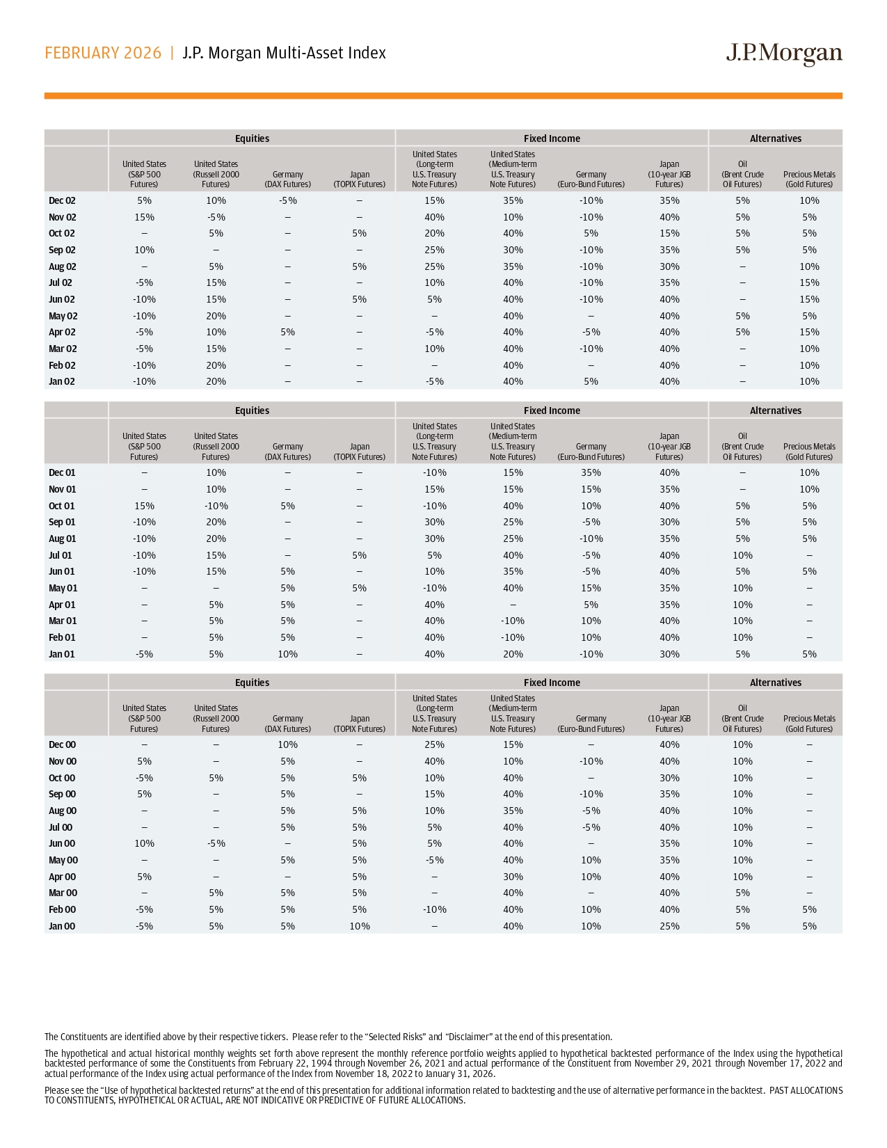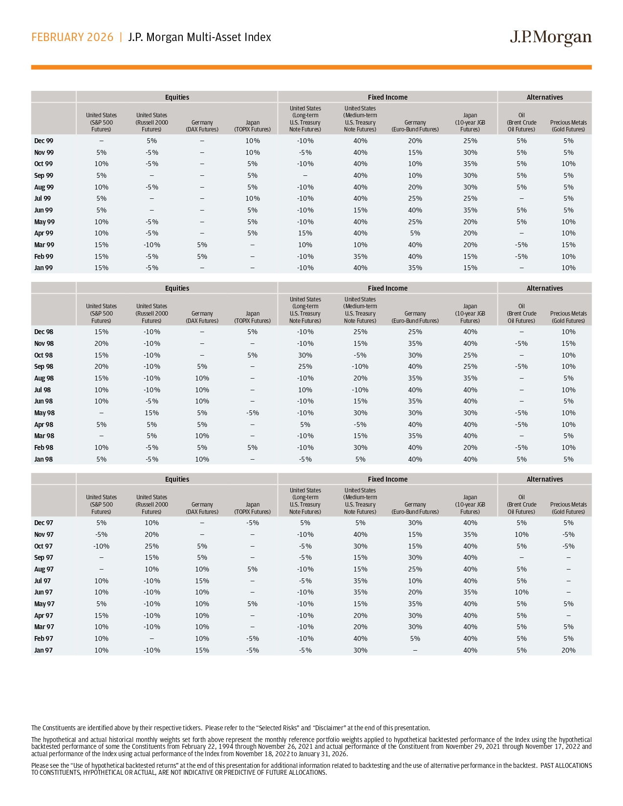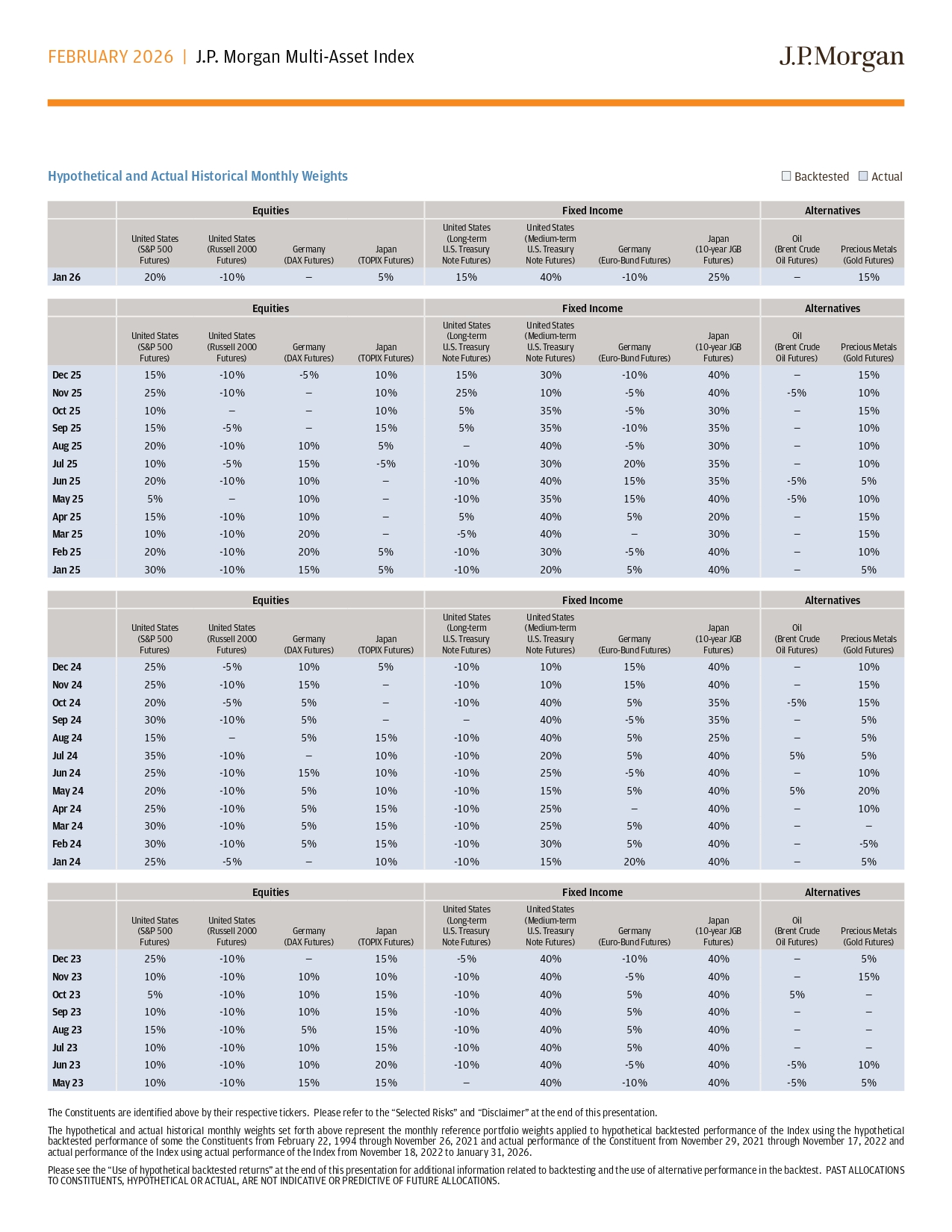 FEBRUARY 2026 | J.P. Morgan Multi - Asset Index The Constituents are identified above by their respective tickers. Please refer to the “Selected Risks” and “Disclaimer” at the end of this presentation. The hypothetical and actual historical monthly weights set forth above represent the monthly reference portfolio weights appl ied to hypothetical backtested performance of the Index using the hypothetical backtested performance of some the Constituents from February 22, 1994 through November 26, 2021 and actual performance of th e C onstituent from November 29, 2021 through November 17, 2022 and actual performance of the Index using actual performance of the Index from November 18, 2022 to January 31, 2026. Please see the “Use of hypothetical backtested returns” at the end of this presentation for additional information related to ba cktesting and the use of alternative performance in the backtest. PAST ALLOCATIONS TO CONSTITUENTS, HYPOTHETICAL OR ACTUAL, ARE NOT INDICATIVE OR PREDICTIVE OF FUTURE ALLOCATIONS. Equities Fixed Income Alternatives United States (S&P 500 Futures) United States (Russell 2000 Futures) Germany (DAX Futures) Japan (TOPIX Futures) United States (Long - term U.S. Treasury Note Futures) United States (Medium - term U.S. Treasury Note Futures) Germany (Euro - Bund Futures) Japan (10 - year JGB Futures) Oil (Brent Crude Oil Futures) Precious Metals (Gold Futures) Dec 02 5% 10% - 5% — 15% 35% - 10% 35% 5% 10% Nov 02 15% - 5% — — 40% 10% - 10% 40% 5% 5% Oct 02 — 5% — 5% 20% 40% 5% 15% 5% 5% Sep 02 10% — — — 25% 30% - 10% 35% 5% 5% Aug 02 — 5% — 5% 25% 35% - 10% 30% — 10% Jul 02 - 5% 15% — — 10% 40% - 10% 35% — 15% Jun 02 - 10% 15% — 5% 5% 40% - 10% 40% — 15% May 02 - 10% 20% — — — 40% — 40% 5% 5% Apr 02 - 5% 10% 5% — - 5% 40% - 5% 40% 5% 15% Mar 02 - 5% 15% — — 10% 40% - 10% 40% — 10% Feb 02 - 10% 20% — — — 40% — 40% — 10% Jan 02 - 10% 20% — — - 5% 40% 5% 40% — 10% Equities Fixed Income Alternatives United States (S&P 500 Futures) United States (Russell 2000 Futures) Germany (DAX Futures) Japan (TOPIX Futures) United States (Long - term U.S. Treasury Note Futures) United States (Medium - term U.S. Treasury Note Futures) Germany (Euro - Bund Futures) Japan (10 - year JGB Futures) Oil (Brent Crude Oil Futures) Precious Metals (Gold Futures) Dec 01 — 10% — — - 10% 15% 35% 40% — 10% Nov 01 — 10% — — 15% 15% 15% 35% — 10% Oct 01 15% - 10% 5% — - 10% 40% 10% 40% 5% 5% Sep 01 - 10% 20% — — 30% 25% - 5% 30% 5% 5% Aug 01 - 10% 20% — — 30% 25% - 10% 35% 5% 5% Jul 01 - 10% 15% — 5% 5% 40% - 5% 40% 10% — Jun 01 - 10% 15% 5% — 10% 35% - 5% 40% 5% 5% May 01 — — 5% 5% - 10% 40% 15% 35% 10% — Apr 01 — 5% 5% — 40% — 5% 35% 10% — Mar 01 — 5% 5% — 40% - 10% 10% 40% 10% — Feb 01 — 5% 5% — 40% - 10% 10% 40% 10% — Jan 01 - 5% 5% 10% — 40% 20% - 10% 30% 5% 5% Equities Fixed Income Alternatives United States (S&P 500 Futures) United States (Russell 2000 Futures) Germany (DAX Futures) Japan (TOPIX Futures) United States (Long - term U.S. Treasury Note Futures) United States (Medium - term U.S. Treasury Note Futures) Germany (Euro - Bund Futures) Japan (10 - year JGB Futures) Oil (Brent Crude Oil Futures) Precious Metals (Gold Futures) Dec 00 — — 10% — 25% 15% — 40% 10% — Nov 00 5% — 5% — 40% 10% - 10% 40% 10% — Oct 00 - 5% 5% 5% 5% 10% 40% — 30% 10% — Sep 00 5% — 5% — 15% 40% - 10% 35% 10% — Aug 00 — — 5% 5% 10% 35% - 5% 40% 10% — Jul 00 — — 5% 5% 5% 40% - 5% 40% 10% — Jun 00 10% - 5% — 5% 5% 40% — 35% 10% — May 00 — — 5% 5% - 5% 40% 10% 35% 10% — Apr 00 5% — — 5% — 30% 10% 40% 10% — Mar 00 — 5% 5% 5% — 40% — 40% 5% — Feb 00 - 5% 5% 5% 5% - 10% 40% 10% 40% 5% 5% Jan 00 - 5% 5% 5% 10% — 40% 10% 25% 5% 5%