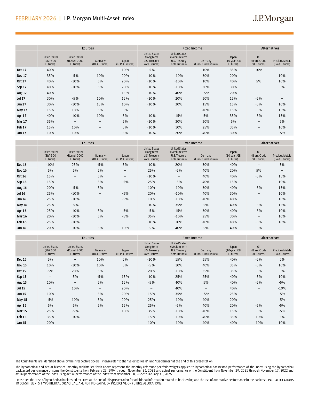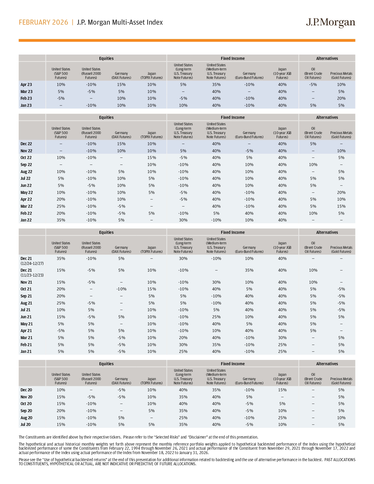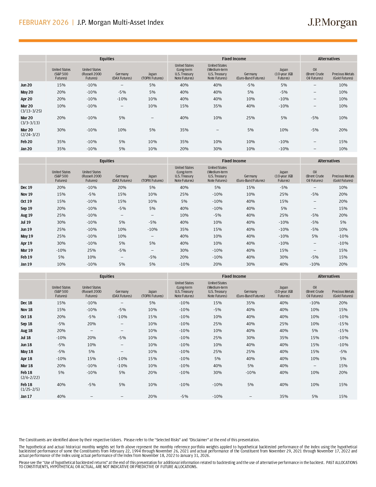 FEBRUARY 2026 | J.P. Morgan Multi - Asset Index The Constituents are identified above by their respective tickers. Please refer to the “Selected Risks” and “Disclaimer” at the end of this presentation. The hypothetical and actual historical monthly weights set forth above represent the monthly reference portfolio weights appl ied to hypothetical backtested performance of the Index using the hypothetical backtested performance of some the Constituents from February 22, 1994 through November 26, 2021 and actual performance of th e C onstituent from November 29, 2021 through November 17, 2022 and actual performance of the Index using actual performance of the Index from November 18, 2022 to January 31, 2026. Please see the “Use of hypothetical backtested returns” at the end of this presentation for additional information related to ba cktesting and the use of alternative performance in the backtest. PAST ALLOCATIONS TO CONSTITUENTS, HYPOTHETICAL OR ACTUAL, ARE NOT INDICATIVE OR PREDICTIVE OF FUTURE ALLOCATIONS. Equities Fixed Income Alternatives United States (S&P 500 Futures) United States (Russell 2000 Futures) Germany (DAX Futures) Japan (TOPIX Futures) United States (Long - term U.S. Treasury Note Futures) United States (Medium - term U.S. Treasury Note Futures) Germany (Euro - Bund Futures) Japan (10 - year JGB Futures) Oil (Brent Crude Oil Futures) Precious Metals (Gold Futures) Dec 02 5% 10% - 5% — 15% 35% - 10% 35% 5% 10% Nov 02 15% - 5% — — 40% 10% - 10% 40% 5% 5% Oct 02 — 5% — 5% 20% 40% 5% 15% 5% 5% Sep 02 10% — — — 25% 30% - 10% 35% 5% 5% Aug 02 — 5% — 5% 25% 35% - 10% 30% — 10% Jul 02 - 5% 15% — — 10% 40% - 10% 35% — 15% Jun 02 - 10% 15% — 5% 5% 40% - 10% 40% — 15% May 02 - 10% 20% — — — 40% — 40% 5% 5% Apr 02 - 5% 10% 5% — - 5% 40% - 5% 40% 5% 15% Mar 02 - 5% 15% — — 10% 40% - 10% 40% — 10% Feb 02 - 10% 20% — — — 40% — 40% — 10% Jan 02 - 10% 20% — — - 5% 40% 5% 40% — 10% Equities Fixed Income Alternatives United States (S&P 500 Futures) United States (Russell 2000 Futures) Germany (DAX Futures) Japan (TOPIX Futures) United States (Long - term U.S. Treasury Note Futures) United States (Medium - term U.S. Treasury Note Futures) Germany (Euro - Bund Futures) Japan (10 - year JGB Futures) Oil (Brent Crude Oil Futures) Precious Metals (Gold Futures) Dec 01 — 10% — — - 10% 15% 35% 40% — 10% Nov 01 — 10% — — 15% 15% 15% 35% — 10% Oct 01 15% - 10% 5% — - 10% 40% 10% 40% 5% 5% Sep 01 - 10% 20% — — 30% 25% - 5% 30% 5% 5% Aug 01 - 10% 20% — — 30% 25% - 10% 35% 5% 5% Jul 01 - 10% 15% — 5% 5% 40% - 5% 40% 10% — Jun 01 - 10% 15% 5% — 10% 35% - 5% 40% 5% 5% May 01 — — 5% 5% - 10% 40% 15% 35% 10% — Apr 01 — 5% 5% — 40% — 5% 35% 10% — Mar 01 — 5% 5% — 40% - 10% 10% 40% 10% — Feb 01 — 5% 5% — 40% - 10% 10% 40% 10% — Jan 01 - 5% 5% 10% — 40% 20% - 10% 30% 5% 5% Equities Fixed Income Alternatives United States (S&P 500 Futures) United States (Russell 2000 Futures) Germany (DAX Futures) Japan (TOPIX Futures) United States (Long - term U.S. Treasury Note Futures) United States (Medium - term U.S. Treasury Note Futures) Germany (Euro - Bund Futures) Japan (10 - year JGB Futures) Oil (Brent Crude Oil Futures) Precious Metals (Gold Futures) Dec 00 — — 10% — 25% 15% — 40% 10% — Nov 00 5% — 5% — 40% 10% - 10% 40% 10% — Oct 00 - 5% 5% 5% 5% 10% 40% — 30% 10% — Sep 00 5% — 5% — 15% 40% - 10% 35% 10% — Aug 00 — — 5% 5% 10% 35% - 5% 40% 10% — Jul 00 — — 5% 5% 5% 40% - 5% 40% 10% — Jun 00 10% - 5% — 5% 5% 40% — 35% 10% — May 00 — — 5% 5% - 5% 40% 10% 35% 10% — Apr 00 5% — — 5% — 30% 10% 40% 10% — Mar 00 — 5% 5% 5% — 40% — 40% 5% — Feb 00 - 5% 5% 5% 5% - 10% 40% 10% 40% 5% 5% Jan 00 - 5% 5% 5% 10% — 40% 10% 25% 5% 5%