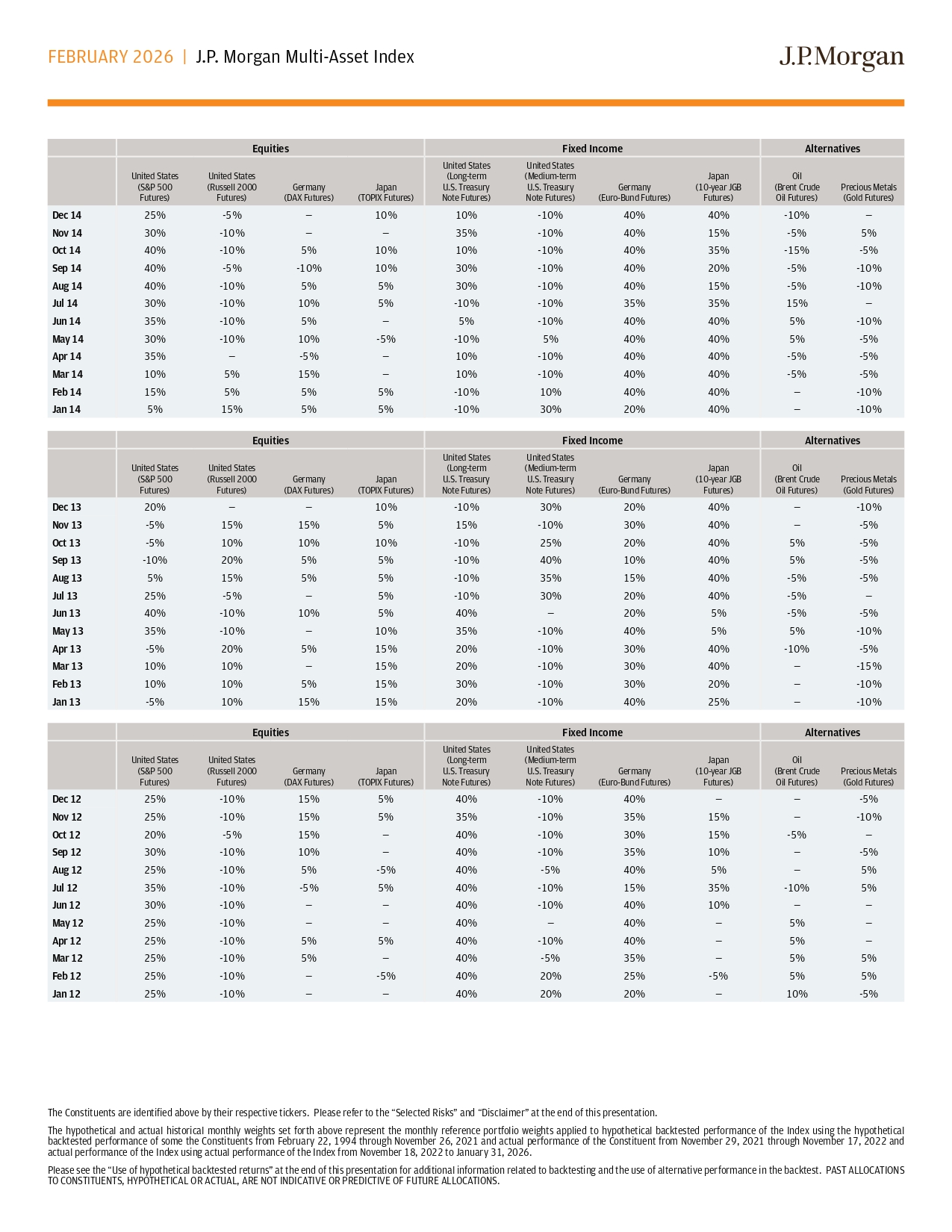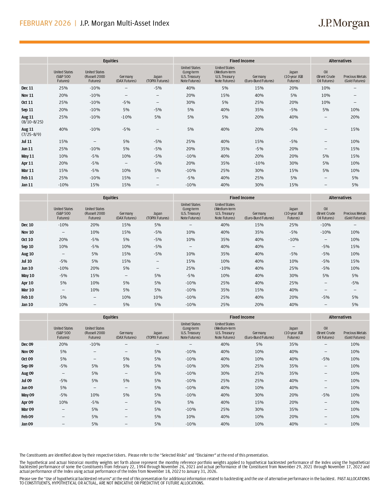 FEBRUARY 2026 | J.P. Morgan Multi - Asset Index The Constituents are identified above by their respective tickers. Please refer to the “Selected Risks” and “Disclaimer” at the end of this presentation. The hypothetical and actual historical monthly weights set forth above represent the monthly reference portfolio weights appl ied to hypothetical backtested performance of the Index using the hypothetical backtested performance of some the Constituents from February 22, 1994 through November 26, 2021 and actual performance of th e C onstituent from November 29, 2021 through November 17, 2022 and actual performance of the Index using actual performance of the Index from November 18, 2022 to January 31, 2026. Please see the “Use of hypothetical backtested returns” at the end of this presentation for additional information related to ba cktesting and the use of alternative performance in the backtest. PAST ALLOCATIONS TO CONSTITUENTS, HYPOTHETICAL OR ACTUAL, ARE NOT INDICATIVE OR PREDICTIVE OF FUTURE ALLOCATIONS. Equities Fixed Income Alternatives United States (S&P 500 Futures) United States (Russell 2000 Futures) Germany (DAX Futures) Japan (TOPIX Futures) United States (Long - term U.S. Treasury Note Futures) United States (Medium - term U.S. Treasury Note Futures) Germany (Euro - Bund Futures) Japan (10 - year JGB Futures) Oil (Brent Crude Oil Futures) Precious Metals (Gold Futures) Dec 11 25% - 10% — - 5% 40% 5% 15% 20% 10% — Nov 11 20% - 10% — — 20% 15% 40% 5% 10% — Oct 11 25% - 10% - 5% — 30% 5% 25% 20% 10% — Sep 11 20% - 10% 5% - 5% 5% 40% 35% - 5% 5% 10% Aug 11 (8/10 – 8/25) 25% - 10% - 10% 5% 5% 5% 20% 40% — 20% Aug 11 (7/25 – 8/9) 40% - 10% - 5% — 5% 40% 20% - 5% — 15% Jul 11 15% — 5% - 5% 25% 40% 15% - 5% — 10% Jun 11 25% - 10% 5% - 5% 20% 35% - 5% 20% — 15% May 11 10% - 5% 10% - 5% - 10% 40% 20% 20% 5% 15% Apr 11 20% - 5% — - 5% 20% 35% - 10% 30% 5% 10% Mar 11 15% - 5% 10% 5% - 10% 25% 30% 15% 5% 10% Feb 11 25% - 10% 15% — - 5% 40% 25% 5% — 5% Jan 11 - 10% 15% 15% — - 10% 40% 30% 15% — 5% Equities Fixed Income Alternatives United States (S&P 500 Futures) United States (Russell 2000 Futures) Germany (DAX Futures) Japan (TOPIX Futures) United States (Long - term U.S. Treasury Note Futures) United States (Medium - term U.S. Treasury Note Futures) Germany (Euro - Bund Futures) Japan (10 - year JGB Futures) Oil (Brent Crude Oil Futures) Precious Metals (Gold Futures) Dec 10 - 10% 20% 15% 5% — 40% 15% 25% - 10% — Nov 10 — 10% 15% - 5% 10% 40% 35% - 5% - 10% 10% Oct 10 20% - 5% 5% - 5% 10% 35% 40% - 10% — 10% Sep 10 10% - 5% 10% - 5% — 40% 40% — - 5% 15% Aug 10 — 5% 15% - 5% 10% 35% 40% - 5% - 5% 10% Jul 10 - 5% 5% 15% — 15% 10% 40% 10% - 5% 15% Jun 10 - 10% 20% 5% — 25% - 10% 40% 25% - 5% 10% May 10 - 5% 15% — 5% - 5% 10% 40% 30% 5% 5% Apr 10 5% 10% 5% 5% - 10% 25% 40% 25% — - 5% Mar 10 — 10% 5% 5% - 10% 35% 15% 40% — — Feb 10 5% — 10% 10% - 10% 25% 40% 20% - 5% 5% Jan 10 10% — 5% 5% - 10% 25% 20% 40% — 5% Equities Fixed Income Alternatives United States (S&P 500 Futures) United States (Russell 2000 Futures) Germany (DAX Futures) Japan (TOPIX Futures) United States (Long - term U.S. Treasury Note Futures) United States (Medium - term U.S. Treasury Note Futures) Germany (Euro - Bund Futures) Japan (10 - year JGB Futures) Oil (Brent Crude Oil Futures) Precious Metals (Gold Futures) Dec 09 20% - 10% — — — 40% 5% 35% — 10% Nov 09 5% — — 5% - 10% 40% 10% 40% — 10% Oct 09 5% — 5% 5% - 10% 40% 10% 40% - 5% 10% Sep 09 - 5% 5% 5% 5% - 10% 30% 25% 35% — 10% Aug 09 — 5% — 5% - 10% 30% 25% 35% — 10% Jul 09 - 5% 5% 5% 5% - 10% 25% 25% 40% — 10% Jun 09 5% — — 5% - 10% 40% 10% 40% — 10% May 09 - 5% 10% 5% 5% - 10% 40% 30% 20% - 5% 10% Apr 09 10% - 5% — 5% 5% 40% 15% 20% — 10% Mar 09 — 5% — 5% - 10% 25% 30% 35% — 10% Feb 09 — 5% — 5% 10% 40% 10% 20% — 10% Jan 09 — 5% — 5% - 10% 40% 10% 40% — 10%