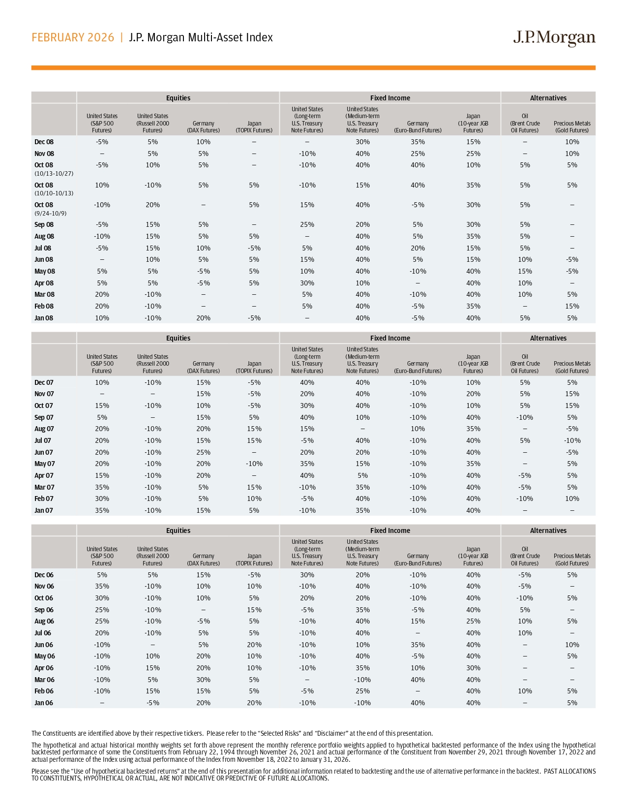 FEBRUARY 2026 | J.P. Morgan Multi - Asset Index The Constituents are identified above by their respective tickers. Please refer to the “Selected Risks” and “Disclaimer” at the end of this presentation. The hypothetical and actual historical monthly weights set forth above represent the monthly reference portfolio weights appl ied to hypothetical backtested performance of the Index using the hypothetical backtested performance of some the Constituents from February 22, 1994 through November 26, 2021 and actual performance of th e C onstituent from November 29, 2021 through November 17, 2022 and actual performance of the Index using actual performance of the Index from November 18, 2022 to January 31, 2026. Please see the “Use of hypothetical backtested returns” at the end of this presentation for additional information related to ba cktesting and the use of alternative performance in the backtest. PAST ALLOCATIONS TO CONSTITUENTS, HYPOTHETICAL OR ACTUAL, ARE NOT INDICATIVE OR PREDICTIVE OF FUTURE ALLOCATIONS. Equities Fixed Income Alternatives United States (S&P 500 Futures) United States (Russell 2000 Futures) Germany (DAX Futures) Japan (TOPIX Futures) United States (Long - term U.S. Treasury Note Futures) United States (Medium - term U.S. Treasury Note Futures) Germany (Euro - Bund Futures) Japan (10 - year JGB Futures) Oil (Brent Crude Oil Futures) Precious Metals (Gold Futures) Dec 08 - 5% 5% 10% — — 30% 35% 15% — 10% Nov 08 — 5% 5% — - 10% 40% 25% 25% — 10% Oct 08 (10/13 – 10/27) - 5% 10% 5% — - 10% 40% 40% 10% 5% 5% Oct 08 (10/10 – 10/13) 10% - 10% 5% 5% - 10% 15% 40% 35% 5% 5% Oct 08 (9/24 – 10/9) - 10% 20% — 5% 15% 40% - 5% 30% 5% — Sep 08 - 5% 15% 5% — 25% 20% 5% 30% 5% — Aug 08 - 10% 15% 5% 5% — 40% 5% 35% 5% — Jul 08 - 5% 15% 10% - 5% 5% 40% 20% 15% 5% — Jun 08 — 10% 5% 5% 15% 40% 5% 15% 10% - 5% May 08 5% 5% - 5% 5% 10% 40% - 10% 40% 15% - 5% Apr 08 5% 5% - 5% 5% 30% 10% — 40% 10% — Mar 08 20% - 10% — — 5% 40% - 10% 40% 10% 5% Feb 08 20% - 10% — — 5% 40% - 5% 35% — 15% Jan 08 10% - 10% 20% - 5% — 40% - 5% 40% 5% 5% Equities Fixed Income Alternatives United States (S&P 500 Futures) United States (Russell 2000 Futures) Germany (DAX Futures) Japan (TOPIX Futures) United States (Long - term U.S. Treasury Note Futures) United States (Medium - term U.S. Treasury Note Futures) Germany (Euro - Bund Futures) Japan (10 - year JGB Futures) Oil (Brent Crude Oil Futures) Precious Metals (Gold Futures) Dec 07 10% - 10% 15% - 5% 40% 40% - 10% 10% 5% 5% Nov 07 — — 15% - 5% 20% 40% - 10% 20% 5% 15% Oct 07 15% - 10% 10% - 5% 30% 40% - 10% 10% 5% 15% Sep 07 5% — 15% 5% 40% 10% - 10% 40% - 10% 5% Aug 07 20% - 10% 20% 15% 15% — 10% 35% — - 5% Jul 07 20% - 10% 15% 15% - 5% 40% - 10% 40% 5% - 10% Jun 07 20% - 10% 25% — 20% 20% - 10% 40% — - 5% May 07 20% - 10% 20% - 10% 35% 15% - 10% 35% — 5% Apr 07 15% - 10% 20% — 40% 5% - 10% 40% - 5% 5% Mar 07 35% - 10% 5% 15% - 10% 35% - 10% 40% - 5% 5% Feb 07 30% - 10% 5% 10% - 5% 40% - 10% 40% - 10% 10% Jan 07 35% - 10% 15% 5% - 10% 35% - 10% 40% — — Equities Fixed Income Alternatives United States (S&P 500 Futures) United States (Russell 2000 Futures) Germany (DAX Futures) Japan (TOPIX Futures) United States (Long - term U.S. Treasury Note Futures) United States (Medium - term U.S. Treasury Note Futures) Germany (Euro - Bund Futures) Japan (10 - year JGB Futures) Oil (Brent Crude Oil Futures) Precious Metals (Gold Futures) Dec 06 5% 5% 15% - 5% 30% 20% - 10% 40% - 5% 5% Nov 06 35% - 10% 10% 10% - 10% 40% - 10% 40% - 5% — Oct 06 30% - 10% 10% 5% 20% 20% - 10% 40% - 10% 5% Sep 06 25% - 10% — 15% - 5% 35% - 5% 40% 5% — Aug 06 25% - 10% - 5% 5% - 10% 40% 15% 25% 10% 5% Jul 06 20% - 10% 5% 5% - 10% 40% — 40% 10% — Jun 06 - 10% — 5% 20% - 10% 10% 35% 40% — 10% May 06 - 10% 10% 20% 10% - 10% 40% - 5% 40% — 5% Apr 06 - 10% 15% 20% 10% - 10% 35% 10% 30% — — Mar 06 - 10% 5% 30% 5% — - 10% 40% 40% — — Feb 06 - 10% 15% 15% 5% - 5% 25% — 40% 10% 5% Jan 06 — - 5% 20% 20% - 10% - 10% 40% 40% — 5%