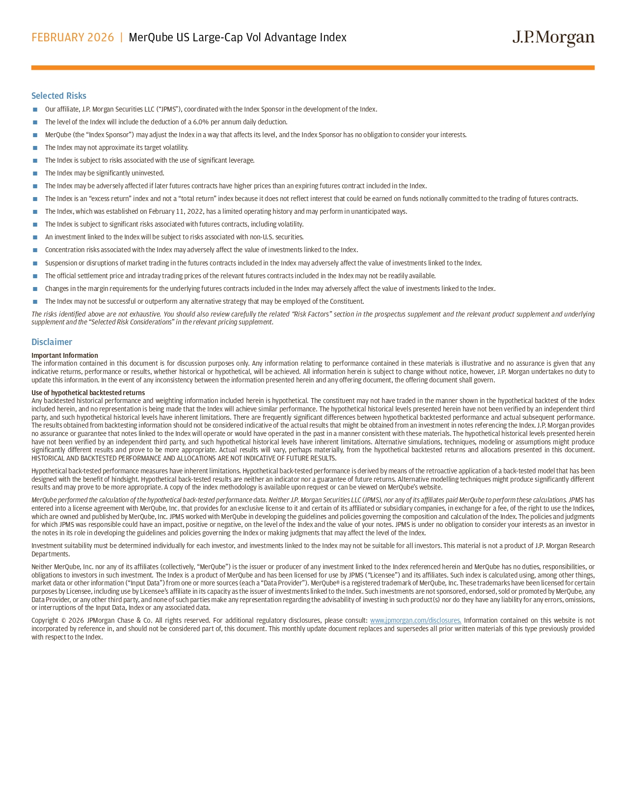 FEBRUARY 2026 | MerQube US Large - Cap Vol Advantage Index Selected Risks Our affiliate, J.P. Morgan Securities LLC (“JPMS”), coordinated with the Index Sponsor in the development of the Index. The level of the Index will include the deduction of a 6.0% per annum daily deduction. MerQube (the “Index Sponsor”) may adjust the Index in a way that atfects its level, and the Index Sponsor has no obligation to consider your interests. The Index may not approximate its target volatility. The Index is subject to risks associated with the use of significant leverage. The Index may be significantly uninvested. The Index may be adversely atfected if later futures contracts have higher prices than an expiring futures contract included in the Index. The Index is an “excess return” index and not a “total return” index because it does not reflect interest that could be earned on funds notionally committed to the trading of futures contracts. The Index, which was established on February 11, 2022, has a limited operating history and may perform in unanticipated ways. The Index is subject to significant risks associated with futures contracts, including volatility. An investment linked to the Index will be subject to risks associated with non - U.S. securities. Concentration risks associated with the Index may adversely atfect the value of investments linked to the Index. Suspension or disruptions of market trading in the futures contracts included in the Index may adversely atfect the value of investments linked to the Index. The official settlement price and intraday trading prices of the relevant futures contracts included in the Index may not be readily available. Changes in the margin requirements for the underlying futures contracts included in the Index may adversely atfect the value of investments linked to the Index. The Index may not be successful or outperform any alternative strategy that may be employed of the Constituent. The risks identified above are not exhaustive. You should also review carefully the related “Risk Factors” section in the prospectus supplement and the relevant product supplement and underlying supplement and the “Selected Risk Considerations” in the relevant pricing supplement. Disclaimer Important Information The information contained in this document is for discussion purposes only . Any information relating to performance contained in these materials is illustrative and no assurance is given that any indicative returns, performance or results, whether historical or hypothetical, will be achieved . All information herein is subject to change without notice, however, J . P . Morgan undertakes no duty to update this information . In the event of any inconsistency between the information presented herein and any otfering document, the otfering document shall govern . Use of hypothetical backtested returns Any backtested historical performance and weighting information included herein is hypothetical . The constituent may not have traded in the manner shown in the hypothetical backtest of the Index included herein, and no representation is being made that the Index will achieve similar performance . The hypothetical historical levels presented herein have not been verified by an independent third party, and such hypothetical historical levels have inherent limitations . There are frequently significant ditferences between hypothetical backtested performance and actual subsequent performance . The results obtained from backtesting information should not be considered indicative of the actual results that might be obtained from an investment in notes referencing the Index . J . P . Morgan provides no assurance or guarantee that notes linked to the Index will operate or would have operated in the past in a manner consistent with these materials . The hypothetical historical levels presented herein have not been verified by an independent third party, and such hypothetical historical levels have inherent limitations . Alternative simulations, techniques, modeling or assumptions might produce significantly ditferent results and prove to be more appropriate . Actual results will vary, perhaps materially, from the hypothetical backtested returns and allocations presented in this document . HISTORICAL AND BACKTESTED PERFORMANCE AND ALLOCATIONS ARE NOT INDICATIVE OF FUTURE RESULTS . Hypothetical back - tested performance measures have inherent limitations . Hypothetical back - tested performance is derived by means of the retroactive application of a back - tested model that has been designed with the benefit of hindsight . Hypothetical back - tested results are neither an indicator nor a guarantee of future returns . Alternative modelling techniques might produce significantly ditferent results and may prove to be more appropriate . A copy of the index methodology is available upon request or can be viewed on MerQube’s website . MerQube performed the calculation of the hypothetical back - tested performance data . Neither J . P . Morgan Securities LLC (JPMS), nor any of its affiliates paid MerQube to perform these calculations . JPMS has entered into a license agreement with MerQube, Inc . that provides for an exclusive license to it and certain of its affiliated or subsidiary companies, in exchange for a fee, of the right to use the Indices, which are owned and published by MerQube, Inc . JPMS worked with MerQube in developing the guidelines and policies governing the composition and calculation of the Index . The policies and judgments for which JPMS was responsible could have an impact, positive or negative, on the level of the Index and the value of your notes . JPMS is under no obligation to consider your interests as an investor in the notes in its role in developing the guidelines and policies governing the Index or making judgments that may atfect the level of the Index . Investment suitability must be determined individually for each investor, and
