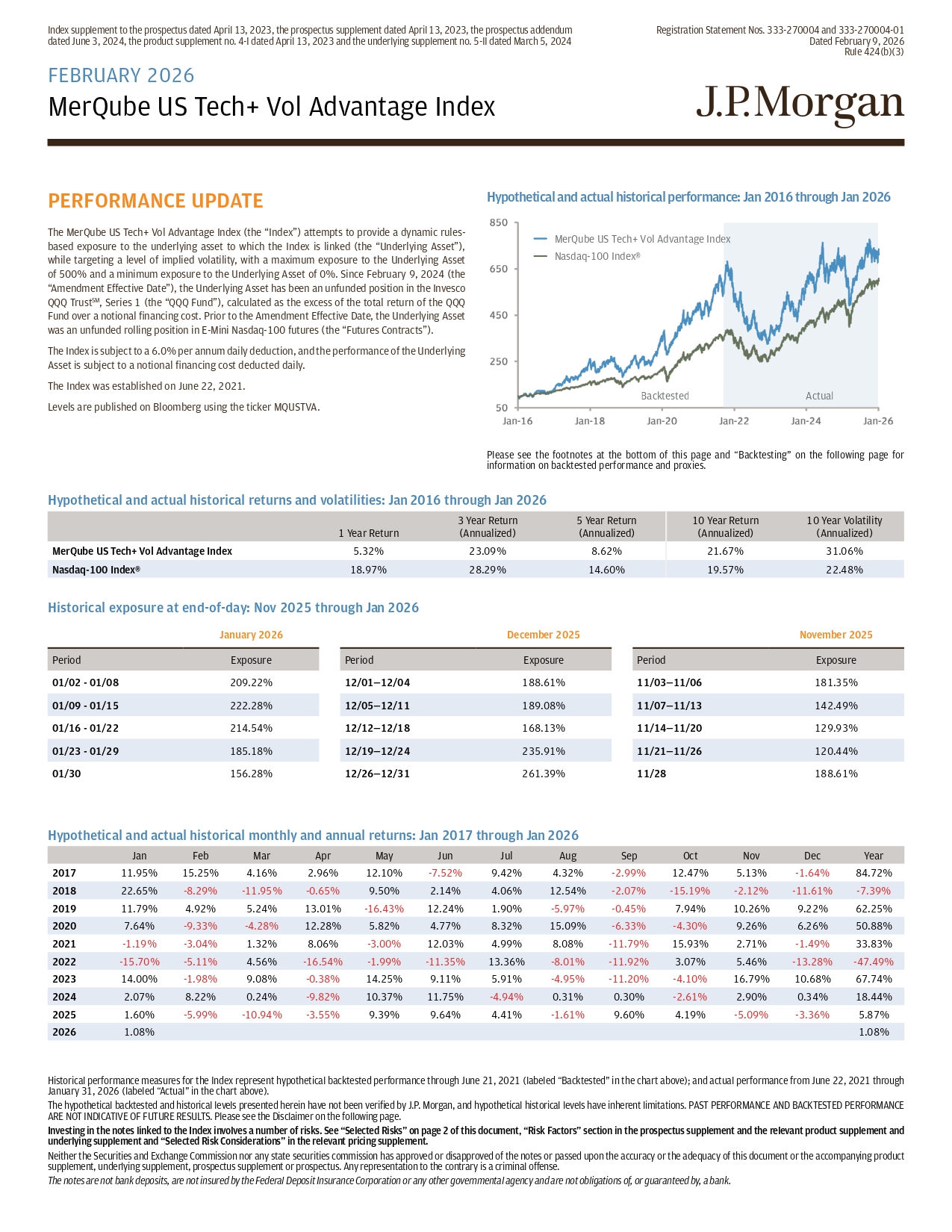 Index supplement to the prospectus dated April 13, 2023, the prospectus supplement dated April 13, 2023, the prospectus addendum dated June 3, 2024, the product supplement no. 4 - I dated April 13, 2023 and the underlying supplement no. 5 - II dated March 5, 2024 Registration Statement Nos. 333 - 270004 and 333 - 270004 - 01 Dated February 9, 2026 Rule 424(b)(3) PERFORMANCE UPDATE The MerQube US Tech+ Vol Advantage Index (the “Index”) attempts to provide a dynamic rules - based exposure to the underlying asset to which the Index is linked (the “Underlying Asset”), while targeting a level of implied volatility, with a maximum exposure to the Underlying Asset of 500 % and a minimum exposure to the Underlying Asset of 0 % . Since February 9 , 2024 (the “Amendment Etfective Date”), the Underlying Asset has been an unfunded position in the Invesco QQQ Trust SM , Series 1 (the “QQQ Fund”), calculated as the excess of the total return of the QQQ Fund over a notional financing cost . Prior to the Amendment Etfective Date, the Underlying Asset was an unfunded rolling position in E - Mini Nasdaq - 100 futures (the “Futures Contracts”) . The Index is subject to a 6 . 0 % per annum daily deduction, and the performance of the Underlying Asset is subject to a notional financing cost deducted daily . The Index was established on June 22 , 2021 . Levels are published on Bloomberg using the ticker MQUSTVA . Hypothetical and actual historical performance: Jan 2016 through Jan 2026 Please see the footnotes at the bottom of this page and “Backtesting” on the following page for information on backtested performance and proxies. Hypothetical and actual historical returns and volatilities: Jan 2016 through Jan 2026 MerQube US Tech+ Vol Advantage Ind x Nasdaq - 100 Index® Backtested Actual MerQube US Tech+ Vol Advantage Ind e x Nasdaq - 100 Index® Backtested Actua 10 Year Volatility (Annualized) 10 Year Return (Annualized) 5 Year Return (Annualized) 3 Year Return (Annualized) 1 Year Return 31.06% 21.67% 8.62% 23.09% 5.32% MerQube US Tech+ Vol Advantage Index 22.48% 19.57% 14.60% 28.29% 18.97% Nasdaq - 100 Index® Historical exposure at end - of - day: Nov 2025 through Jan 2026 Hypothetical and actual historical monthly and annual returns: Jan 2017 through Jan 2026 Year Dec Nov Oct Sep Aug Jul Jun May Apr Mar Feb Jan 84.72% - 1.64% 5.13% 12.47% - 2.99% 4.32% 9.42% - 7.52% 12.10% 2.96% 4.16% 15.25% 11.95% 2017 - 7.39% - 11.61% - 2.12% - 15.19% - 2.07% 12.54% 4.06% 2.14% 9.50% - 0.65% - 11.95% - 8.29% 22.65% 2018 62.25% 9.22% 10.26% 7.94% - 0.45% - 5.97% 1.90% 12.24% - 16.43% 13.01% 5.24% 4.92% 11.79% 2019 50.88% 6.26% 9.26% - 4.30% - 6.33% 15.09% 8.32% 4.77% 5.82% 12.28% - 4.28% - 9.33% 7.64% 2020 33.83% - 1.49% 2.71% 15.93% - 11.79% 8.08% 4.99% 12.03% - 3.00% 8.06% 1.32% - 3.04% - 1.19% 2021 - 47.49% - 13.28% 5.46% 3.07% - 11.92% - 8.01% 13.36% - 11.35% - 1.99% - 16.54% 4.56% - 5.11% - 15.70% 2022 67.74% 10.68% 16.79% - 4.10% - 11.20% - 4.95% 5.91% 9.11% 14.25% - 0.38% 9.08% - 1.98% 14.00% 2023 18.44% 0.34% 2.90% - 2.61% 0.30% 0.31% - 4.94% 11.75% 10.37% - 9.82% 0.24% 8.22% 2.07% 2024 5.87% - 3.36% - 5.09% 4.19% 9.60% - 1.61% 4.41% 9.64% 9.39% - 3.55% - 10.94% - 5.99% 1.60% 2025 1.08% 1.08% 2026 January 2026 Exposure Period 209.22% 01/02 - 01/08 222.28% 01/09 - 01/15 214.54% 01/16 - 01/22 185.18% 01/23 - 01/29 156.28% 01/30 FEBRUARY 2026 MerQube US Tech+ Vol Advantage Index Historical performance measures for the Index represent hypothetical backtested performance through June 21, 2021 (labeled “Backtested” in the chart above); and actual performance from June 22, 2021 through January 31, 2026 (labeled “Actual” in the chart above). The hypothetical backtested and historical levels presented herein have not been verified by J.P. Morgan, and hypothetical historical levels have inherent limitations. PAST PERFORMANCE AND BACKTESTED PERFORMANCE ARE NOT INDICATIVE OF FUTURE RESULTS. Please see the Disclaimer on the following page. Investing in the notes linked to the Index involves a number of risks. See “Selected Risks” on page 2 of this document, “Risk Factors” section in the prospectus supplement and the relevant product supplement and underlying supplement and “Selected Risk Considerations” in the relevant pricing supplement. Neither the Securities and Exchange Commission nor any state securities commission has approved or disapproved of the notes or passed upon the accuracy or the adequacy of this document or the accompanying product supplement, underlying supplement, prospectus supplement or prospectus. Any representation to the contrary is a criminal otfense. The notes are not bank deposits, are not insured by the Federal Deposit Insurance Corporation or any other governmental agency and are not obligations of, or guaranteed by, a bank. November 2025 Exposure Period 181.35% 11/03 — 11/06 142.49% 11/07 — 11/13 129.93% 11/14 — 11/20 120.44% 11/21 — 11/26 188.61% 11/28 December 2025 Exposure Period 188.61% 12/01 — 12/04 189.08% 12/05 — 12/11 168.13% 12/12 — 12/18 235.91% 12/19 — 12/24 261.39% 12/26 — 12/31