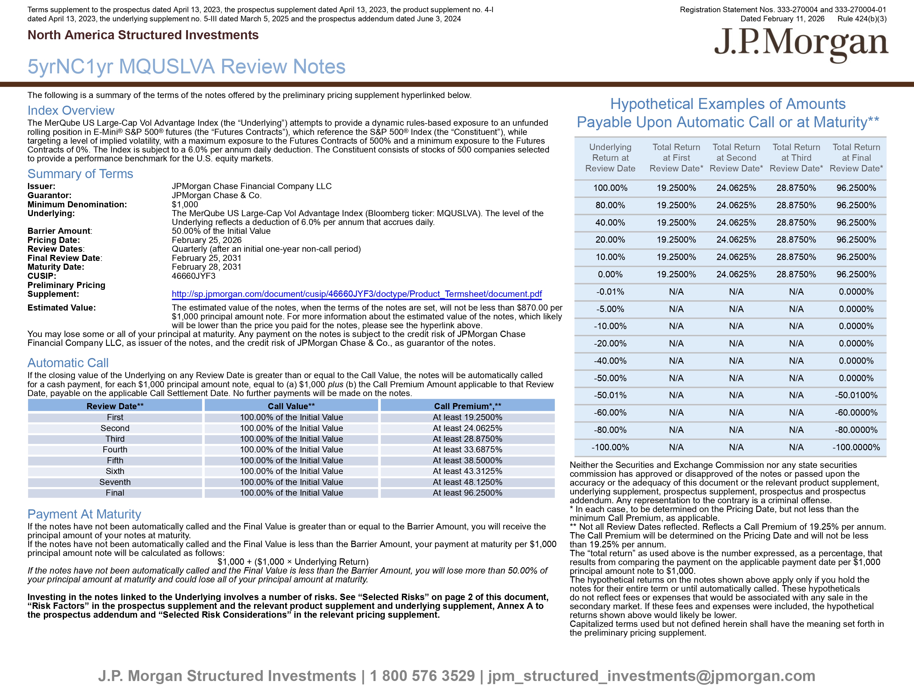 Terms supplement to the prospectus dated April 13, 2023, the prospectus supplement dated April 13, 2023, the product supplement no. 4 - I dated April 13, 2023, the underlying supplement no. 5 - III dated March 5, 2025 and the prospectus addendum dated June 3, 2024 North America Structured Investments Registration Statement Nos. 333 - 270004 and 333 - 270004 - 01 Dated February 11, 2026 Rule 424(b)(3) 5yrNC1yr MQUSLVA Review Notes The following is a summary of the terms of the notes offered by the preliminary pricing supplement hyperlinked below. Index Overview The MerQube US Large - Cap Vol Advantage Index (the “Underlying”) attempts to provide a dynamic rules - based exposure to an unfunded rolling position in E - Mini ® S&P 500 ® futures (the “Futures Contracts”), which reference the S&P 500 ® Index (the “Constituent”), while targeting a level of implied volatility, with a maximum exposure to the Futures Contracts of 500% and a minimum exposure to the Futures Contracts of 0%. The Index is subject to a 6.0% per annum daily deduction. The Constituent consists of stocks of 500 companies selected to provide a performance benchmark for the U.S. equity markets. Summary of Terms J.P. Morgan Structured Investments | 1 800 576 3529 | jpm_structured_investments@jpmorgan.com JPMorgan Chase Financial Company LLC JPMorgan Chase & Co. $1,000 The MerQube US Large - Cap Vol Advantage Index (Bloomberg ticker: MQUSLVA). The level of the Underlying reflects a deduction of 6.0% per annum that accrues daily. 50.00% of the Initial Value February 25, 2026 Quarterly (after an initial one - year non - call period) February 25, 2031 February 28, 2031 46660JYF3 Issuer: Guarantor: Minimum Denomination: Underlying: Barrier Amount : Pricing Date: Review Dates : Final Review Date : Maturity Date: CUSIP: Preliminary Pricing Supplement: Estimated Value: http://sp.jpmorgan.com/document/cusip/46660JYF3/doctype/Product_Termsheet/document.pdf The estimated value of the notes, when the terms of the notes are set, will not be less than $870.00 per $1,000 principal amount note. For more information about the estimated value of the notes, which likely will be lower than the price you paid for the notes, please see the hyperlink above. You may lose some or all of your principal at maturity. Any payment on the notes is subject to the credit risk of JPMorgan Chase Financial Company LLC, as issuer of the notes, and the credit risk of JPMorgan Chase & Co., as guarantor of the notes. Automatic Call If the closing value of the Underlying on any Review Date is greater than or equal to the Call Value, the notes will be automatically called for a cash payment, for each $1,000 principal amount note, equal to (a) $1,000 plus (b) the Call Premium Amount applicable to that Review Date, payable on the applicable Call Settlement Date. No further payments will be made on the notes. Call Premium*,** Call Value** Review Date** At least 19.2500% 100.00% of the Initial Value First At least 24.0625% 100.00% of the Initial Value Second At least 28.8750% 100.00% of the Initial Value Third At least 33.6875% 100.00% of the Initial Value Fourth At least 38.5000% 100.00% of the Initial Value Fifth At least 43.3125% 100.00% of the Initial Value Sixth At least 48.1250% 100.00% of the Initial Value Seventh At least 96.2500% 100.00% of the Initial Value Final Payment At Maturity If the notes have not been automatically called and the Final Value is greater than or equal to the Barrier Amount, you will receive the principal amount of your notes at maturity. If the notes have not been automatically called and the Final Value is less than the Barrier Amount, your payment at maturity per $1,000 principal amount note will be calculated as follows: $1,000 + ($1,000 î Underlying Return) If the notes have not been automatically called and the Final Value is less than the Barrier Amount, you will lose more than 50.00% of your principal amount at maturity and could lose all of your principal amount at maturity. Investing in the notes linked to the Underlying involves a number of risks. See “Selected Risks” on page 2 of this document, “Risk Factors” in the prospectus supplement and the relevant product supplement and underlying supplement, Annex A to the prospectus addendum and “Selected Risk Considerations” in the relevant pricing supplement. Hypothetical Examples of Amounts Payable Upon Automatic Call or at Maturity** Total Return at Final Review Date* Total Return at Third Review Date* Total Return at Second Review Date* Total Return at First Review Date* Underlying Return at Review Date 96.2500% 28.8750% 24.0625% 19.2500% 100.00% 96.2500% 28.8750% 24.0625% 19.2500% 80.00% 96.2500% 28.8750% 24.0625% 19.2500% 40.00% 96.2500% 28.8750% 24.0625% 19.2500% 20.00% 96.2500% 28.8750% 24.0625% 19.2500% 10.00% 96.2500% 28.8750% 24.0625% 19.2500% 0.00% 0.0000% N/A N/A N/A - 0.01% 0.0000% N/A N/A N/A - 5.00% 0.0000% N/A N/A N/A - 10.00% 0.0000% N/A N/A N/A - 20.00% 0.0000% N/A N/A N/A - 40.00% 0.0000% N/A N/A N/A - 50.00% - 50.0100% N/A N/A N/A - 50.01% - 60.0000% N/A N/A N/A - 60.00% - 80.0000% N/A N/A N/A - 80.00% - 100.0000% N/A N/A N/A - 100.00% Neither the Securities and Exchange Commission nor any state securities commission has approved or disapproved of the notes or passed upon the accuracy or the adequacy of this document or the relevant product supplement, underlying supplement, prospectus supplement, prospectus and prospectus addendum. Any representation to the contrary is a criminal offense. * In each case, to be determined on the Pricing Date, but not less than the minimum Call Premium, as applicable. ** Not all Review Dates reflected. Reflects a Call Premium of 19.25% per annum. The Call Premium will be determined on the Pricing Date and will not be less than 19.25% per annum. The “total return” as used above is the number expressed, as a percentage, that results from comparing the payment on the applicable payment date per $1,000 p