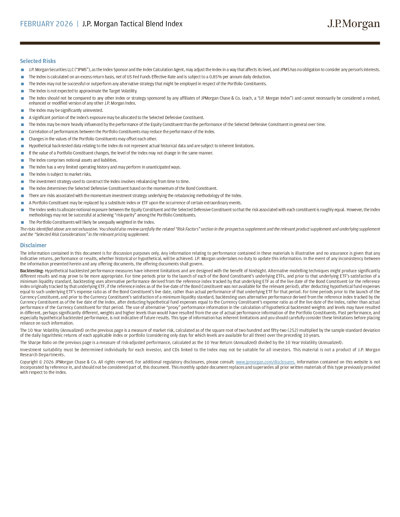 FEBRUARY 2026 | J.P. Morgan Tactical Blend Index Selected Risks J.P. Morgan Securities LLC (“JPMS”), as the Index Sponsor and the Index Calculation Agent, may adjust the Index in a way that atfects its level, and JPMS has no obligation to consider any person’s interests. The Index is calculated on an excess return basis, net of US Fed Funds Etfective Rate and is subject to a 0.85% per annum daily deduction. The Index may not be successful or outperform any alternative strategy that might be employed in respect of the Portfolio Constituents. The Index is not expected to approximate the Target Volatility. The Index should not be compared to any other index or strategy sponsored by any affiliates of JPMorgan Chase & Co. (each, a “J.P. Morgan Index”) and cannot necessarily be considered a revised, enhanced or modified version of any other J.P. Morgan Index. The Index may be significantly uninvested. A significant portion of the Index’s exposure may be allocated to the Selected Defensive Constituent. The Index may be more heavily influenced by the performance of the Equity Constituent than the performance of the Selected Defensive Constituent in general over time. Correlation of performances between the Portfolio Constituents may reduce the performance of the Index. Changes in the values of the Portfolio Constituents may otfset each other. Hypothetical back - tested data relating to the Index do not represent actual historical data and are subject to inherent limitations. If the value of a Portfolio Constituent changes, the level of the Index may not change in the same manner. The Index comprises notional assets and liabilities. The Index has a very limited operating history and may perform in unanticipated ways. The Index is subject to market risks. The investment strategy used to construct the Index involves rebalancing from time to time. The Index determines the Selected Defensive Constituent based on the momentum of the Bond Constituent. There are risks associated with the momentum investment strategy underlying the rebalancing methodology of the Index. A Portfolio Constituent may be replaced by a substitute index or ETF upon the occurrence of certain extraordinary events. The Index seeks to allocate notional exposure between the Equity Constituent and the Selected Defensive Constituent so that the risk associated with each constituent is roughly equal. However, the Index methodology may not be successful at achieving “risk - parity” among the Portfolio Constituents. The Portfolio Constituents will likely be unequally weighted in the Index. The risks identified above are not exhaustive. You should also review carefully the related “Risk Factors” section in the prospectus supplement and the relevant product supplement and underlying supplement and the “Selected Risk Considerations” in the relevant pricing supplement. Disclaimer The information contained in this document is for discussion purposes only . Any information relating to performance contained in these materials is illustrative and no assurance is given that any indicative returns, performance or results, whether historical or hypothetical, will be achieved . J . P . Morgan undertakes no duty to update this information . In the event of any inconsistency between the information presented herein and any otfering documents, the otfering documents shall govern . Backtesting : Hypothetical backtested performance measures have inherent limitations and are designed with the benefit of hindsight . Alternative modelling techniques might produce significantly ditferent results and may prove to be more appropriate . For time periods prior to the launch of each of the Bond Constituent’s underlying ETFs, and prior to that underlying ETF’s satisfaction of a minimum liquidity standard, backtesting uses alternative performance derived from the reference index tracked by that underlying ETF as of the live date of the Bond Constituent (or the reference index originally tracked by that underlying ETF, if the reference index as of the live date of the Bond Constituent was not available for the relevant period), after deducting hypothetical fund expenses equal to such underlying ETF’s expense ratio as of the Bond Constituent’s live date, rather than actual performance of that underlying ETF for that period . For time periods prior to the launch of the Currency Constituent, and prior to the Currency Constituent’s satisfaction of a minimum liquidity standard, backtesting uses alternative performance derived from the reference index tracked by the Currency Constituent as of the live date of the Index, after deducting hypothetical fund expenses equal to the Currency Constituent’s expense ratio as of the live date of the Index, rather than actual performance of the Currency Constituent for that period . The use of alternative “proxy” performance information in the calculation of hypothetical backtested weights and levels may have resulted in ditferent, perhaps significantly ditferent, weights and higher levels than would have resulted from the use of actual performance information of the Portfolio Constituents . Past performance, and especially hypothetical backtested performance, is not indicative of future results . This type of information has inherent limitations and you should carefully consider these limitations before placing reliance on such information . The 10 Year Volatility (Annualized) on the previous page is a measure of market risk, calculated as of the square root of two hundred and fifty - two ( 252 ) multiplied by the sample standard deviation of the daily logarithmic returns of each applicable index or portfolio (considering only days for which levels are available for all three) over the preceding 10 years . The Sharpe Ratio on the previous page is a measure of risk - adjusted performance, calculated as the 10 Year Return (Annualized) divided by the 10 Year Volatility (Annualized) . Investment su