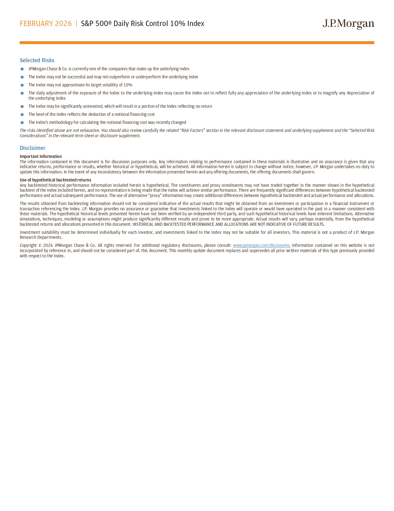 FEBRUARY 2026 | S&P 500® Daily Risk Control 10% Index Selected Risks JPMorgan Chase & Co. is currently one of the companies that make up the underlying index The Index may not be successful and may not outperform or underperform the underlying index The Index may not approximate its target volatility of 10% The daily adjustment of the exposure of the Index to the underlying index may cause the Index not to reflect fully any appreciation of the underlying index or to magnify any depreciation of the underlying index The Index may be significantly uninvested, which will result in a portion of the Index reflecting no return The level of the Index reflects the deduction of a notional financing cost The Index’s methodology for calculating the notional financing cost was recently changed The risks identified above are not exhaustive. You should also review carefully the related “Risk Factors” section in the relevant disclosure statement and underlying supplement and the “Selected Risk Considerations” in the relevant term sheet or disclosure supplement. Disclaimer Important Information The information contained in this document is for discussion purposes only . Any information relating to performance contained in these materials is illustrative and no assurance is given that any indicative returns, performance or results, whether historical or hypothetical, will be achieved . All information herein is subject to change without notice, however, J . P . Morgan undertakes no duty to update this information . In the event of any inconsistency between the information presented herein and any otfering documents, the otfering documents shall govern . Use of hypothetical backtested returns Any backtested historical performance information included herein is hypothetical . The constituents and proxy constituents may not have traded together in the manner shown in the hypothetical backtest of the Index included herein, and no representation is being made that the Index will achieve similar performance . There are frequently significant ditferences between hypothetical backtested performance and actual subsequent performance . The use of alternative “proxy” information may create additional ditferences between hypothetical backtested and actual performance and allocations . The results obtained from backtesting information should not be considered indicative of the actual results that might be obtained from an investment or participation in a financial instrument or transaction referencing the Index . J . P . Morgan provides no assurance or guarantee that investments linked to the Index will operate or would have operated in the past in a manner consistent with these materials . The hypothetical historical levels presented herein have not been verified by an independent third party, and such hypothetical historical levels have inherent limitations . Alternative simulations, techniques, modeling or assumptions might produce significantly ditferent results and prove to be more appropriate . Actual results will vary, perhaps materially, from the hypothetical backtested returns and allocations presented in this document . HISTORICAL AND BACKTESTED PERFORMANCE AND ALLOCATIONS ARE NOT INDICATIVE OF FUTURE RESULTS . Investment suitability must be determined individually for each investor, and investments linked to the Index may not be suitable for all investors . This material is not a product of J . P . Morgan Research Departments . Copyright © 2026 JPMorgan Chase & Co . All rights reserved . For additional regulatory disclosures, please consult : www . jpmorgan . com/disclosures . Information contained on this website is not incorporated by reference in, and should not be considered part of, this document . This monthly update document replaces and supersedes all prior written materials of this type previously provided with respect to the Index .
