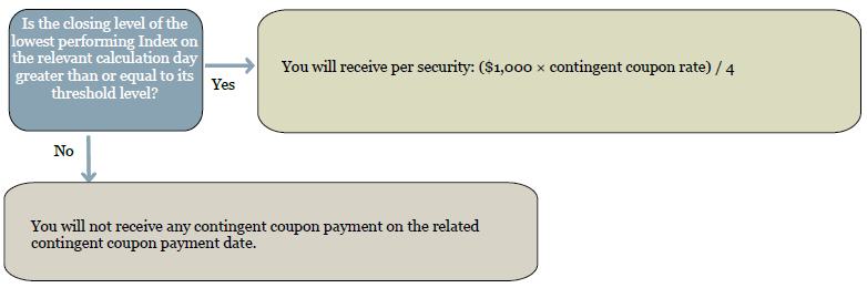 On each contingent coupon payment date, you will receive a contingent coupon payment at a per annum rate equal to the contingent coupon rate if, and only if, the closing level of the lowest performing Index on the related calculation day is greater than or equal to its threshold level. Each “contingent coupon payment,” if any, will be calculated per security as follows: ($1,000 × contingent coupon rate) / 4. Notwithstanding anything to the contrary in the accompanying product supplement, any contingent coupon payment will be rounded to the nearest cent, with one-half cent rounded upward. If the closing level of the lowest performing Index on any calculation day is less than its threshold level, you will not receive any contingent coupon payment on the related contingent coupon payment date. If the closing level of the lowest performing Index is less than its threshold level on all calculation days, you will not receive any contingent coupon payments over the term of the securities. |