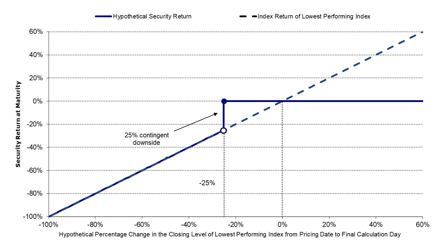 If the securities are not automatically called prior to the stated maturity date, you will be entitled to receive on the stated maturity date a cash payment per security in U.S. dollars equal to the maturity payment amount (in addition to the final contingent coupon payment, if any). The “maturity payment amount” per security will equal: · if the ending level of the lowest performing Index on the final calculation day is greater than or equal to its threshold level: $1,000; or · if the ending level of the lowest performing Index on the final calculation day is less than its threshold level: $1,000 + ($1,000 × index return of the lowest performing Index on the final calculation day) If the securities are not automatically called prior to maturity and the ending level of the lowest performing Index on the final calculation day is less than its threshold level, you will lose more than 25%, and possibly all, of the principal amount of your securities at maturity. Any return on the securities will be limited to the sum of your contingent coupon payments, if any. You will not participate in any appreciation of any Index, but you will have full downside exposure to the lowest performing Index on the final calculation day if its ending level is less than its threshold level. |
