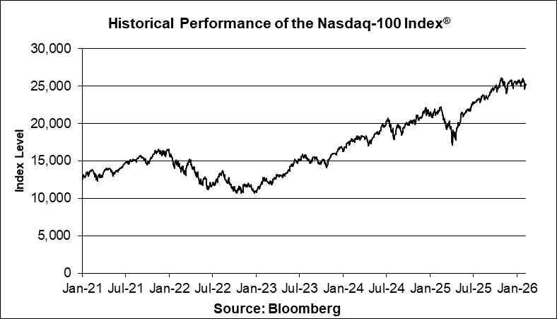The following graph sets forth the historical performance of the Nasdaq-100 Index® based on the daily historical closing levels of the Nasdaq-100 Index® from January 4, 2021 through February 9, 2026. The closing level of the Nasdaq-100 Index® on February 9, 2026 was 25,268.14. We obtained the closing levels above and below from the Bloomberg Professional® service (“Bloomberg”), without independent verification.