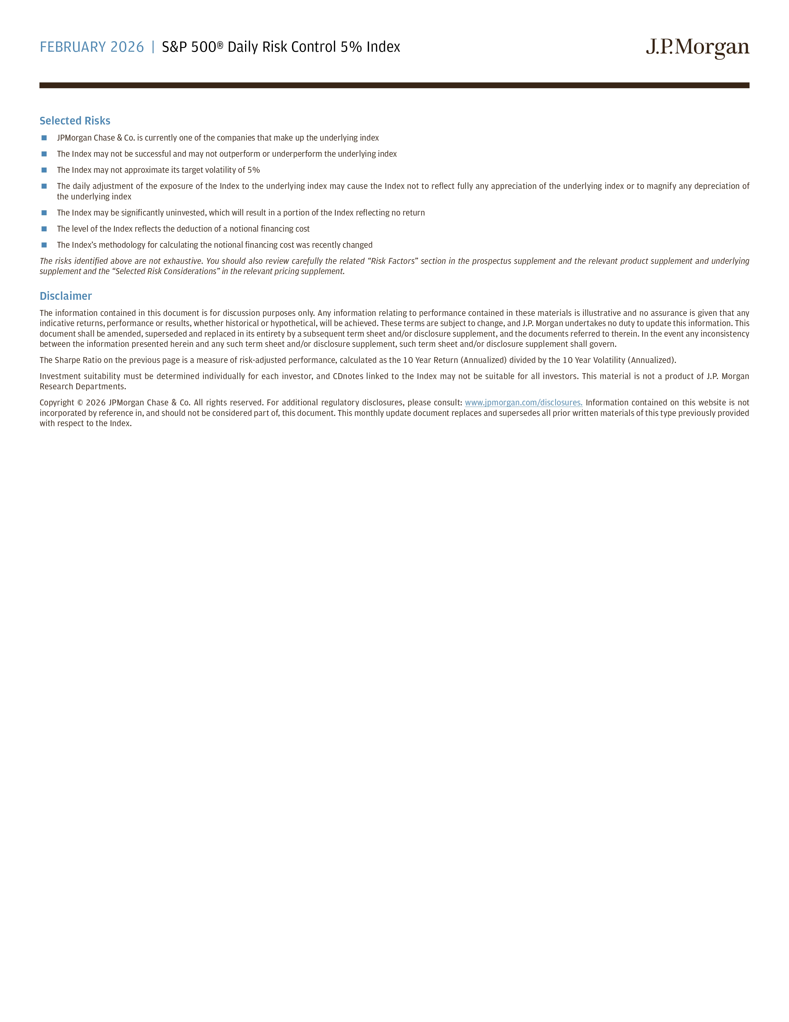 FEBRUARY 2026 | S&P 500® Daily Risk Control 5% Index Selected Risks JPMorgan Chase & Co. is currently one of the companies that make up the underlying index The Index may not be successful and may not outperform or underperform the underlying index The Index may not approximate its target volatility of 5% The daily adjustment of the exposure of the Index to the underlying index may cause the Index not to reflect fully any appreciation of the underlying index or to magnify any depreciation of the underlying index The Index may be significantly uninvested, which will result in a portion of the Index reflecting no return The level of the Index reflects the deduction of a notional financing cost The Index’s methodology for calculating the notional financing cost was recently changed The risks identified above are not exhaustive. You should also review carefully the related “Risk Factors” section in the prospectus supplement and the relevant product supplement and underlying supplement and the “Selected Risk Considerations” in the relevant pricing supplement. Disclaimer The information contained in this document is for discussion purposes only . Any information relating to performance contained in these materials is illustrative and no assurance is given that any indicative returns, performance or results, whether historical or hypothetical, will be achieved . These terms are subject to change, and J . P . Morgan undertakes no duty to update this information . This document shall be amended, superseded and replaced in its entirety by a subsequent term sheet and/or disclosure supplement, and the documents referred to therein . In the event any inconsistency between the information presented herein and any such term sheet and/or disclosure supplement, such term sheet and/or disclosure supplement shall govern . The Sharpe Ratio on the previous page is a measure of risk - adjusted performance, calculated as the 10 Year Return (Annualized) divided by the 10 Year Volatility (Annualized) . Investment suitability must be determined individually for each investor, and CDnotes linked to the Index may not be suitable for all investors . This material is not a product of J . P . Morgan Research Departments . Copyright © 2026 JPMorgan Chase & Co . All rights reserved . For additional regulatory disclosures, please consult : www . jpmorgan . com/disclosures . Information contained on this website is not incorporated by reference in, and should not be considered part of, this document . This monthly update document replaces and supersedes all prior written materials of this type previously provided with respect to the Index .